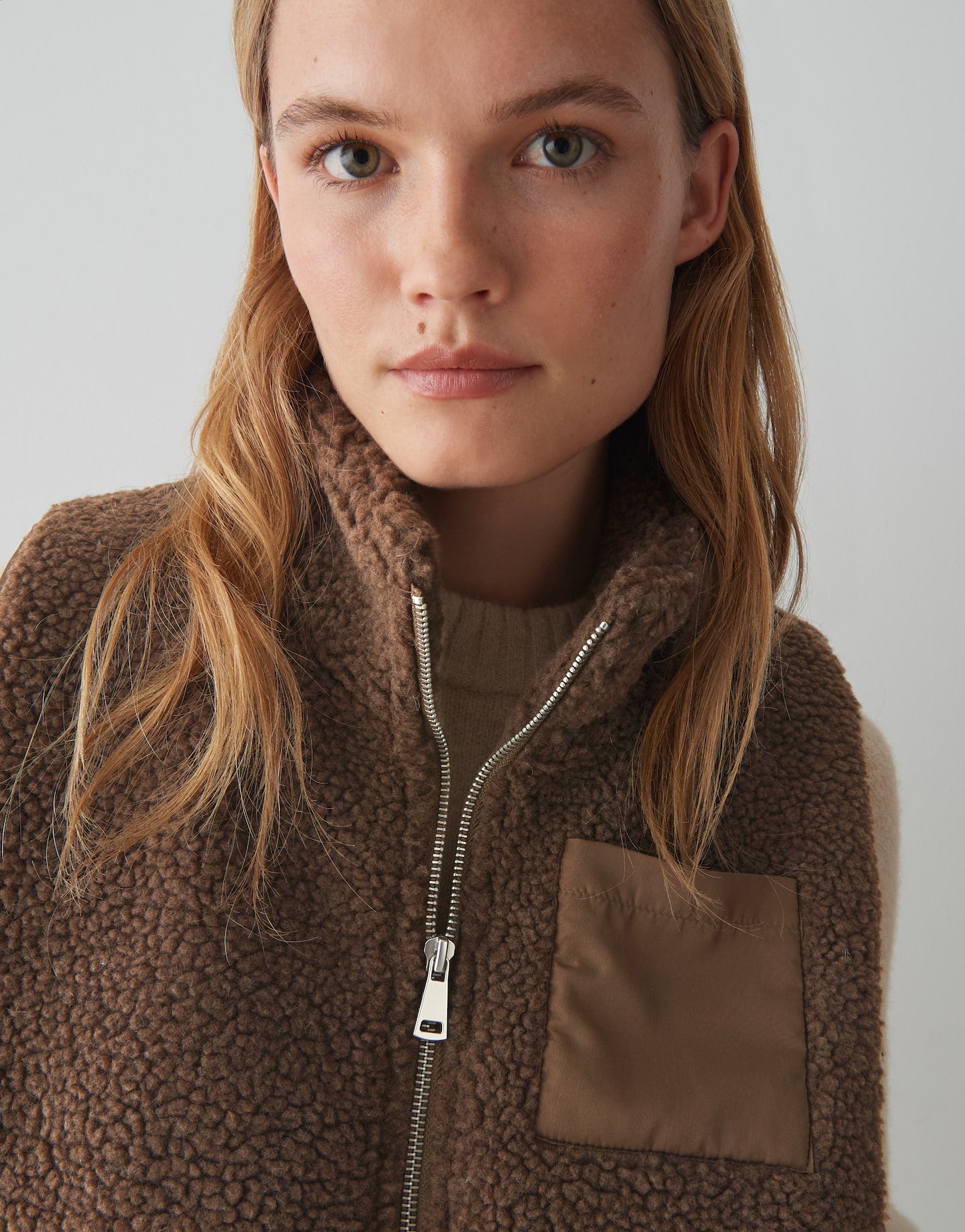 one size, Boxy Silhouette, verkürzte Länge, Stehkragen, Rückenlänge ca. 52 cm bei Größe 36, Model Größe 178 cm – trägt eine Einheitsgröße, Webware, Teddyfell, Futter: Polyester, flauschiger Griff, wärmend, leichte Wattierung, aufgesetzte Tasche, Reißverschluss, seitlicher Riegel mit Druckknopf