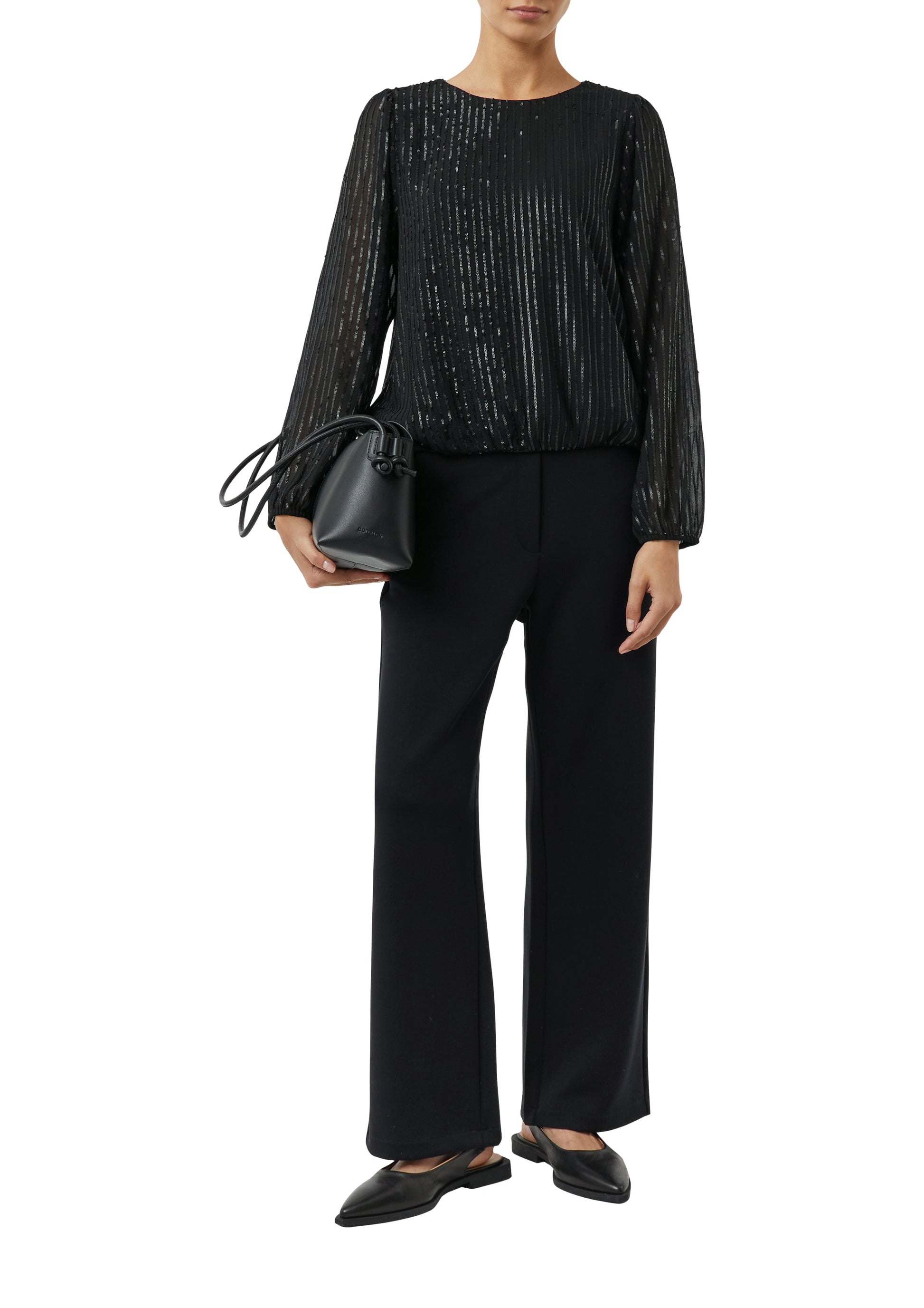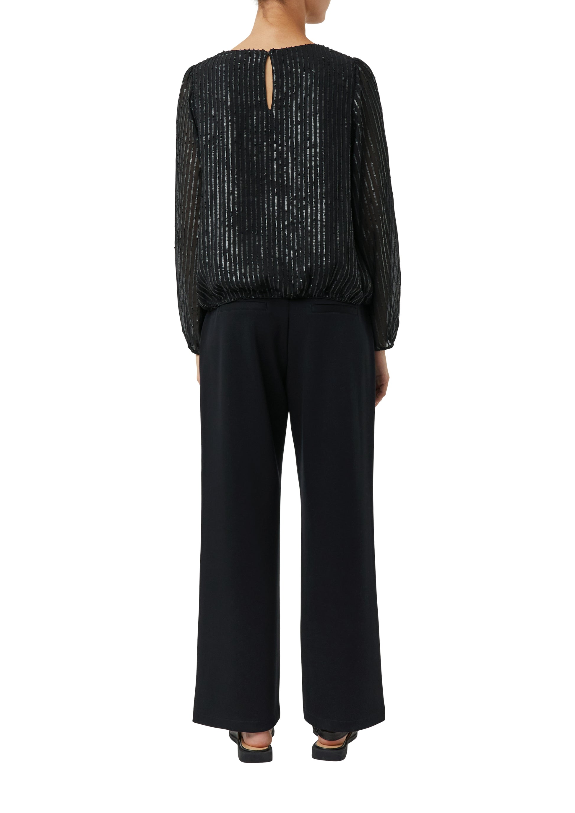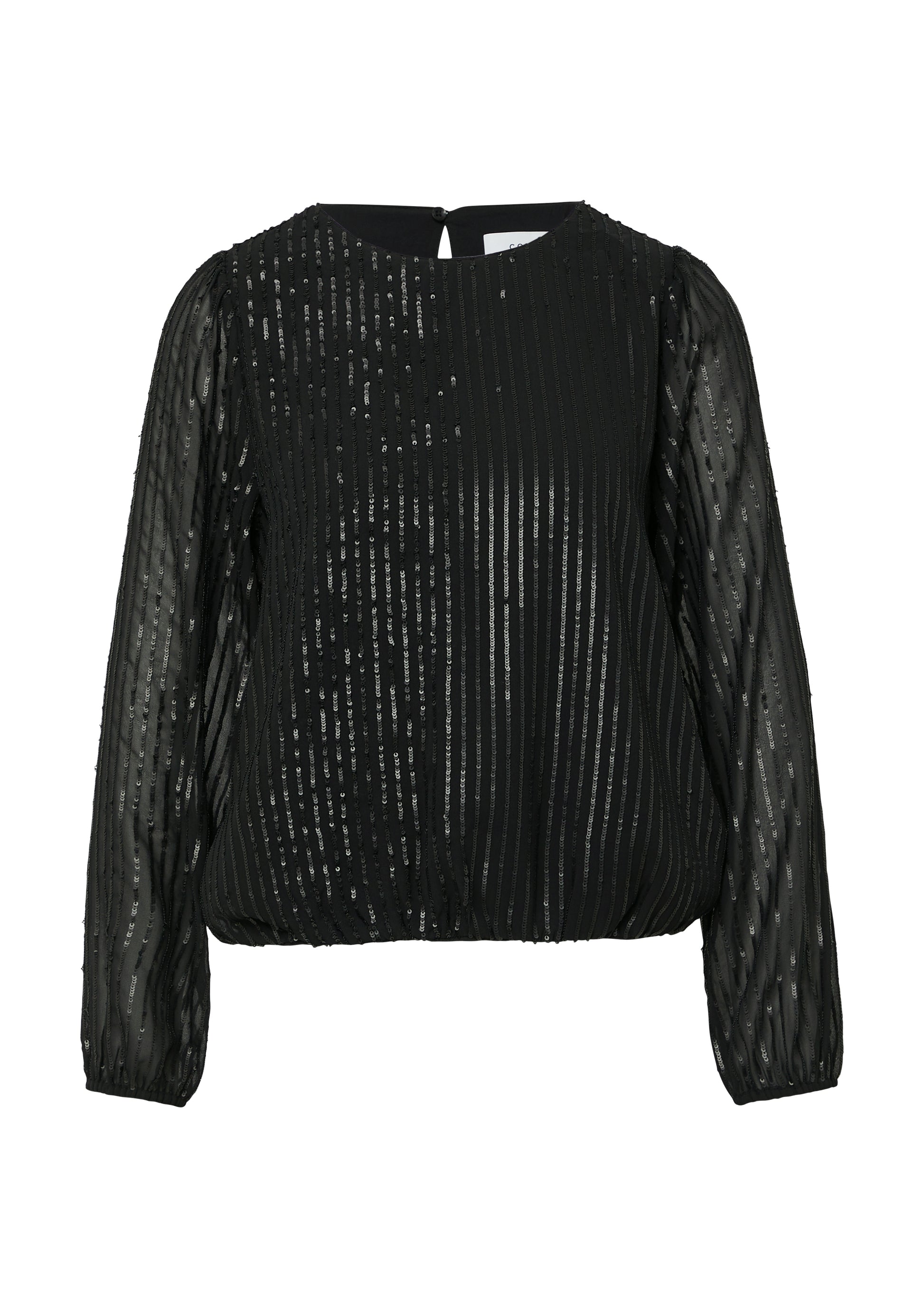 Diese langärmelige Bluse verzaubert mit edlem Paillettenbesatz und einem Rundhalsausschnitt mit Schlitz-Detail. Die elastischen Bündchen an Ärmeln und Saum sorgen für perfekten Sitz und angenehmen Tragekomfort. Ein vielseitiges Statement-Piece, das sowohl im Business-Kontext als auch bei festlichen Anlässen überzeugt. Der feminine Schnitt schmeichelt Ihrer Silhouette und setzt stilvolle Akzente.