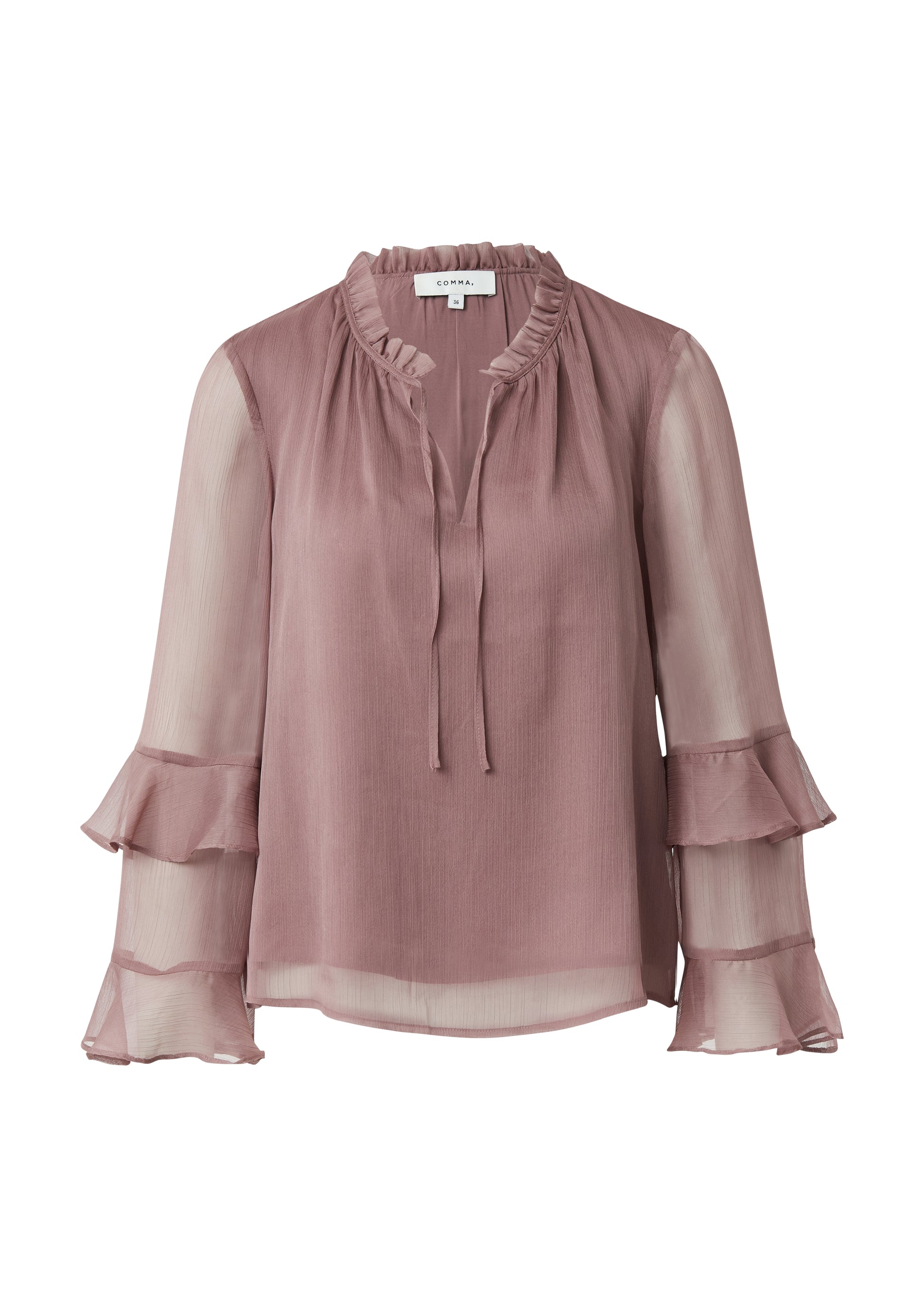 Feminine Eleganz trifft auf raffinierte Details: Diese strukturierte Chiffonbluse verzaubert mit verspielten Volants und ausdrucksstarken Trompetenärmeln. Der klassische Crew Neck und die teilweise Fütterung sorgen für perfekten Tragekomfort, während der hochwertige Crêpe-Chiffon eine edle Note verleiht. Ein vielseitiges Statement-Piece, das sowohl im Büro als auch bei festlichen Anlässen überzeugt.