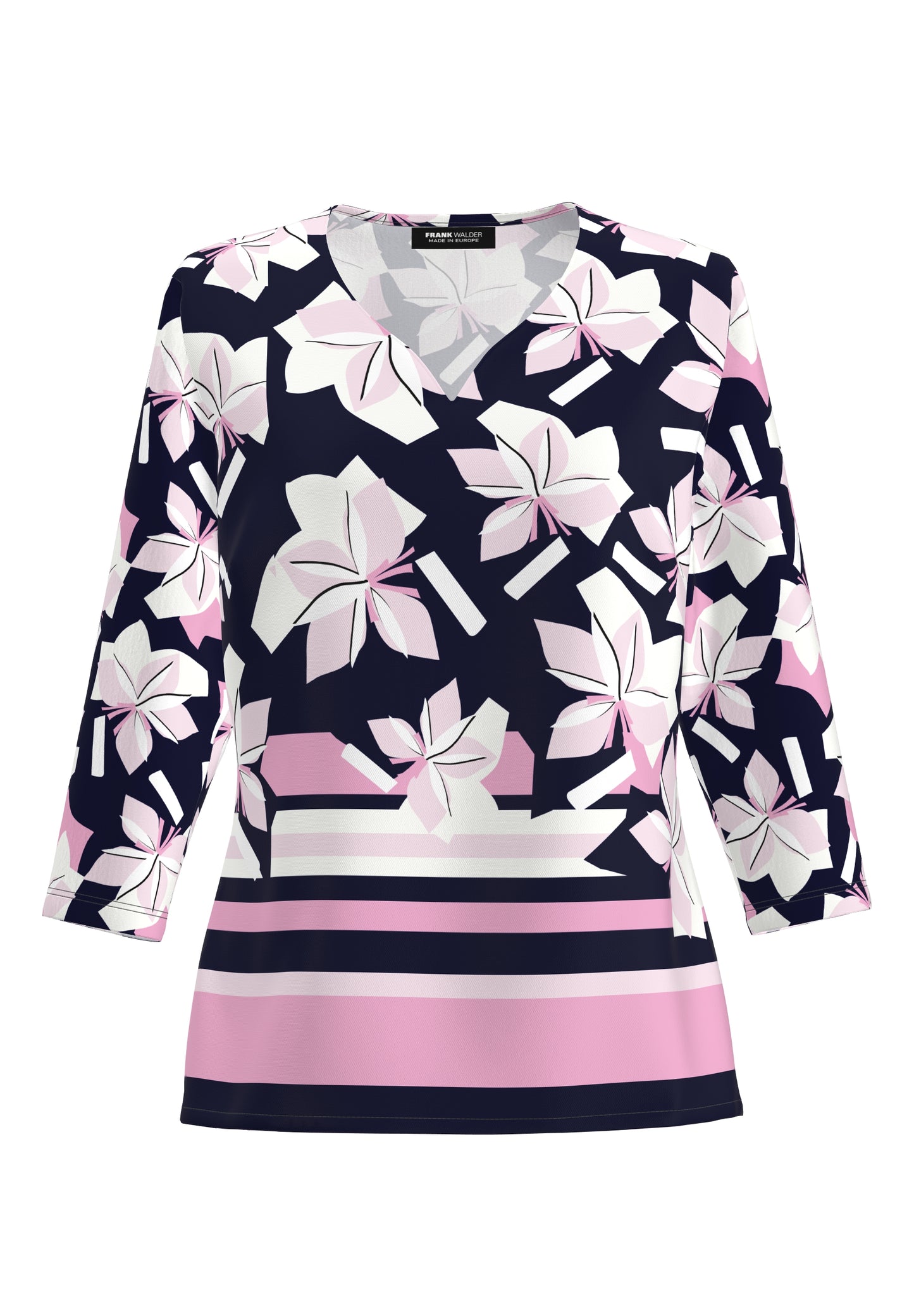 Dieses 3/4-Arm-Shirt kombiniert ein modernes florales Muster mit stilvollen Streifen und einem femininen V-Ausschnitt. Das weiche, fließende Material sorgt für angenehmen Tragekomfort und macht es perfekt für elegante Alltags- und Freizeitlooks.