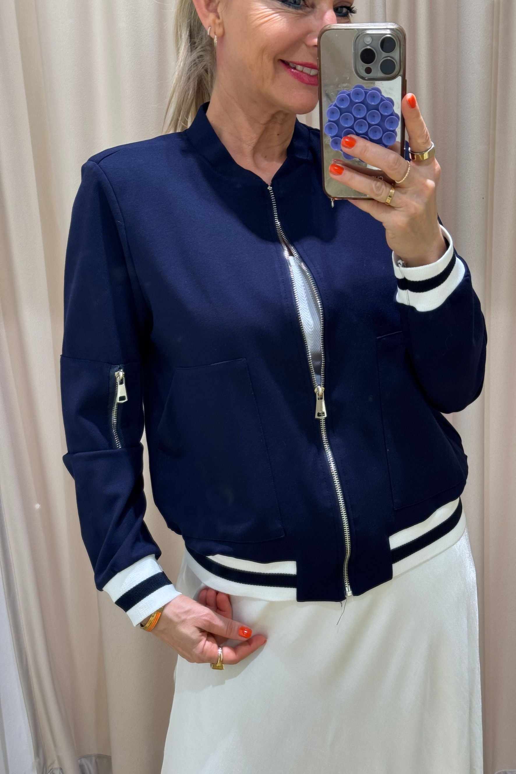 Diese sportlich-elegante Bomberjacke in klassischem Navy ist ein echtes Styling-Wunder für Übergangszeiten. Mit kontrastierenden weißen Streifen an Bündchen und Saum bringt sie einen Hauch College-Chic in jedes Outfit. Der silberfarbene Reißverschluss sowie die Zipper-Details an den Ärmeln verleihen der Jacke eine moderne Note. Gefertigt aus einem angenehm festen Materialmix, sorgt sie für eine schöne Form und hohen Tragekomfort. Ob lässig zu Jeans oder als cooler Stilbruch zu Kleid oder Rock – diese Jacke bringt Schwung in jeden Look!