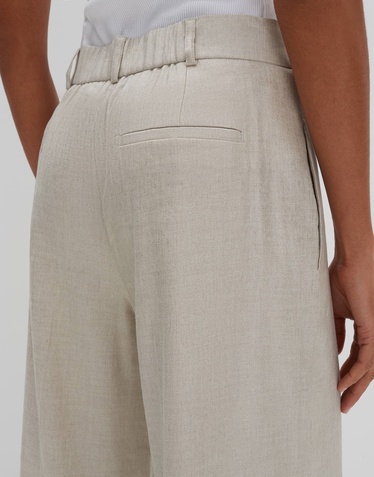 weiter, gerader Beinverlauf, Hosenbein Innenlänge ca. 62 cm in jeder Größe, Model Größe 179 cm – trägt Größe 36, Webware, natürliche Leinenstruktur, natürlicher Griff, schimmernde Beschichtung, französische Taschen, Zier-Paspeltasche hinten, verdeckter Zip-Fly, Gummibund hinten, Gürtelschlaufen