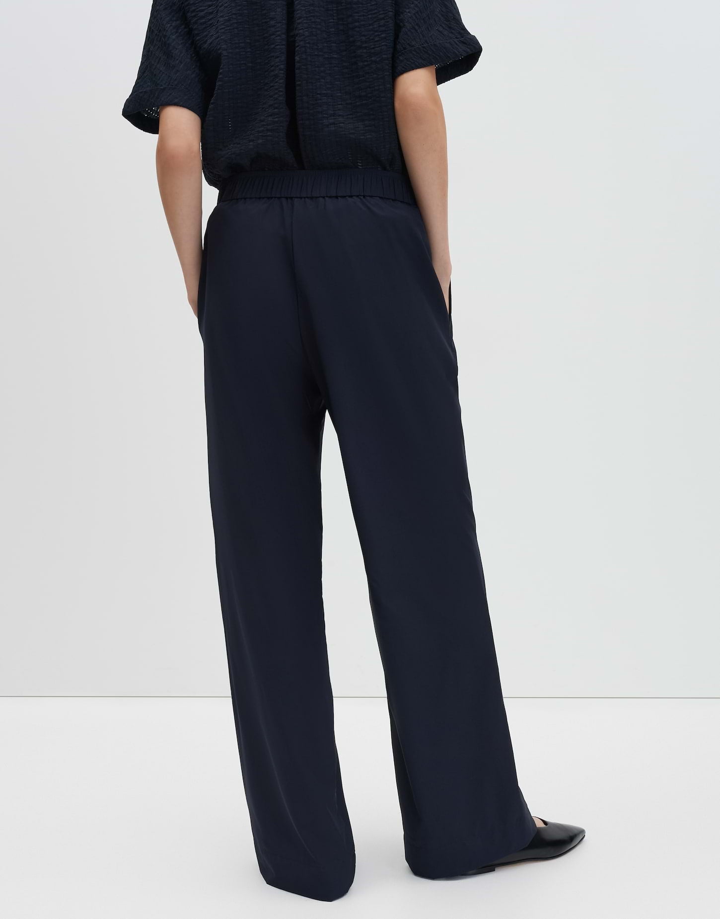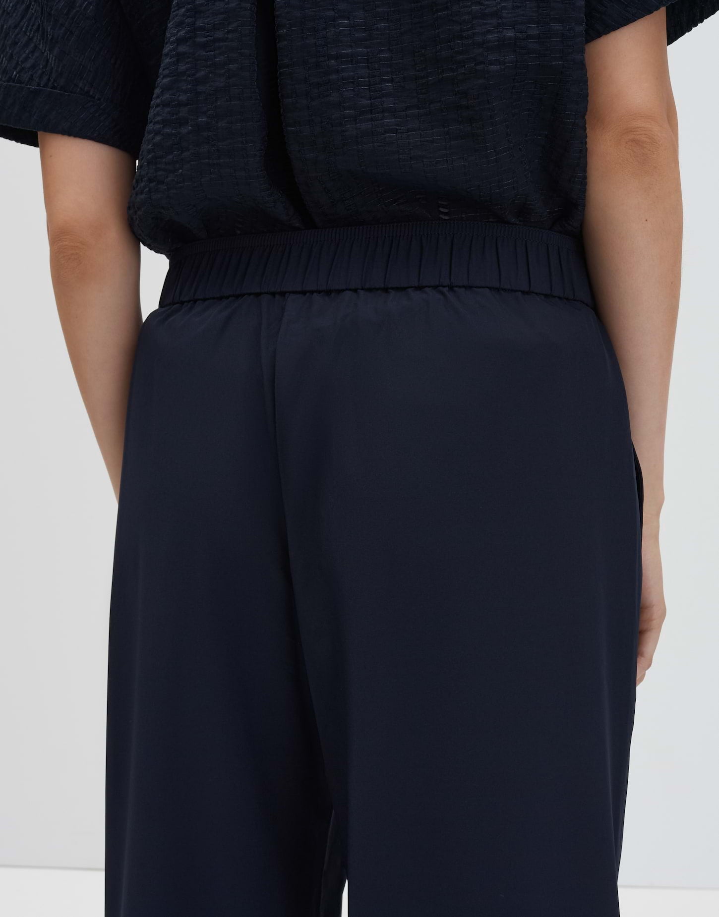 weit am Oberschenkel, weiter, gerader Beinverlauf, Hosenbein Innenlänge ca. 79 cm in jeder Größe, Model Größe 177 cm – trägt Größe 36, Webware, leichter Stoff, pflegeleicht, knitterarm, französische Taschen in den Seiten, elastischer Gummibund