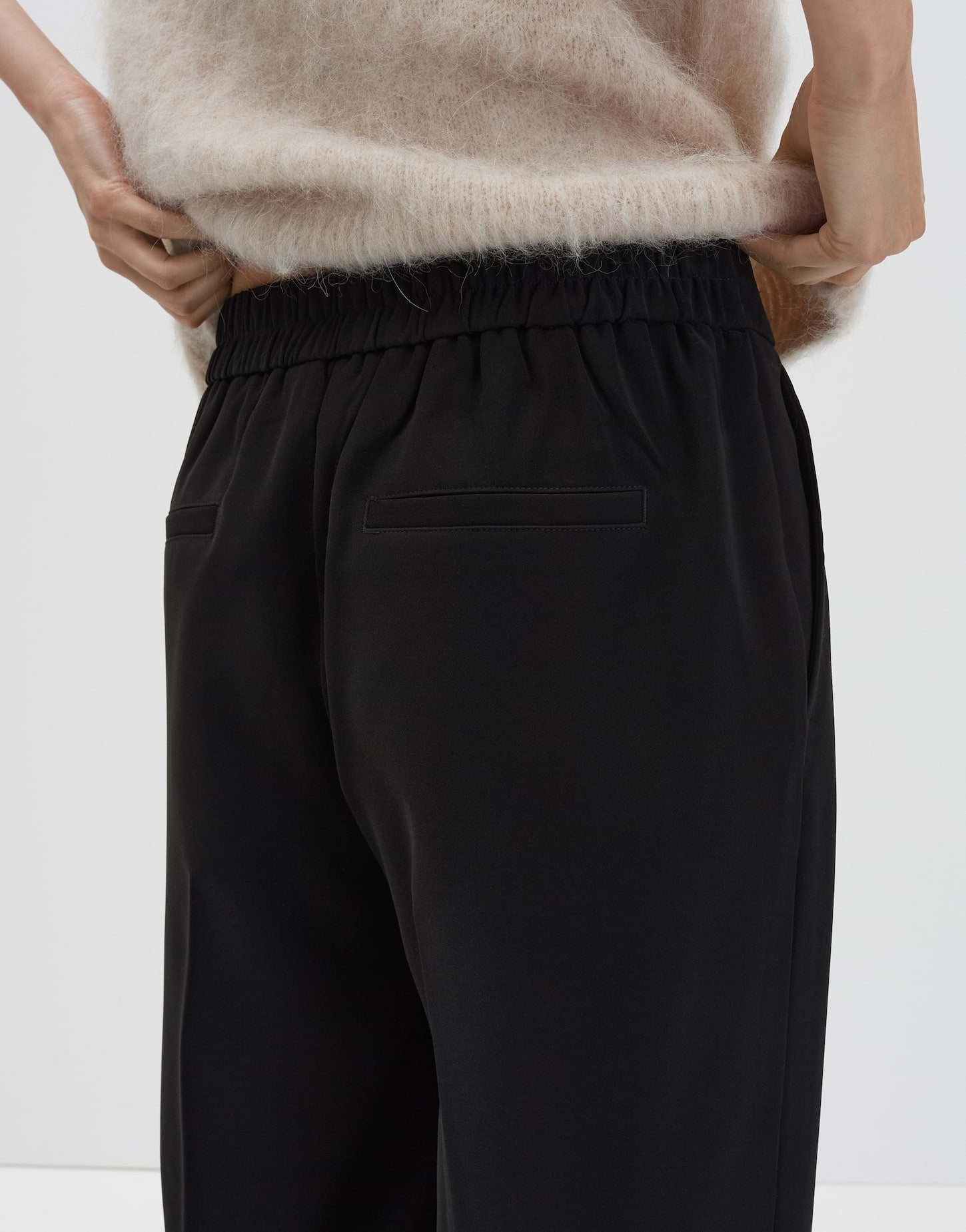 weiter, gerader Beinverlauf, Hosenbein Innenlänge ca. 80 cm in jeder Größe, Model Größe 173 cm – trägt Größe 36, Webware, glatter Griff, knitterarm, fließender Fall, französische Taschen, Zier-Paspeltaschen hinten, Bügelfalten, Gummibund hinten