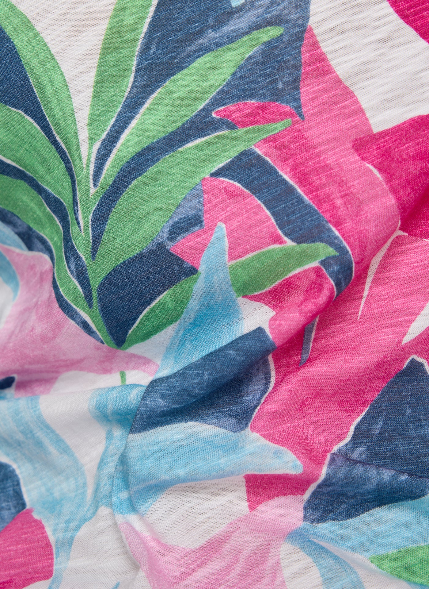 Dieses T-Shirt ist ein echtes Statement für sonnige Tage. Der farbenfrohe Allover-Print mit üppigen Blättermotiven in Pink, Blau, Grün und Weiß versprüht pure Lebensfreude. Der klassische Rundhalsausschnitt und die halblangen Ärmel machen das Shirt vielseitig kombinierbar _ ob zur Jeans, weißen Hose oder Shorts.Allover-Blätterprint in kräftigen Farben.Rundhalsausschnitt mit feiner Einfassung.Halbarm für angenehmen Tragekomfort.Weicher, elastischer Jersey.Figurumspielende Passform.