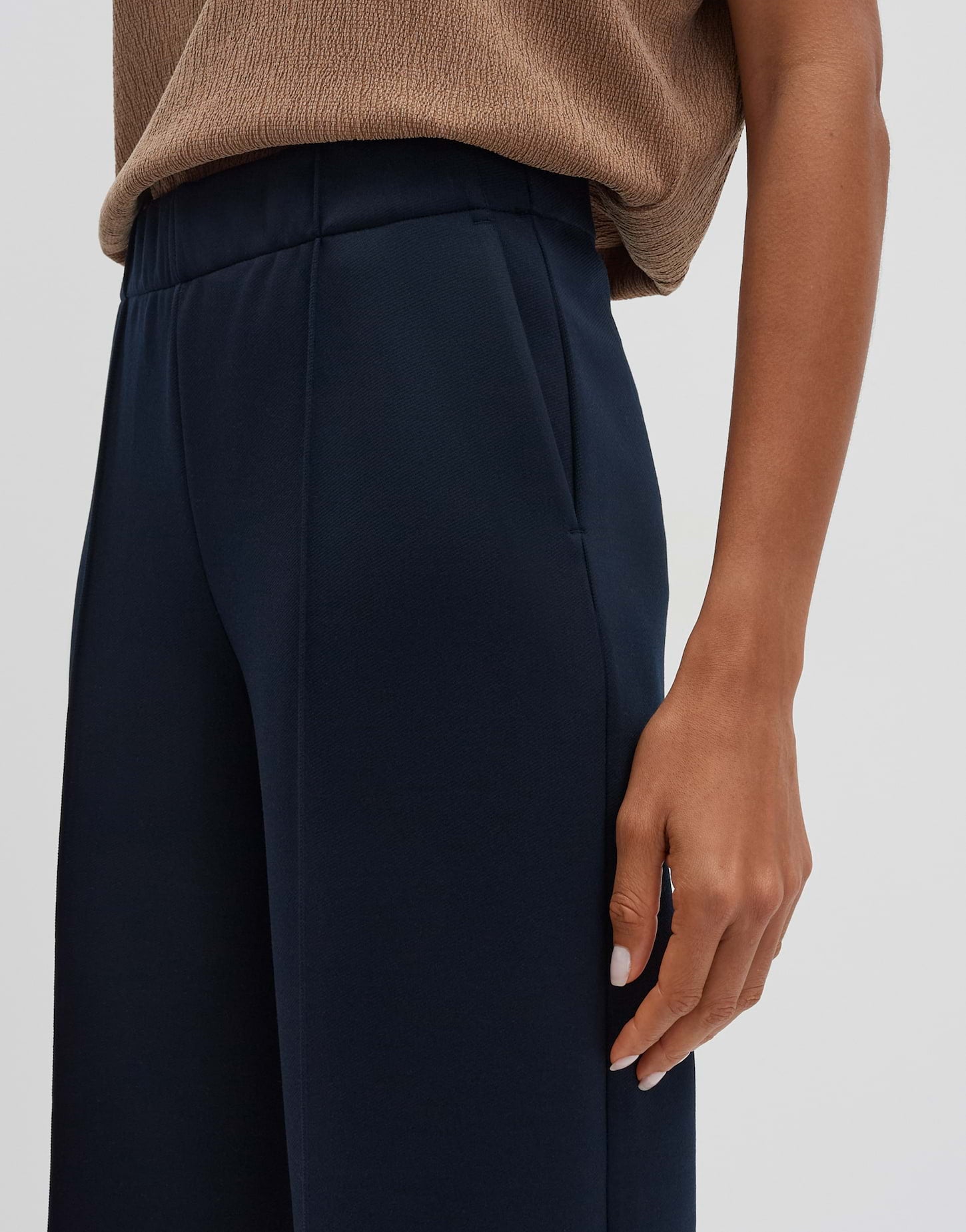 weiter, gerader Beinverlauf, Hosenbein Innenlänge ca. 63 cm in jeder Größe, Model Größe 179 cm – trägt Größe 36, Sweatware, dezente Twillstruktur, weicher Griff, leicht elastischer Stoff, knitterarm, französische Taschen, Zier-Paspeltasche hinten, Biese vorne, Bügelfalten hinten, elastischer Gummibund, Abnäher im Bund