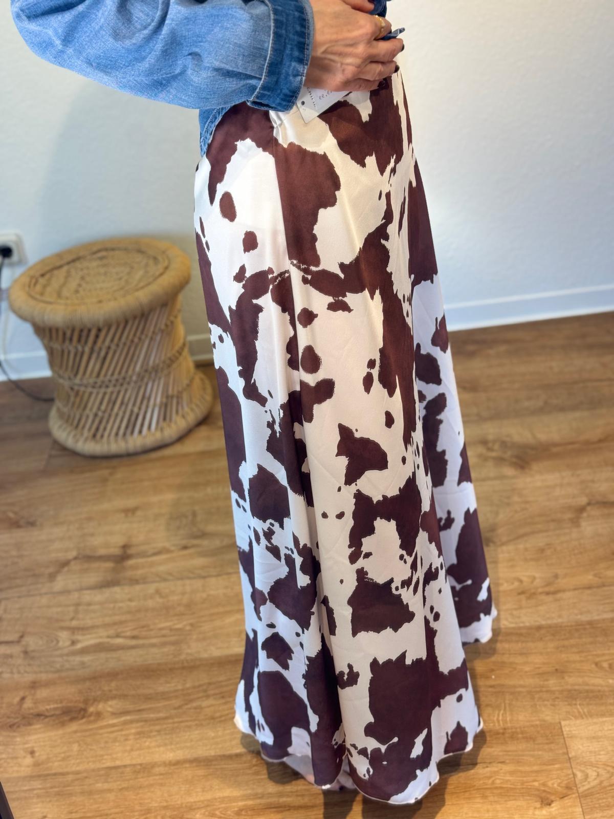 Bereit für einen wilden Sommer? Unser langer Rock im frechen Kuhmuster bringt frischen Wind in deine Garderobe! Das angesagte Kuhmuster ist nicht nur ein echter Eyecatcher, sondern schmiegt sich mit seinem fließenden Schnitt auch traumhaft an deine Silhouette. One Size - passt sich dir an, nicht umgekehrt!