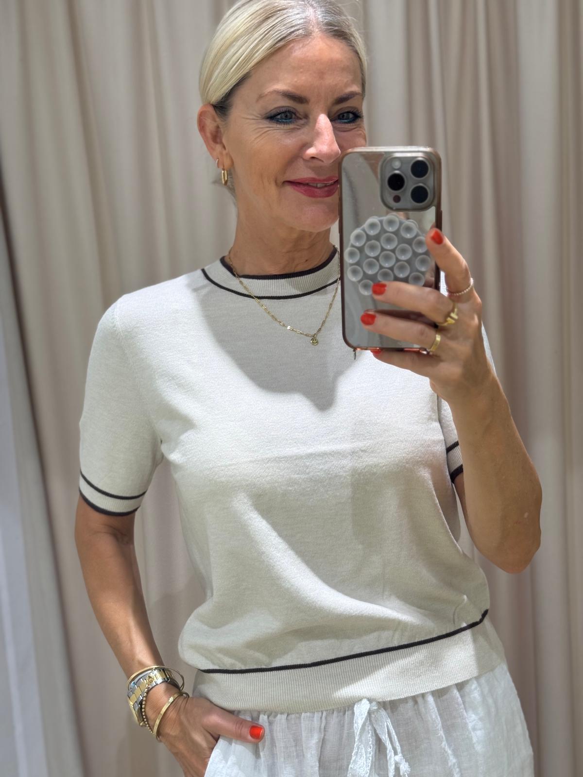 Ein cleaner Look mit liebevollem Twist: Unser kurzärmeliger Pullover " Maricela" ist ein echtes Wohlfühlteil - soft im Griff, feminin im Schnitt und mit feinem Kontrastbündchen das dem Style seine besondere Note verleiht.