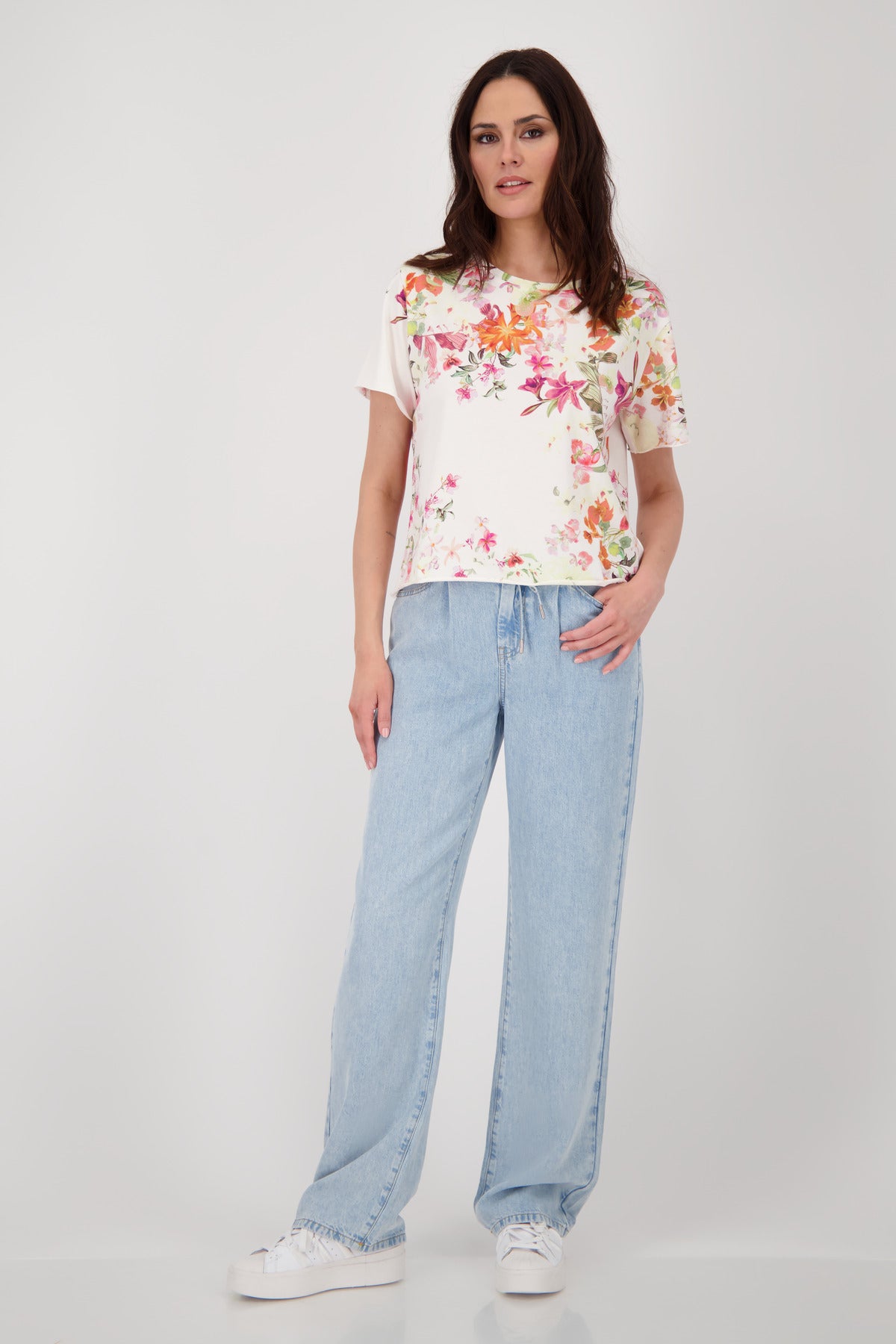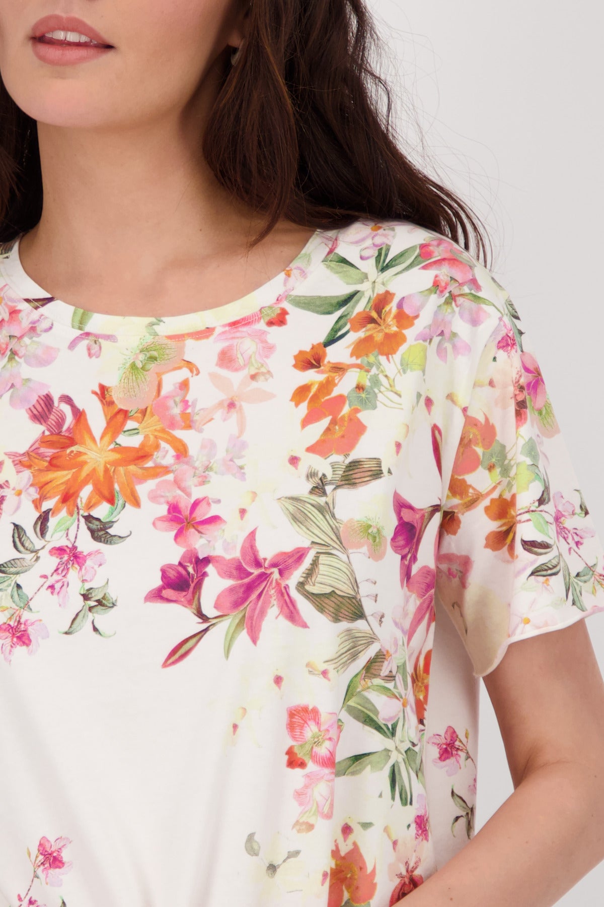 Das T-Shirt aus 100% Baumwolle begeistert mit einem frischen Blumenprint und einem angesagten, abgeschnittenen Saum.