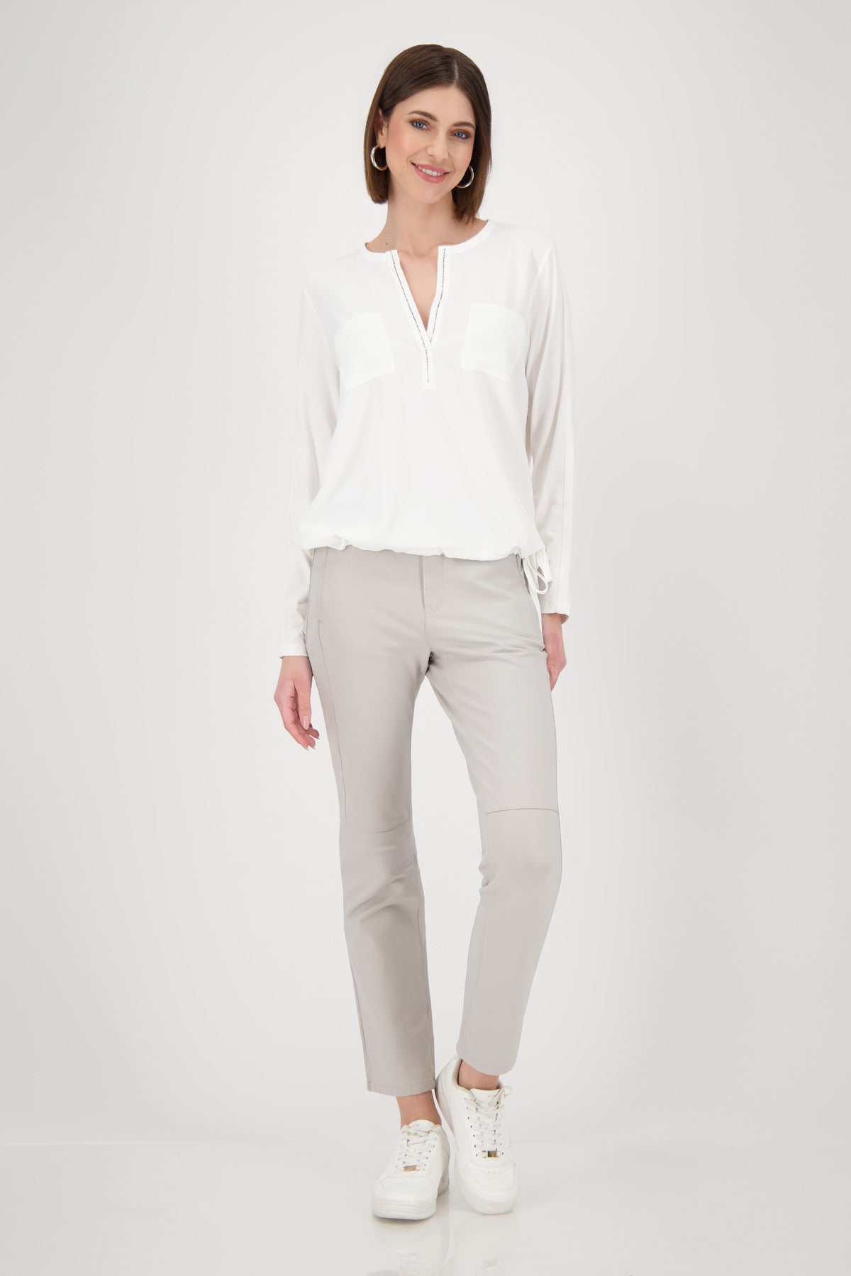 Diese Schluse aus fließender Viskose kombiniert edle Satinoptik vorn mit elastischem Tragekomfort. Der Rundhalsausschnitt mit Schlitz und funkelnden Strasssteinen verleiht dem Regular Fit eine elegante Note. Aufgesetzte Brusttaschen, ein Streifen entlang der Ärmel und der Tunnelzug mit Bindeband am Saum setzen stilvolle Akzente – perfekt für feminine Looks mit besonderem Detail.