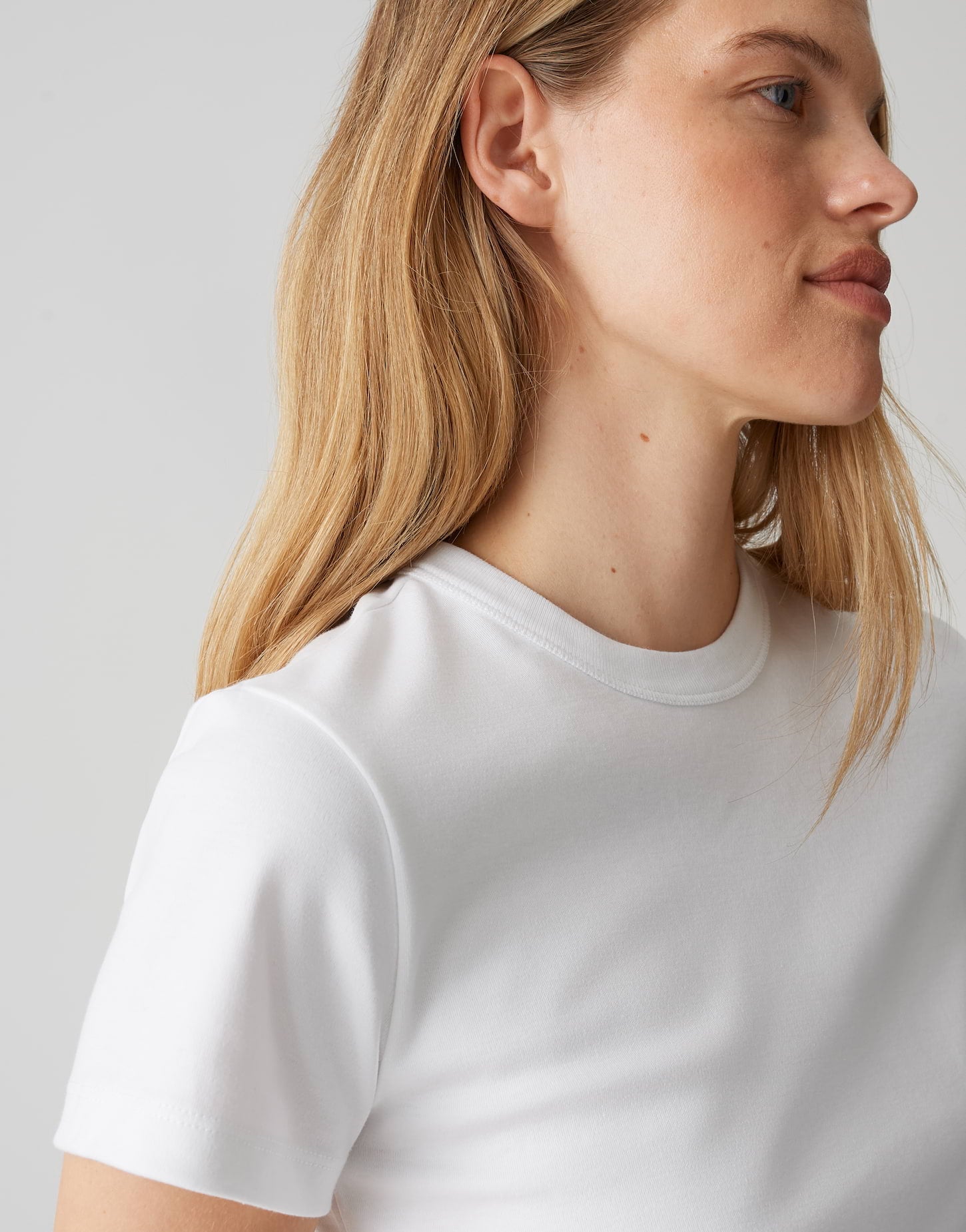 schmale Passform, gerader Schnitt, Kurzarm, Rundhalsausschnitt, Rückenlänge ca. 60 cm bei Größe 36, Model Größe 179 cm – trägt Größe 36, BCI Cotton Mix, Jersey, elastischer Stoff, weicher Griff