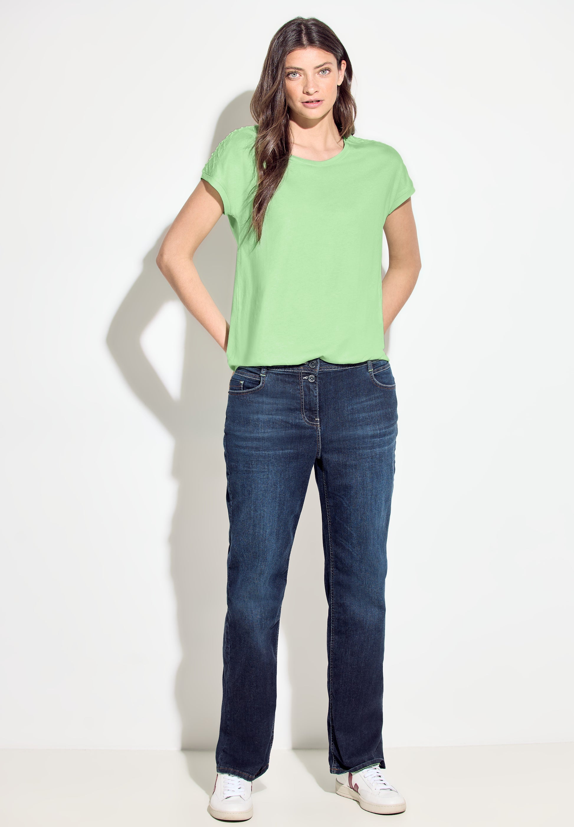 Das dekorative T-Shirt von CECIL verleiht jedem Outfit eine besondere Note mit seinem gerundeten V-Ausschnitt und dem charmanten Gummibund. Die Biesen-Dekoration an der Schulter verleiht dem Shirt eine elegante und feminine Ausstrahlung. Gefertigt aus angenehmer Jersey-Qualität bietet es einen bequemen Tragekomfort und ist ein vielseitiges Kleidungsstück für verschiedene Anlässe. Kurzarmshirt Gerundeter V-Ausschnitt Gummibund Biesen Dekoration an der Schulter Angenehme Jersey-Qualität Material: 50% Baumwolle, 50% Modal