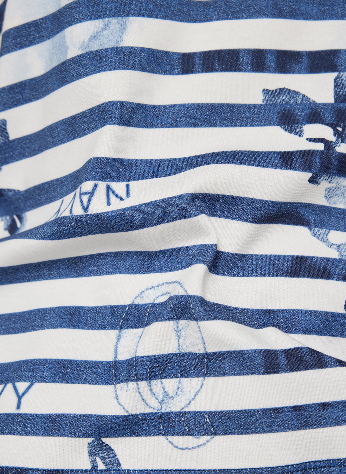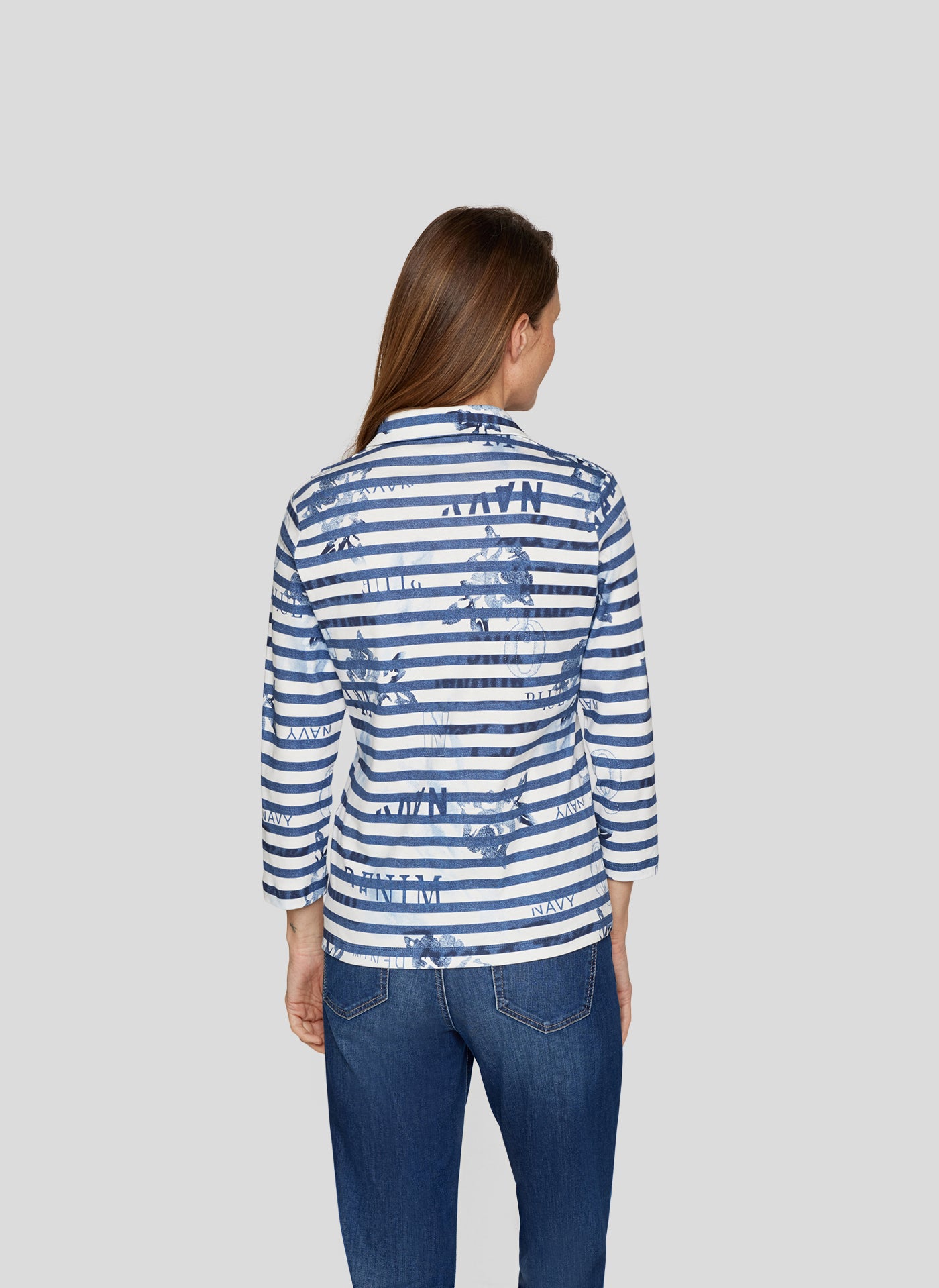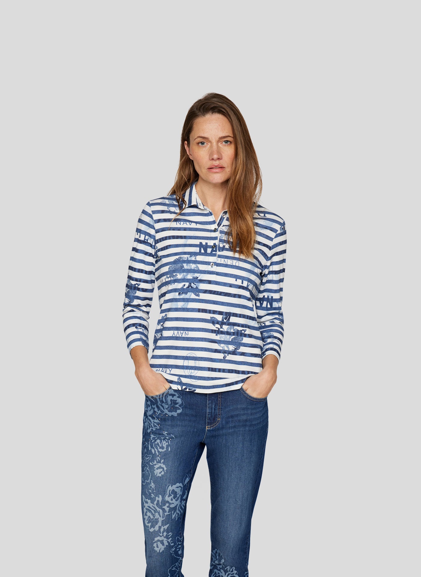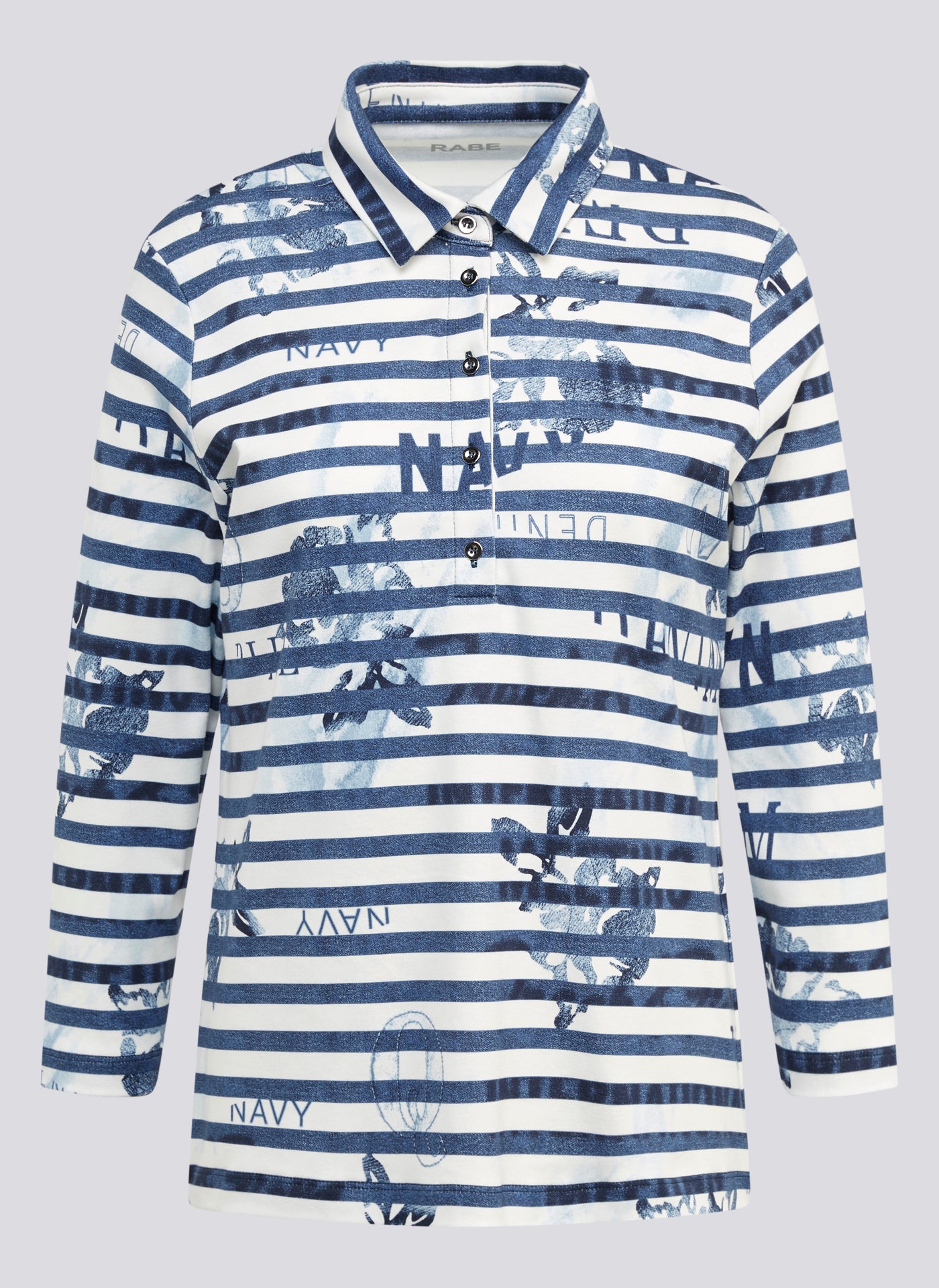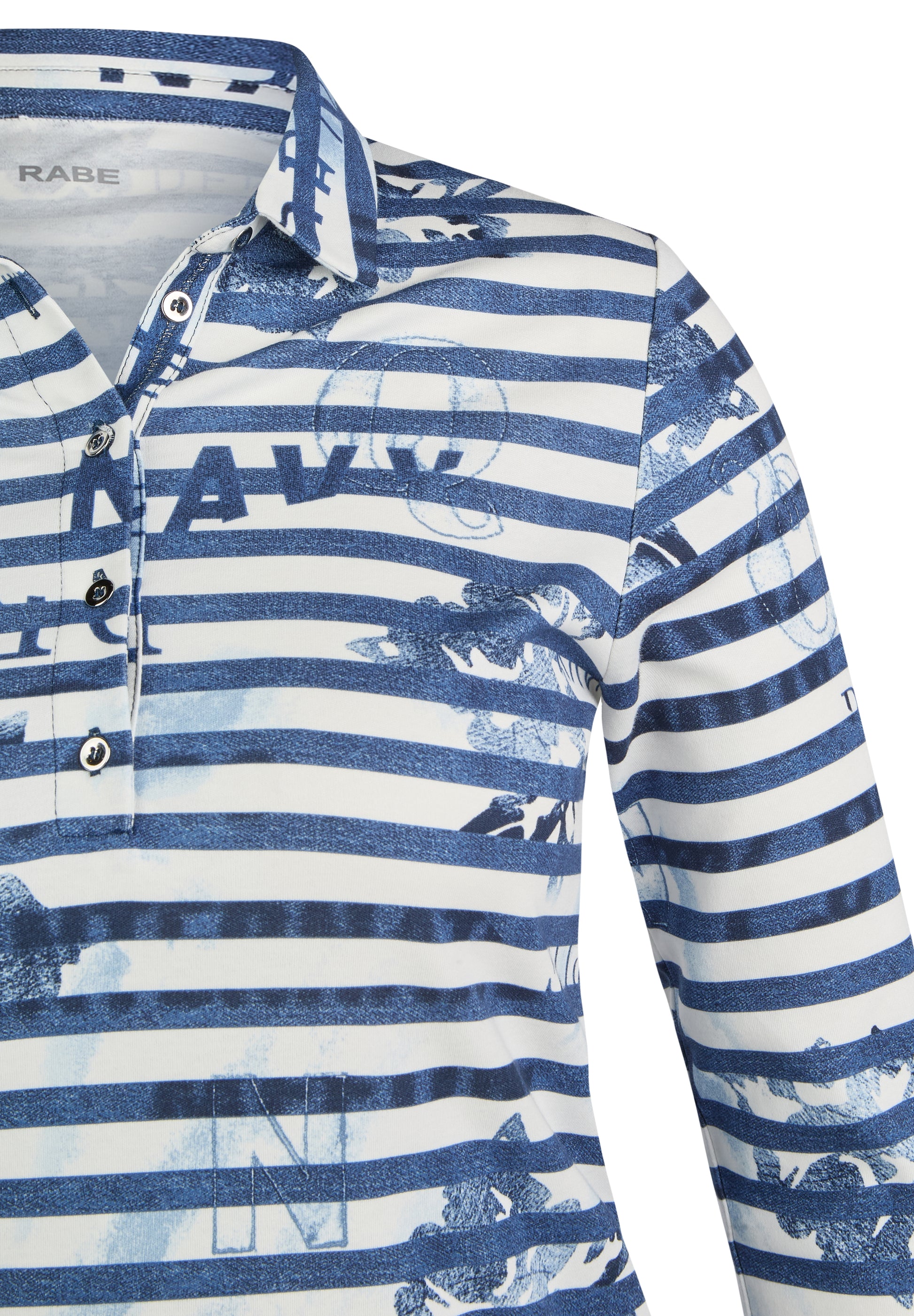 Dieses Poloshirt von RABE kombiniert den ikonischen Streifenlook mit modernen Schrift- und Blumenprints. Der Polokragen mit Knopfleiste verleiht dem Design eine zeitlose Note, während die langen Ärmel und das angenehme Material für Komfort sorgen. Maritimer Charme _ Streifen und Schrift-Prints für einen frischen Look. Polokragen mit Knopfleiste _ Klassisch und stilvoll zugleich. Hochwertige Baumwolle _ Pflegeleicht und angenehm auf der Haut. Ein vielseitiges Poloshirt für stilbewusste Freizeit-Looks mit maritimer Eleganz!