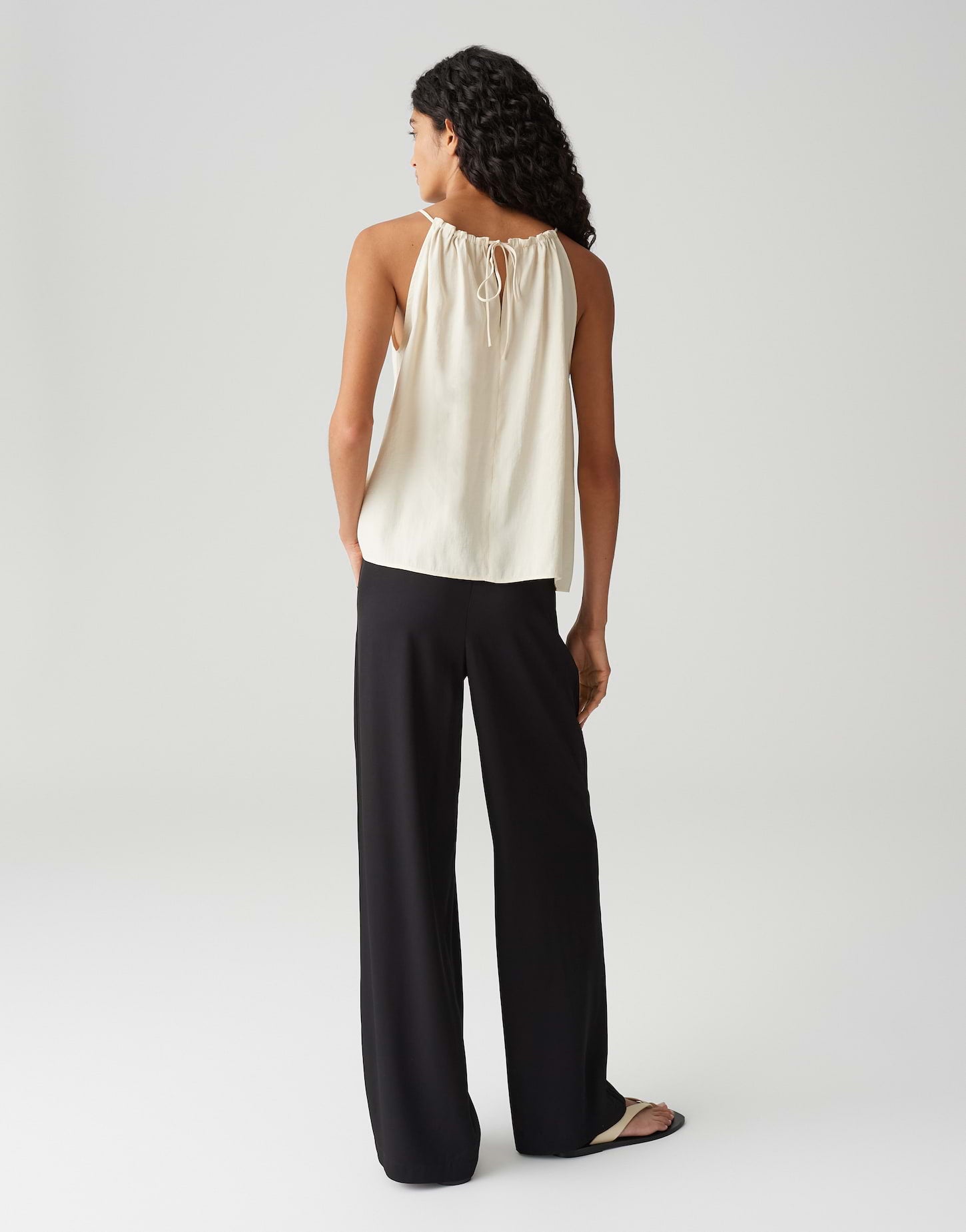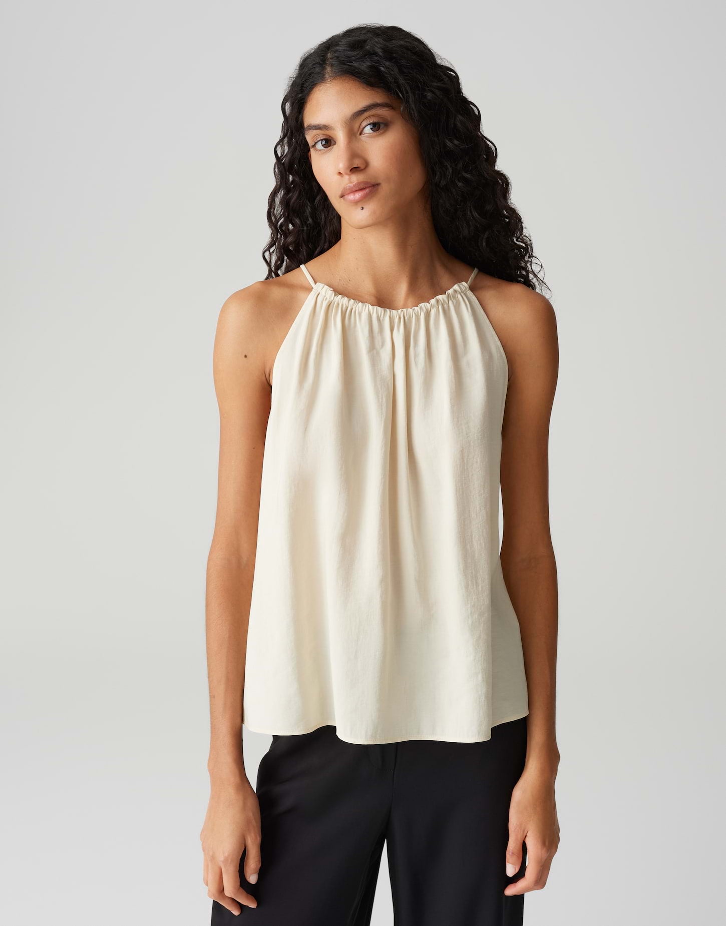 lockere Passform, ausgestellt geschnitten, normale Länge, schmale Träger, Rundhalsausschnitt, Rückenlänge ca. 51 cm bei Größe 36, Model Größe 176 cm – trägt Größe 36, Webware, dezente Struktur, weicher Griff, matter Glanz in der Oberfläche, fließender Fall, Kräuselung am Halsloch, Bindeband am hinteren Halsloch, Schlitz im Rücken