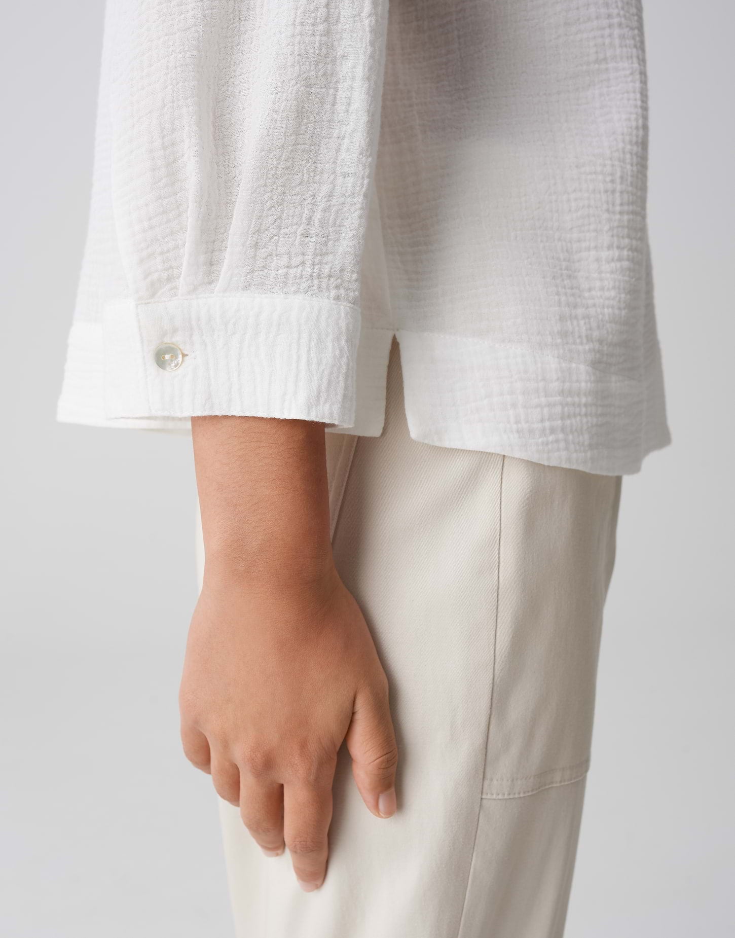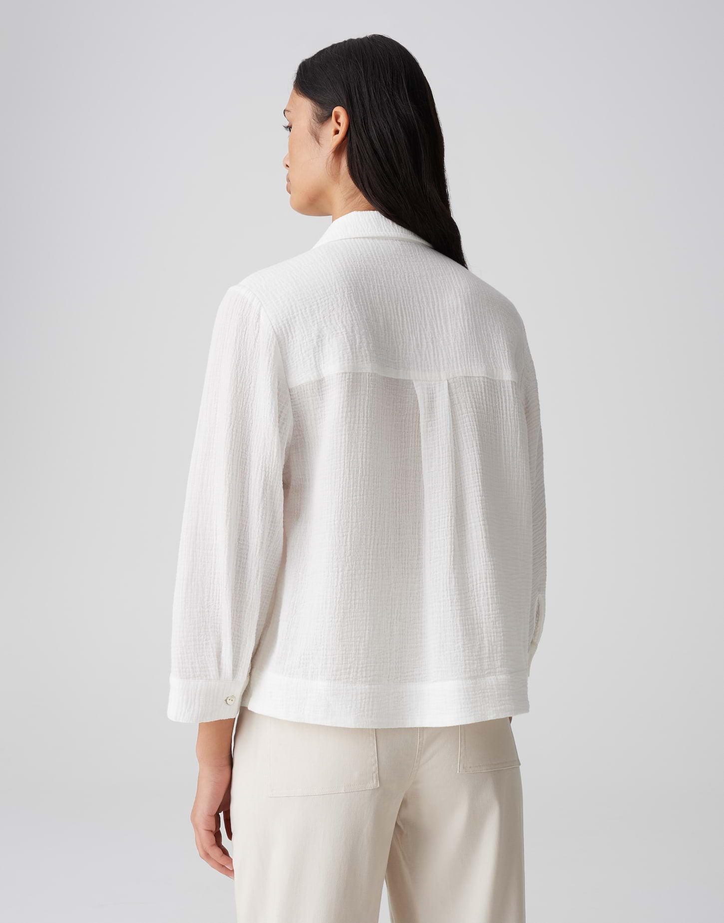 lockere Passform, leicht ausgestellt geschnitten, verkürzte Länge, 3/4 Arm, V-Ausschnitt, Umlegekragen, Rückenlänge ca. 59 cm bei Größe 36, Model Größe 177 cm – trägt Größe 36, Webware, enthält nichttextile Teile tierischen Ursprungs, organische Struktur, weicher Griff, atmungsaktiv, Rückenpasse mit Quetschfalte, Schlitze in den Seiten, Perlmuttknöpfe, leichte Transparenz im hellen Farbton