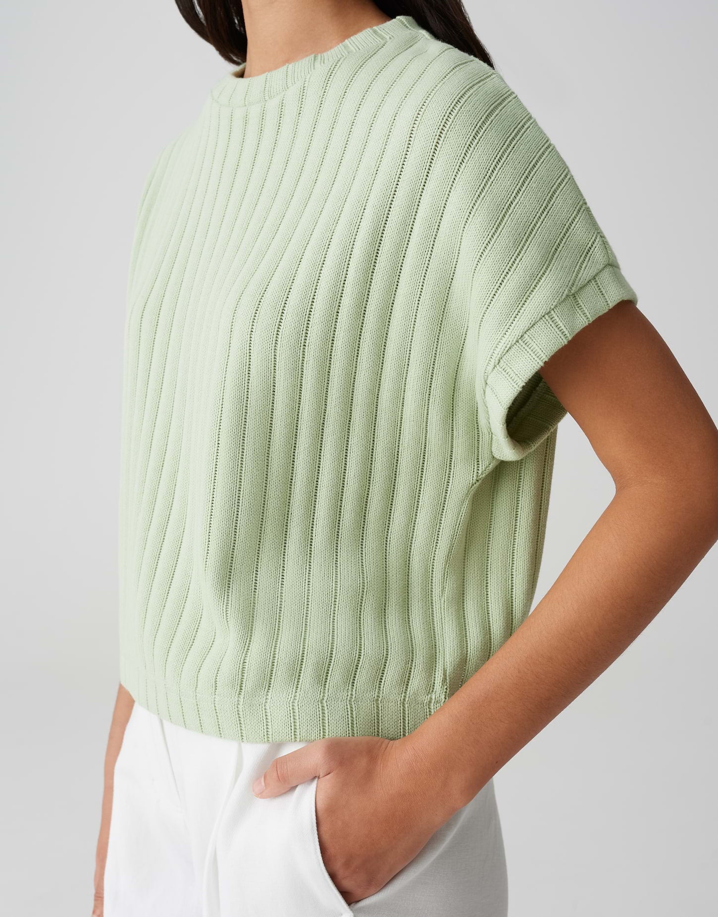 weite Passform, Boxy Fit, verkürzte Länge, überschnittener Kurzarm, Rundhalsausschnitt, Rückenlänge ca. 52 cm bei Größe 36, Model Größe 178 cm – trägt Größe 36, Sweatware, Strick Optik, formstabil, Gummibund am Saum