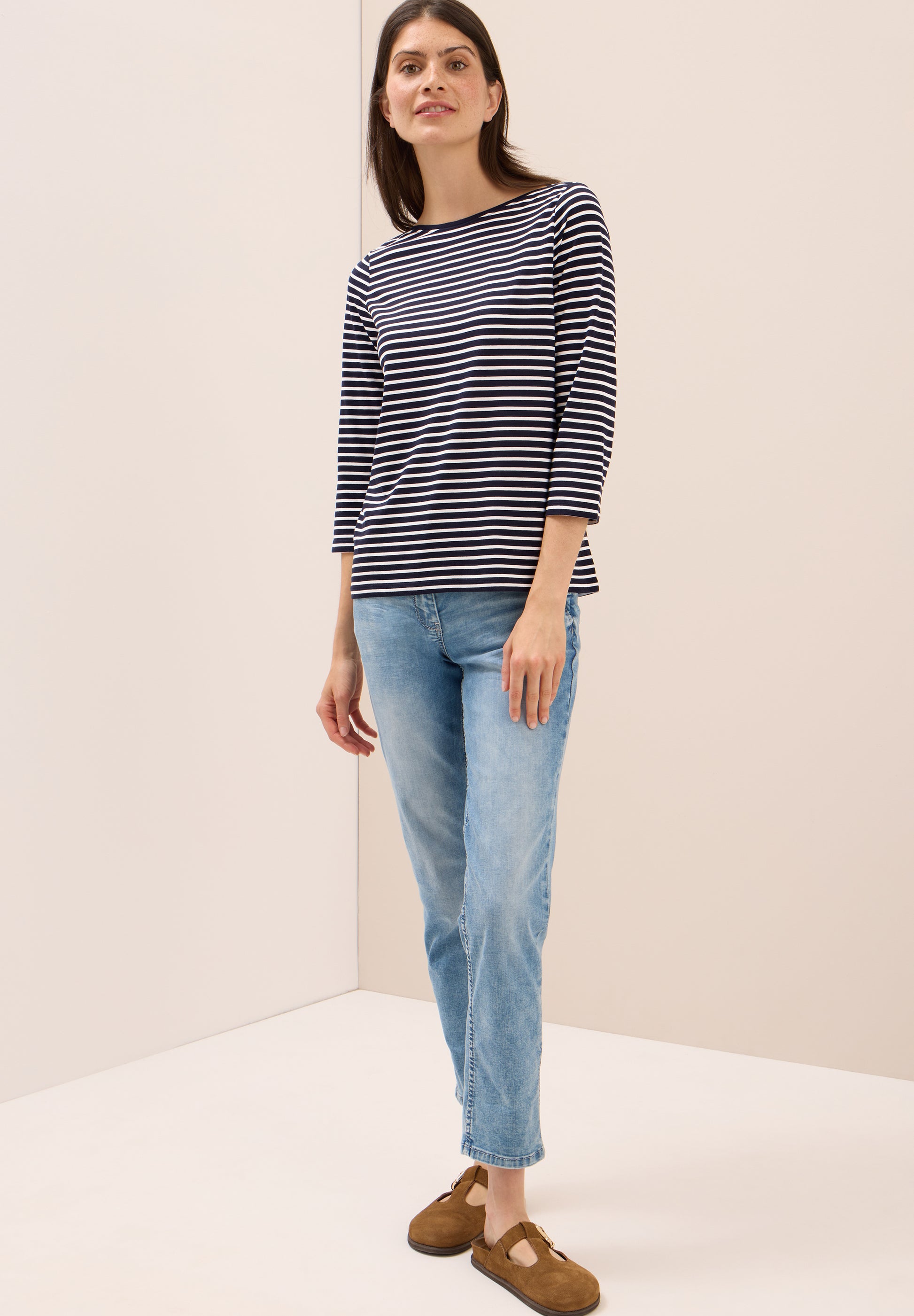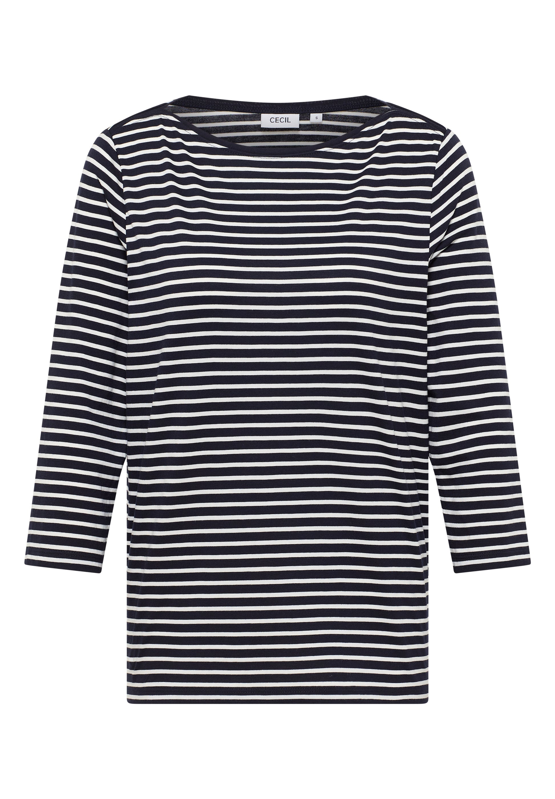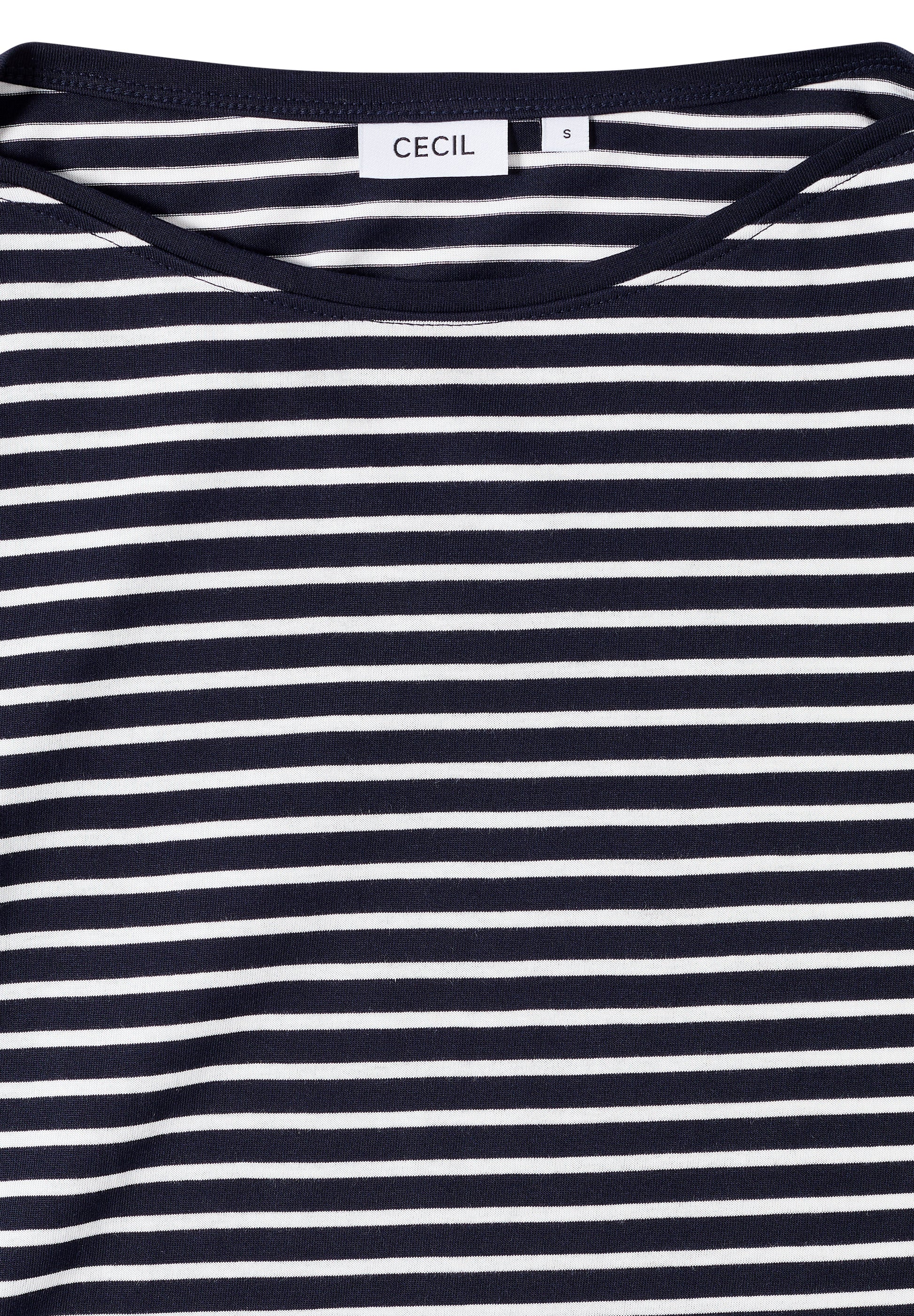 Das gestreifte Shirt von CECIL für Damen überzeugt mit seinem klassischen U-Boot-Ausschnitt und 3/4 Arm. Der softe Baumwoll-Modalmix sorgt für angenehmen Komfort, während das Streifenmuster zeitlos und vielseitig kombinierbar ist. Ideal für deinen unkomplizierten Alltagslook. Damenshirt U-Boot-Ausschnitt 3/4 Arm Streifenmuster Softer Baumwoll-Modalmix Material: 50% Baumwolle, 50% Modal