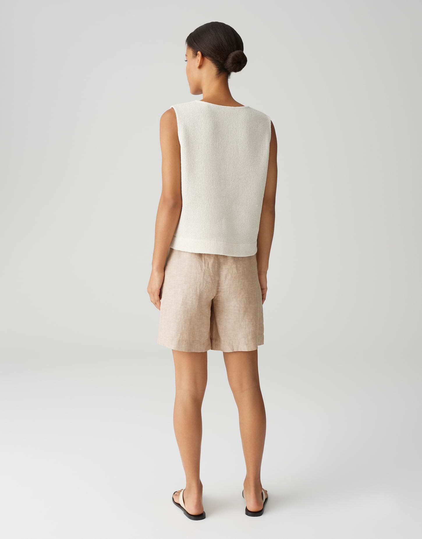lockere Passform, Boxy Silhouette, verkürzte Länge, Nullarm, V-Ausschnitt, Rückenlänge ca. 54 cm bei Größe 36, Model Größe 175 cm – trägt Größe 36, Sweatware, feine Rippstruktur, natürlicher Griff, leicht elastischer Stoff, fließender Fall, offene Teilungsnaht vorn, mit kleinen Riegeln verschlossen