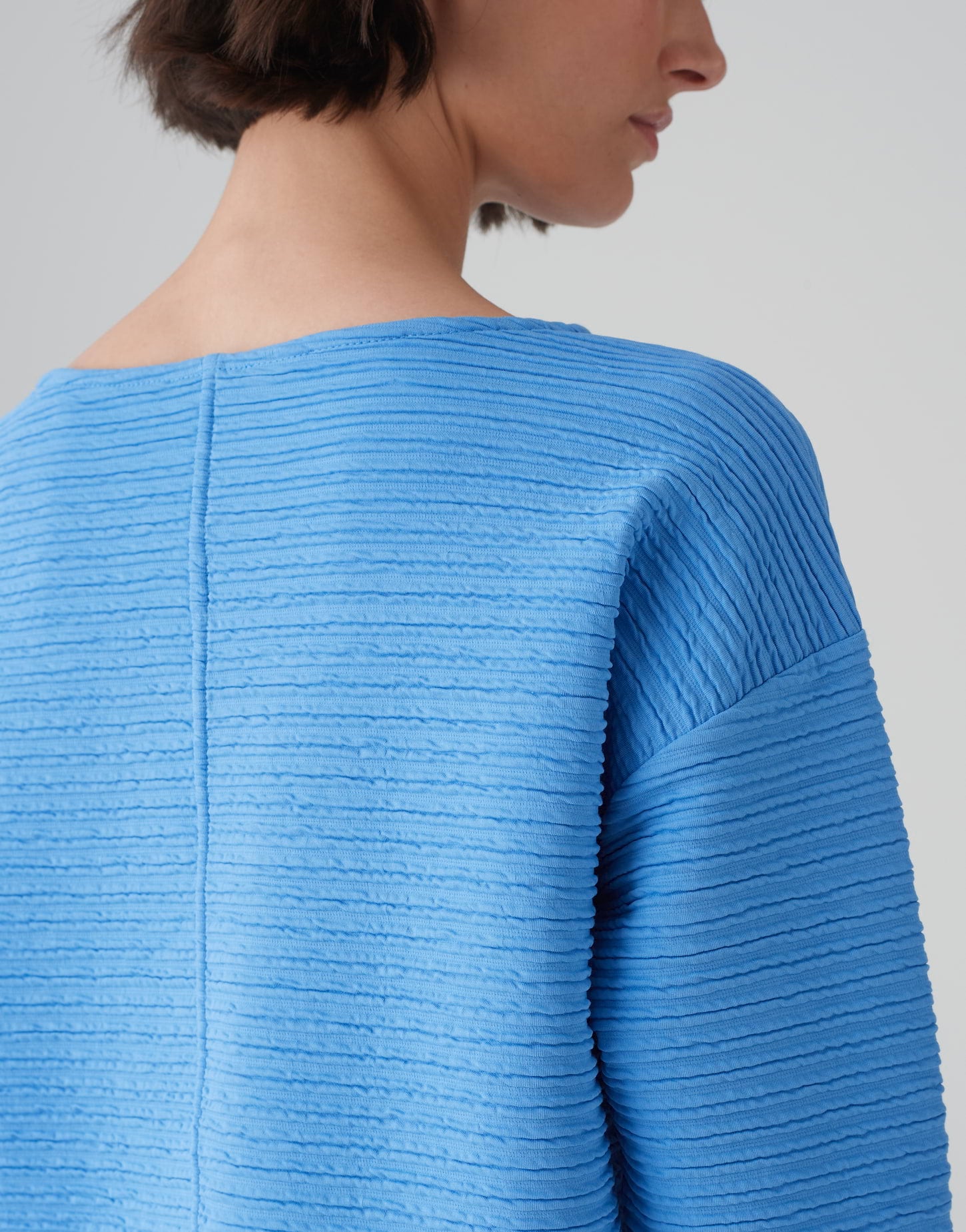 weite Passform, Boxy Silhouette, leicht verkürzt geschnitten, verkürzter Arm, U-Boot-Ausschnitt, Rückenlänge ca. 56 cm bei Größe 36, Model Größe 178 cm – trägt Größe 36, Sweatware, Streifenstruktur, Längsnaht hinten, überschnittene Schultern