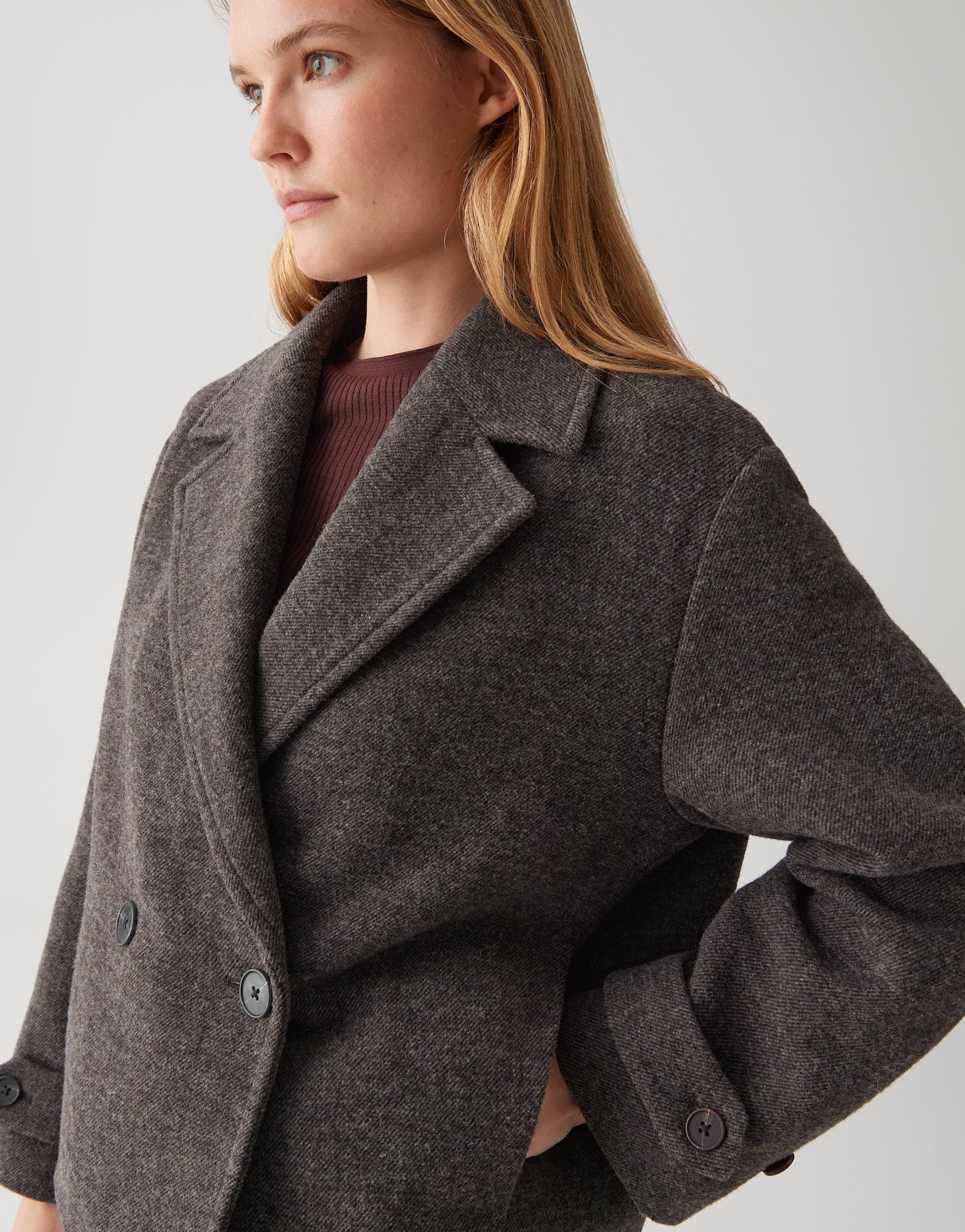 lockere Passform, gerader Schnitt, Langarm, Reverskragen, Rückenlänge ca. 60 cm bei Größe 36, Model Größe 178 cm – trägt Größe 36, Webware, Futter: Polyester, natürlicher Griff, wärmend, Leicht wärmend, Melangé-Effekt, Nahttaschen vorne, zweireihige Knopfleiste, Ärmelenden mit Riegel