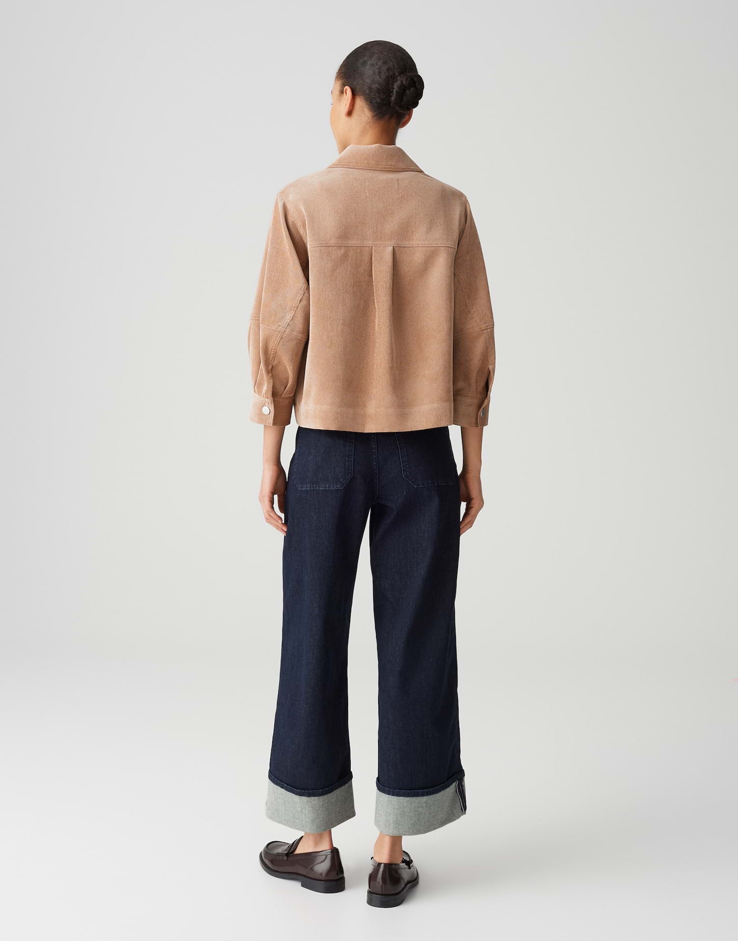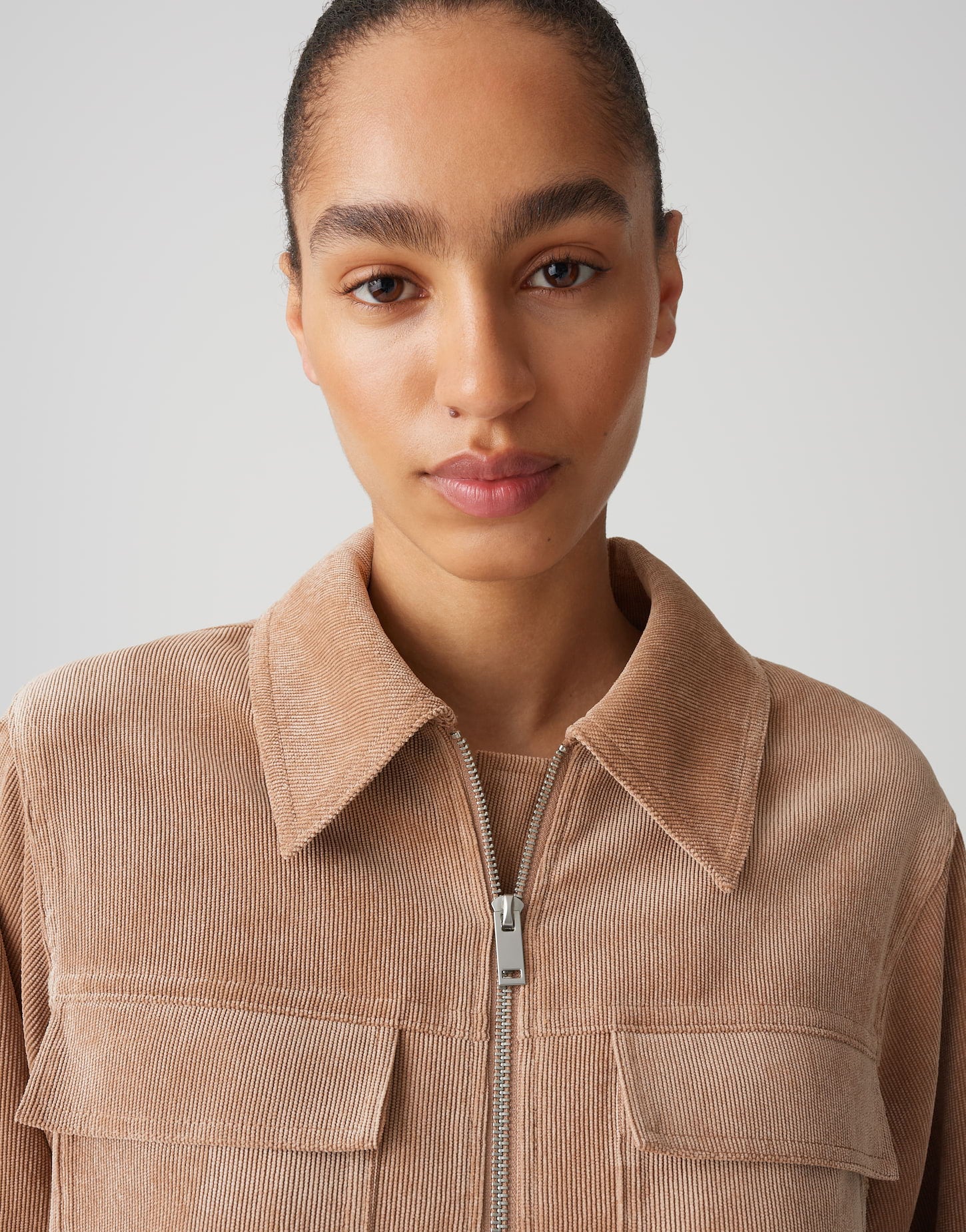lockere Passform, gerader Schnitt, 3/4 Arm, Umlegekragen, Rückenlänge ca. 55 cm bei Größe 36, Model Größe 175 cm – trägt Größe 36, Cord, feine Rippstruktur, weicher Griff, weich fließender Fall, aufgesetzte Pattentaschen, Rückenpasse mit Quetschfalte, Reißverschluss, Ballonärmel, abgesteppte Teilungsnähte