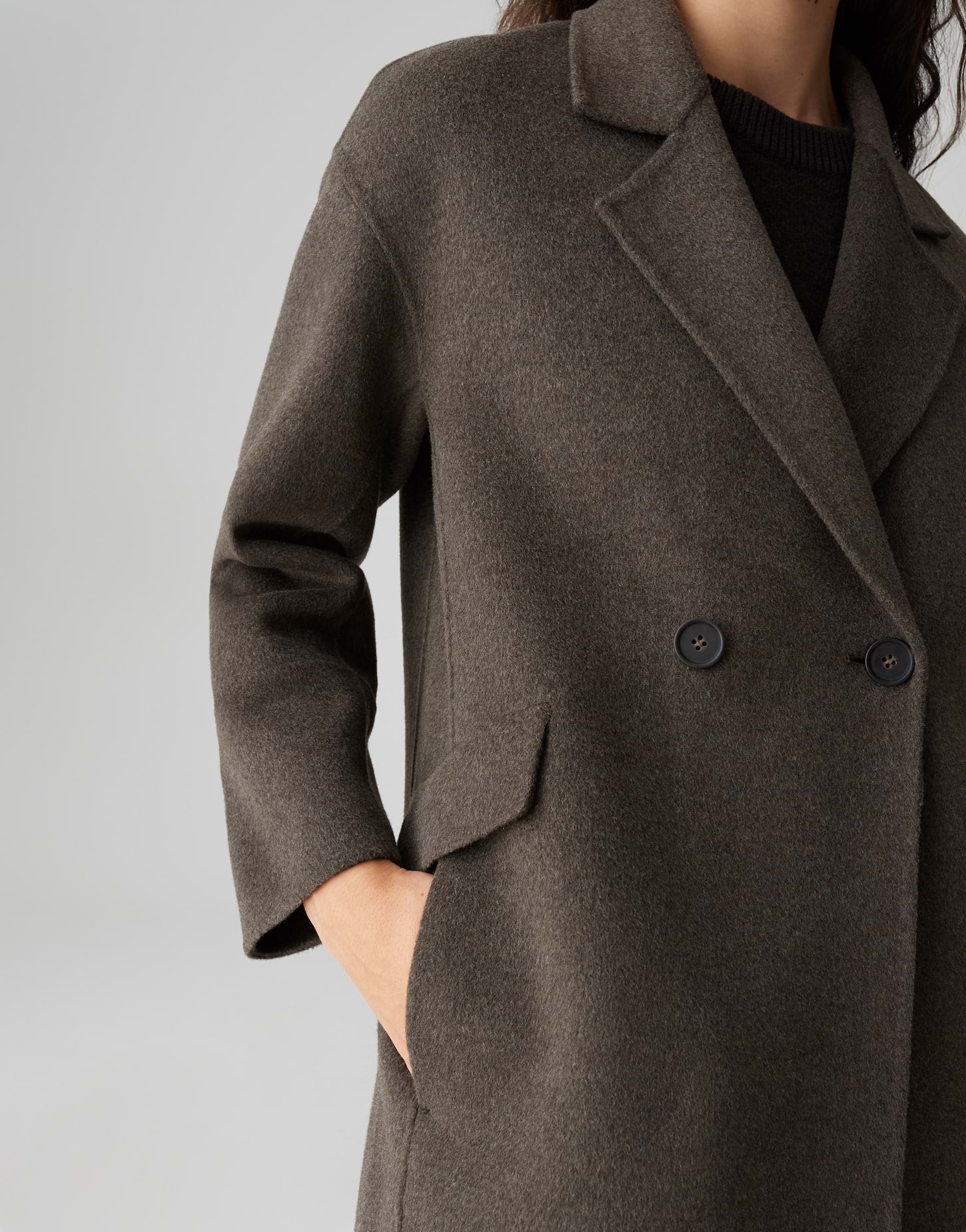 normale Passform, gerader Schnitt, überschnittene Schulter mit Langarm, Reverskragen, Rückenlänge ca. 96 cm bei Größe 36, Model Größe 172 cm – trägt Größe 36, Webware, ungefüttert, weicher Griff, wärmender Stoff, Eingrifftaschen, Zier-Pattentaschen vorne, zweireihige Knopfleiste, Knöpfe in Horn Optik, Längsnaht hinten