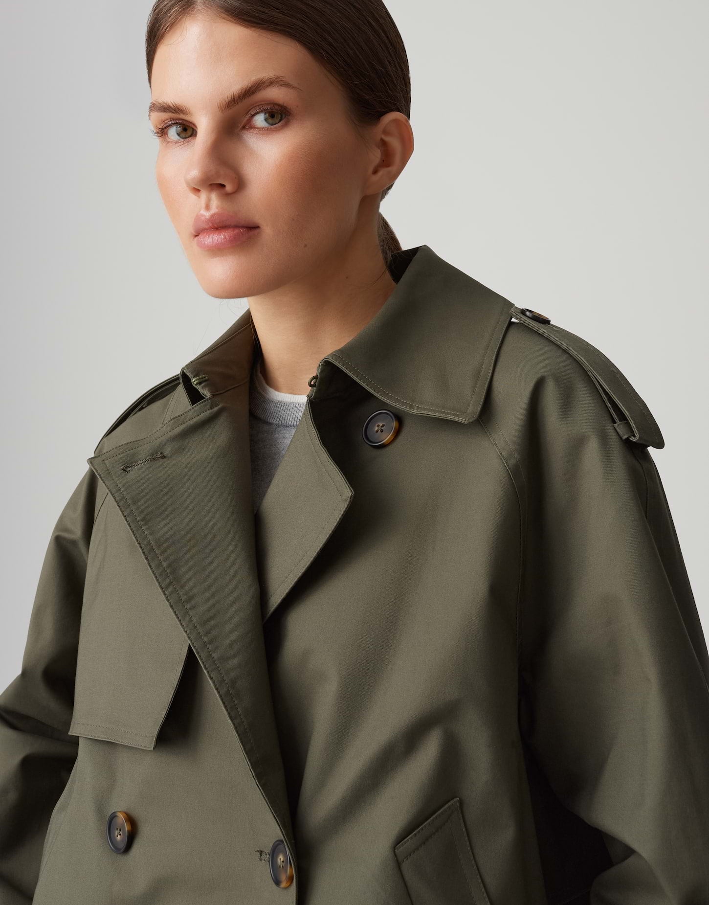 weite Passform, ausgestellt geschnitten, leicht verkürzt geschnitten, überschnittener Langarm, Umlegekragen, Rückenlänge ca. 57 cm bei Größe 36, Model Größe 177 cm – trägt Größe 36, Webware, glattes Innenfutter, dezente Twillstruktur, fester Griff, schräge Eingrifftaschen, geraffter Ballon-Saum, zweireihige Knopfleiste, Schulterriegel, Knöpfe in Horn Optik, Raglanärmel