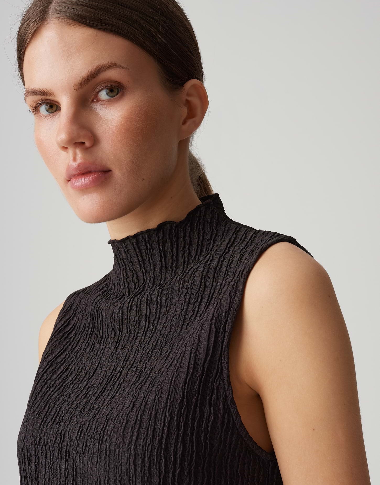 normale Passform, gerader Schnitt, ärmellos, Stehkragen, Rückenlänge ca. 59 cm bei Größe 36, Model Größe 175 cm – trägt Größe 36, Jersey, Crinkle Effekt, weicher Griff, elastischer Stoff, Rollkanten