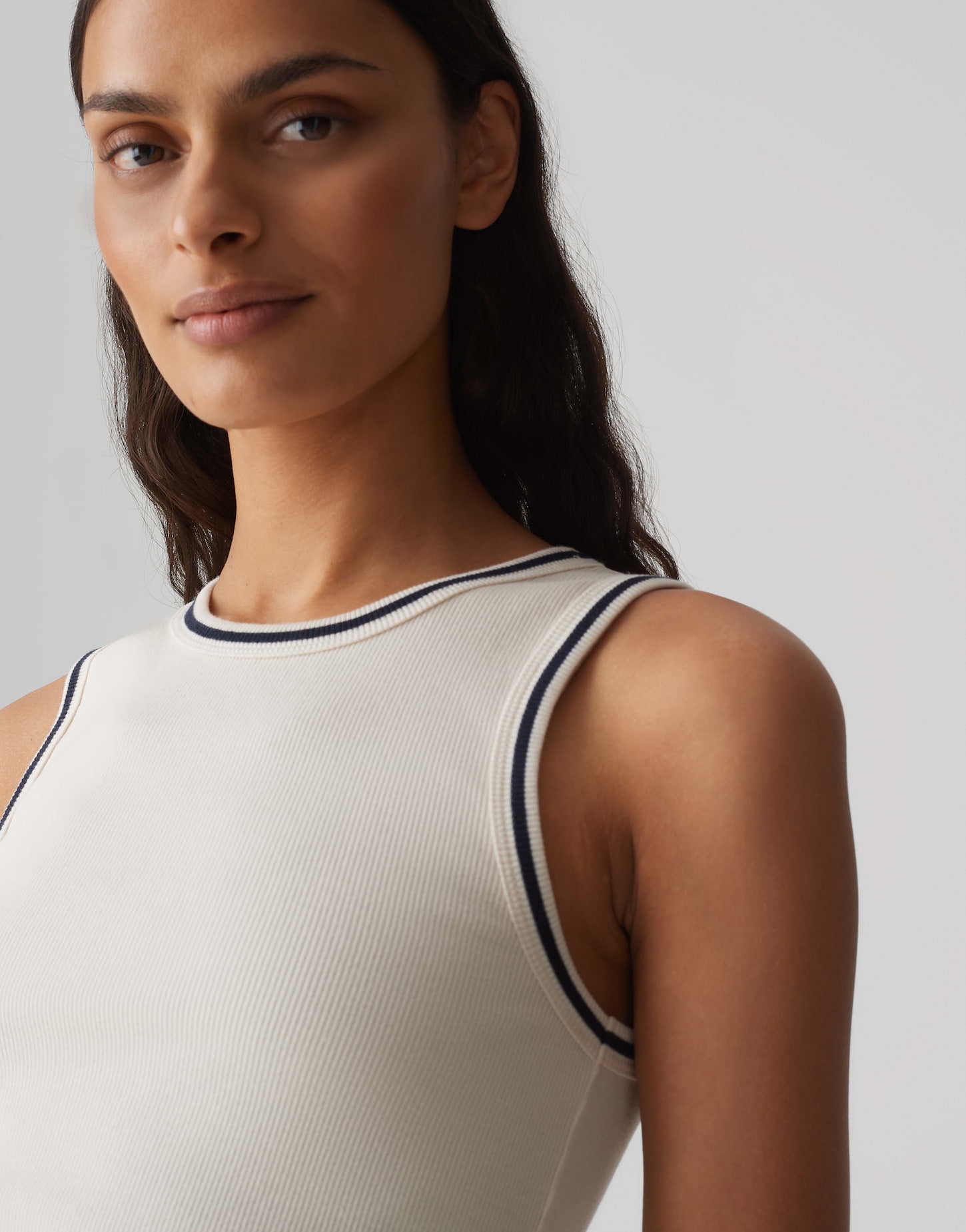 schmale Passform, figurbetont geschnitten, normale Länge, Nullarm, Rundhalsausschnitt, Rückenlänge ca. 61 cm bei Größe 36, Model Größe 178 cm – trägt Größe 36, Jersey, feine Rippstruktur, elastischer Stoff, kontrastreiche Konturen