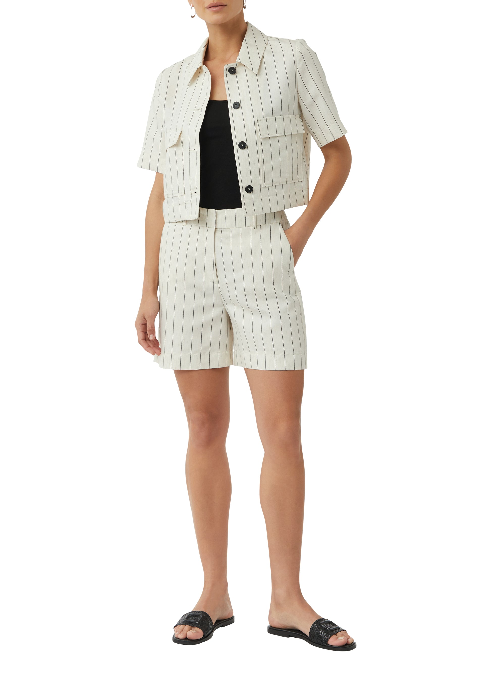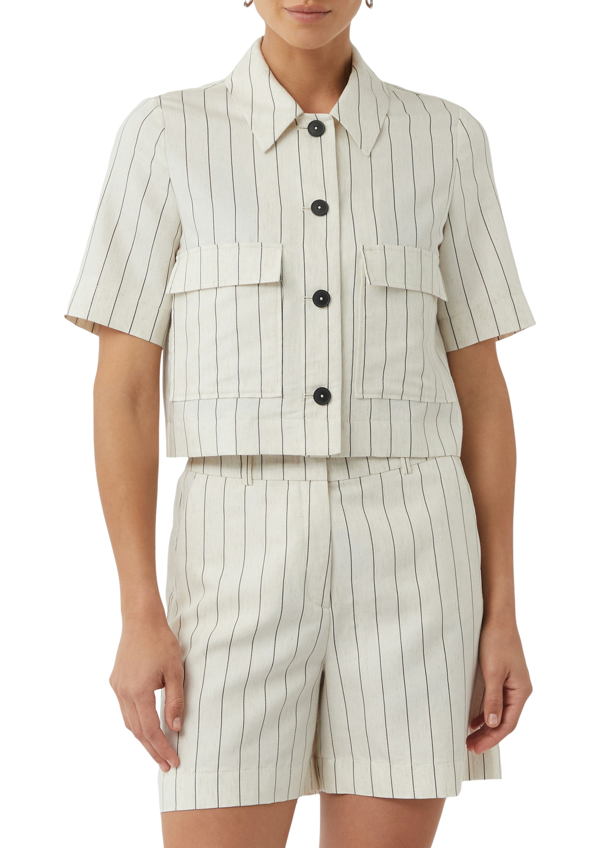Dieses kurze Leinenmix-Overshirt im Boxy Fit ist Ihr neuer Casual-Favorit. Mit halblangen Ärmeln, Hemdkragen und aufgesetzten Taschen vereint es Komfort und Stil. Das gestreifte Muster auf hochwertiger Webware verleiht Ihrem Look eine modische Note. Knopfverschluss und fließender Schnitt machen es vielseitig kombinierbar – perfekt für lässige Outfits mit urbanem Flair.