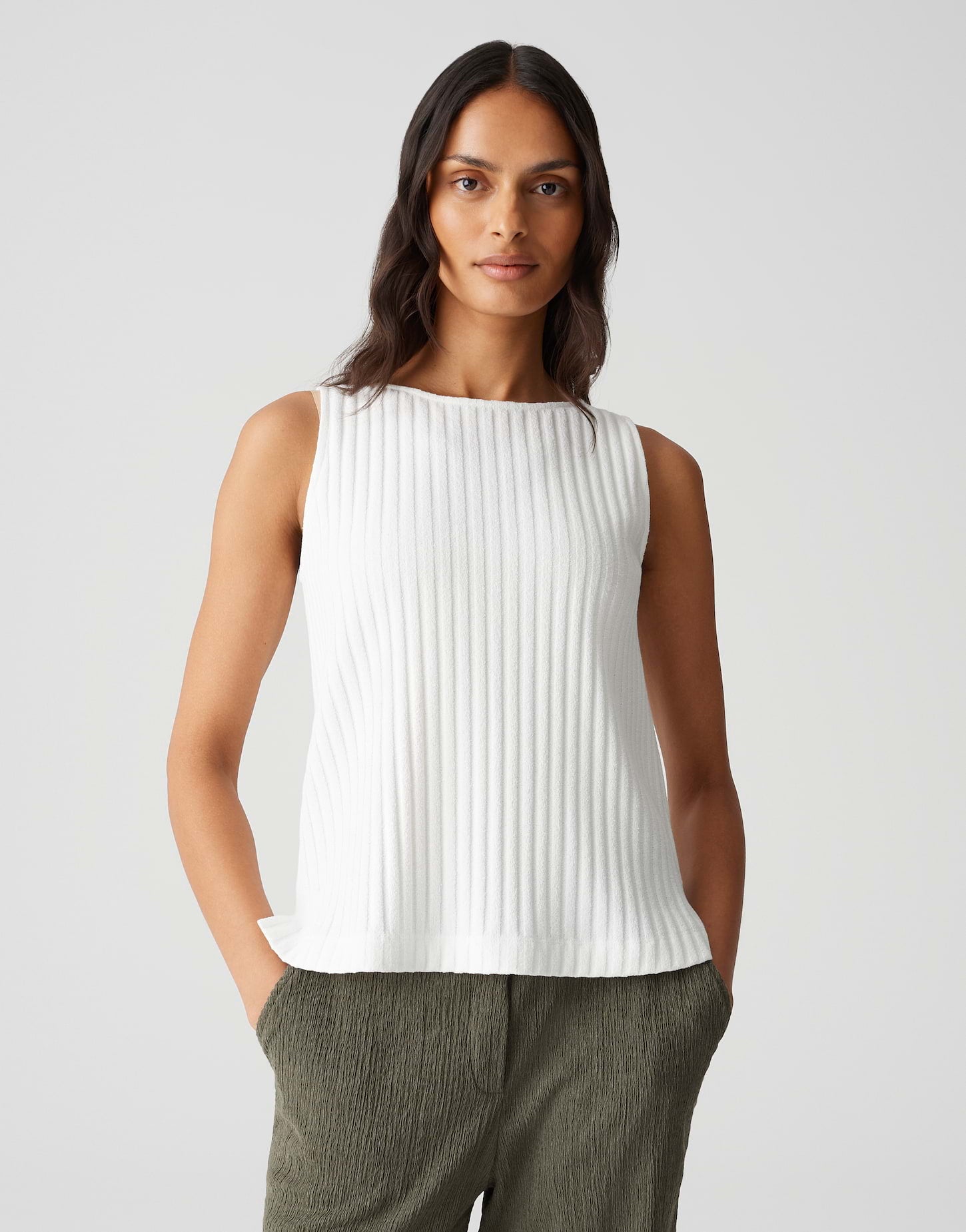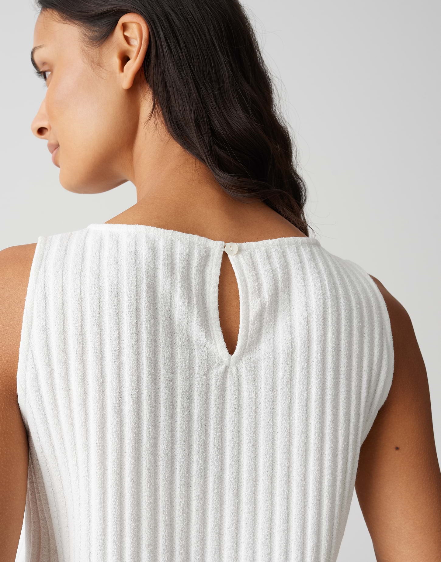 lockere Passform, gerader Schnitt, Nullarm, Rundhalsausschnitt, Rückenlänge ca. 55 cm bei Größe 36, Model Größe 175 cm – trägt Größe 36, Jersey, Rippstruktur, weicher Griff, elastischer Stoff, Knopf mit Öse im Rücken, kleine Schlitze in den Seiten