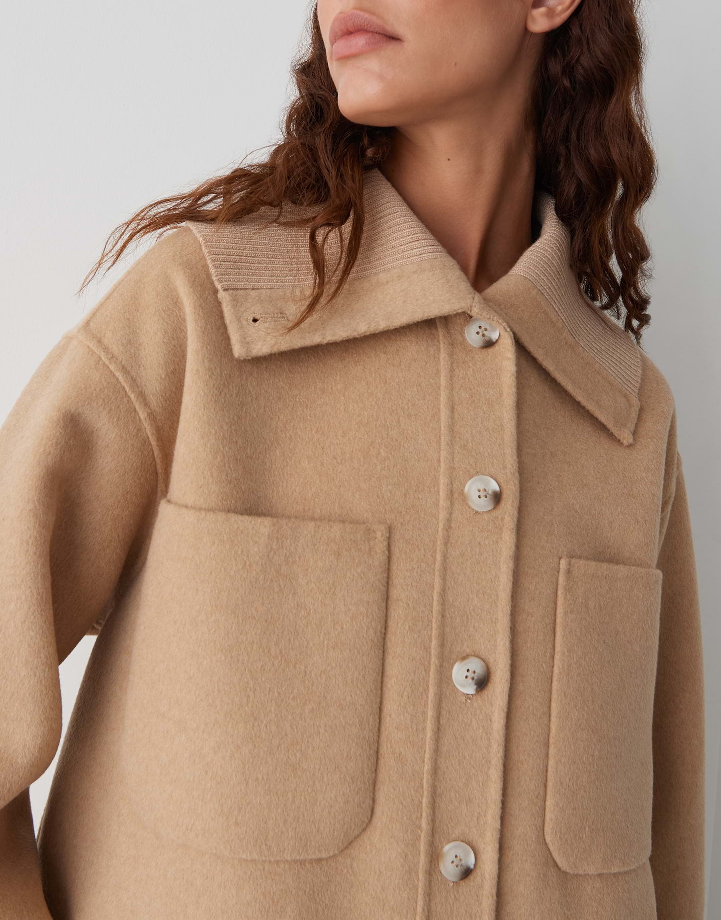lockere Passform, gerader Schnitt, lang geschnitten, überschnittene Schulter mit Langarm, Rippstrickkragen, Rückenlänge ca. 73 cm bei Größe 36, Model Größe 177 cm – trägt Größe 36, Webware, weicher Griff, fließender Fall, wärmend, aufgesetzte Taschen vorne, abgerundeter Saum, Knopfleiste, Knöpfe in Horn Optik