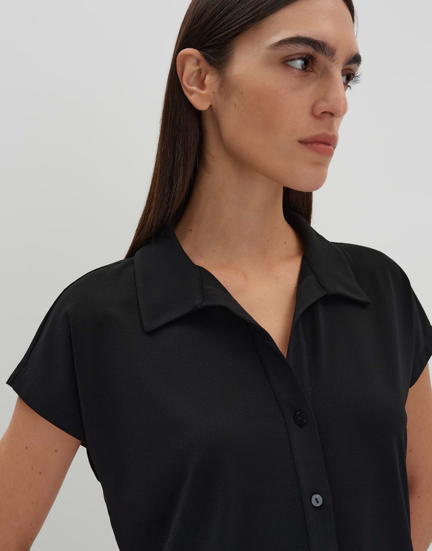 lockere Passform, gerader Schnitt, normale Länge, überschnittener Kurzarm, Umlegekragen, Rückenlänge ca. 60 cm bei Größe 36, Model Größe 176 cm – trägt Größe 36, Jersey, gekreppte Oberfläche, leichter Stoff, knitterarm, weich fließender Fall, abgerundeter Saum, Knopfleiste