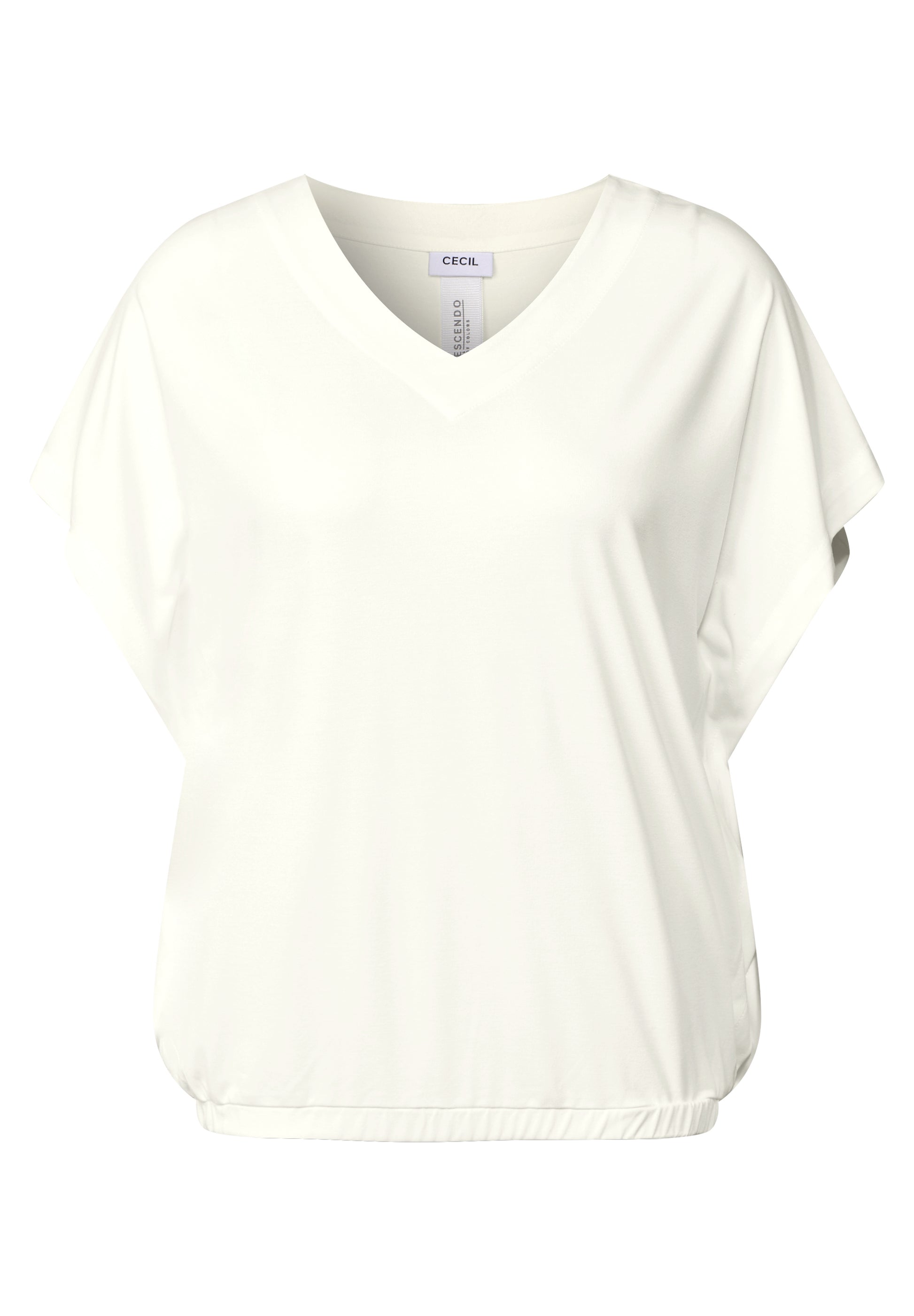 Dieses Sommershirt von CECIL für Damen überzeugt mit einem weichen Modalmix, einem elastischem Saum und einer lässigen Passform. Der V-Ausschnitt setzt feminine Akzente. Ein bequemes Basic für entspannte Styles! Sommershirt V-Ausschnitt Kurzarm Elastischer Saum Besonders weicher Modalmix Material: 78% Modal, 22% Polyester