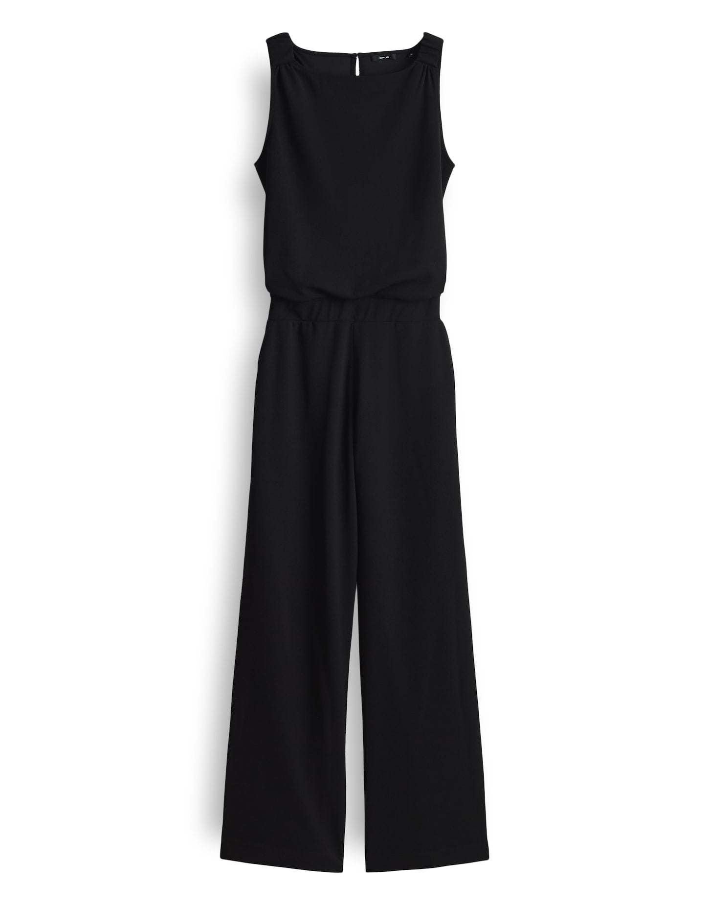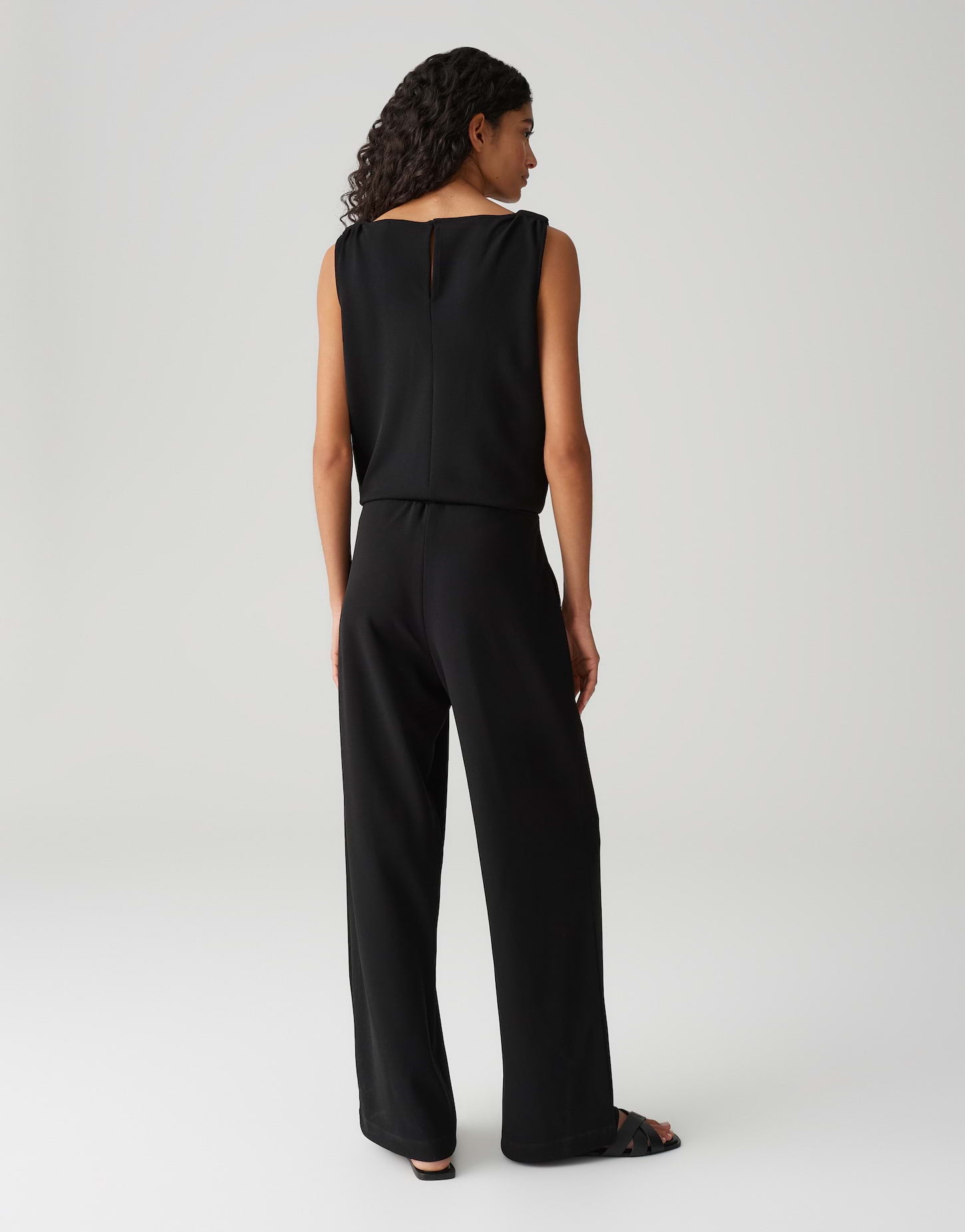 Wide Fit, weit am Oberschenkel, weiter, gerader Beinverlauf, lockere Passform, Long, Nullarm, U-Boot-Ausschnitt, Hosenbein Innenlänge ca. 78 cm in jeder Größe, Model Größe 176 cm – trägt Größe 36, Jersey, gekreppte Oberfläche, natürlicher Griff, elastischer Stoff, knitterarm, schräge Eingrifftaschen, elastischer Gummibund, Knopf mit Öse im Rücken, elastische Schulterpatte mit Raffung, Teilungsnaht im Rücken