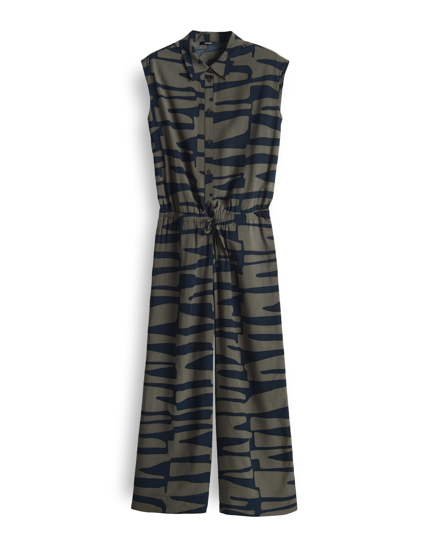 lockere Passform, weiter, gerader Beinverlauf, Cropped, überschnittene Schulter, Hemdblusenkragen, Rückenlänge ca. 52 cm bei Größe 36, Hosenbein Innenlänge ca. 64 cm in jeder Größe, Model Größe 175 cm – trägt Größe 36, Webware, glatter Griff, weich fließender Fall, grafisches Muster, Eingrifftaschen in den Seiten, lange Knopfleiste, elastischer Gummibund, Kordel zum Binden
