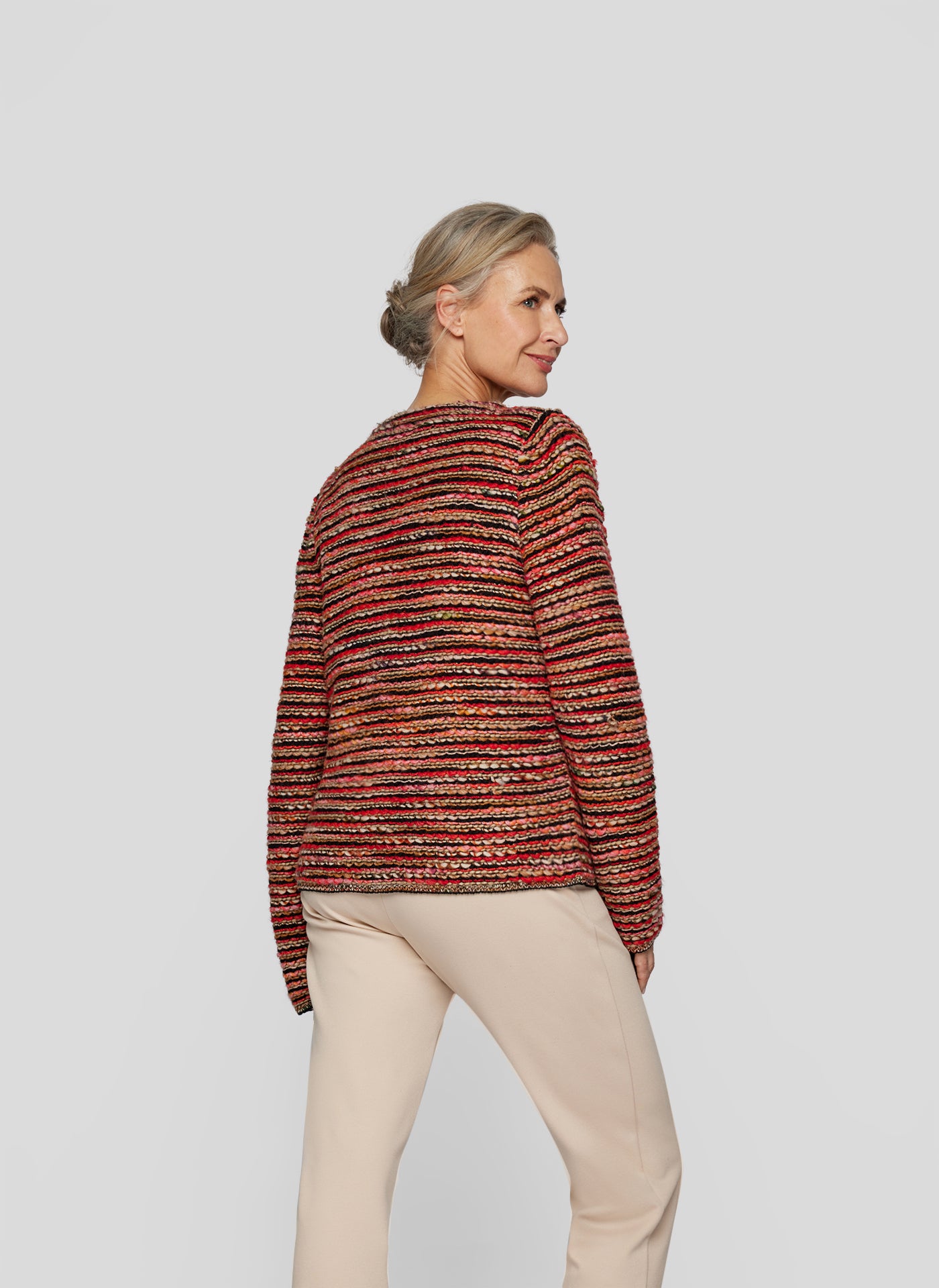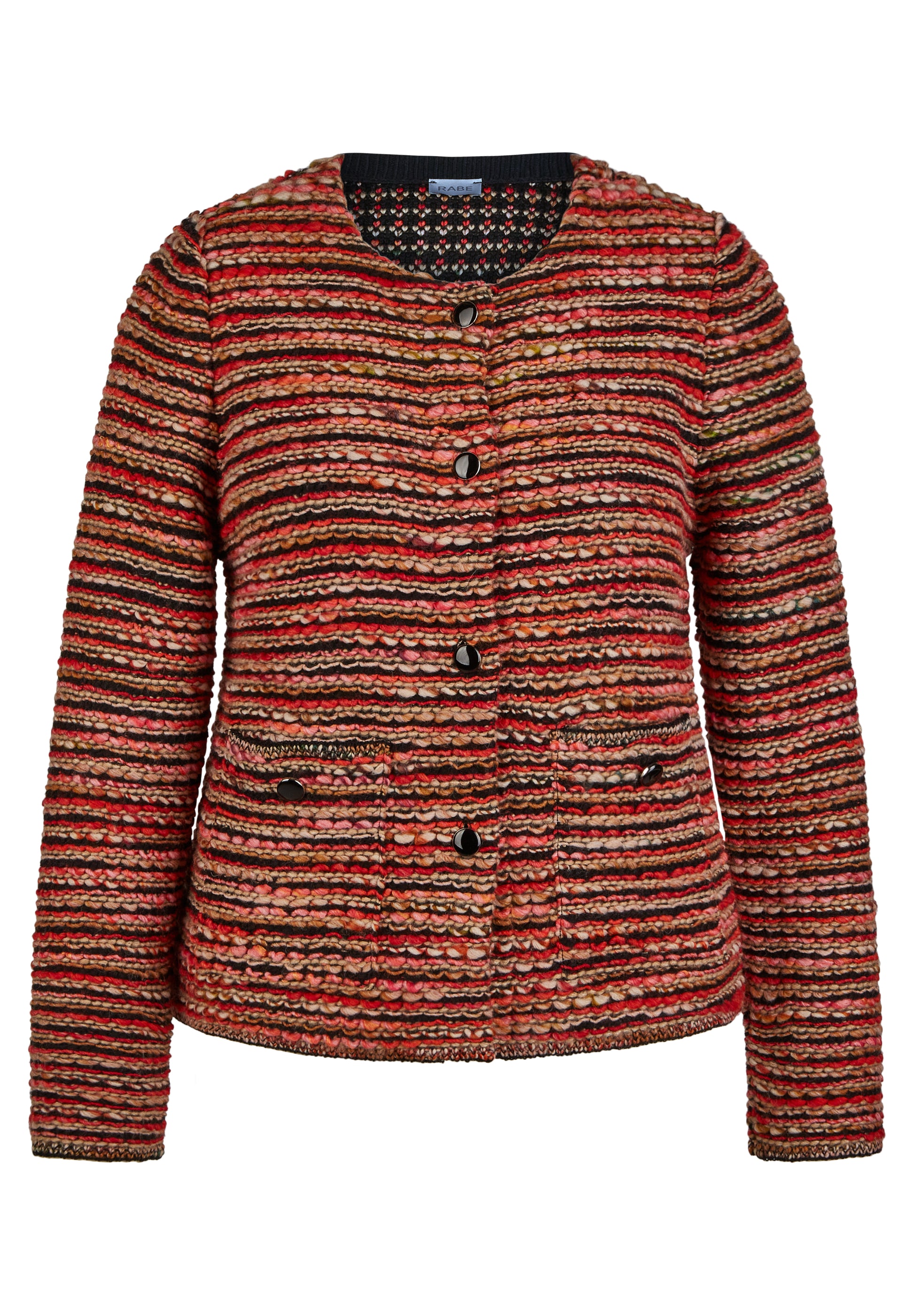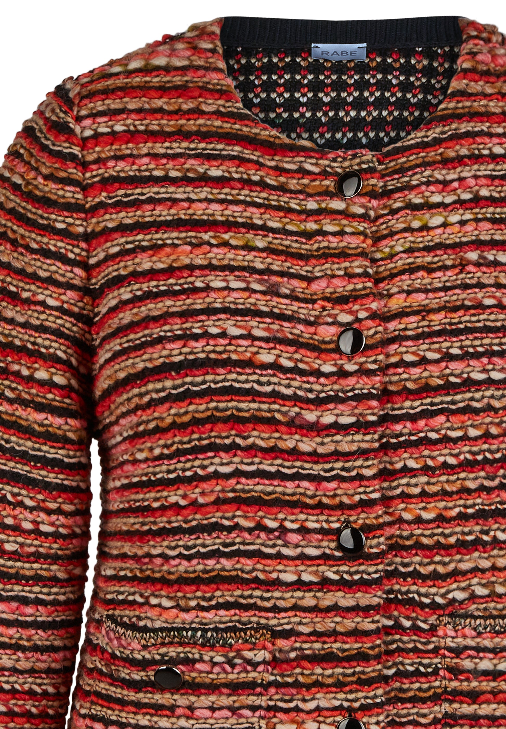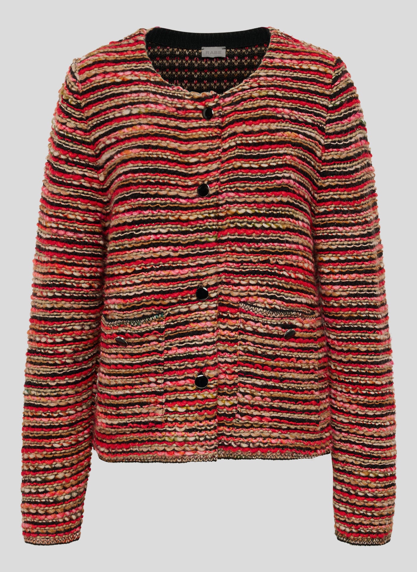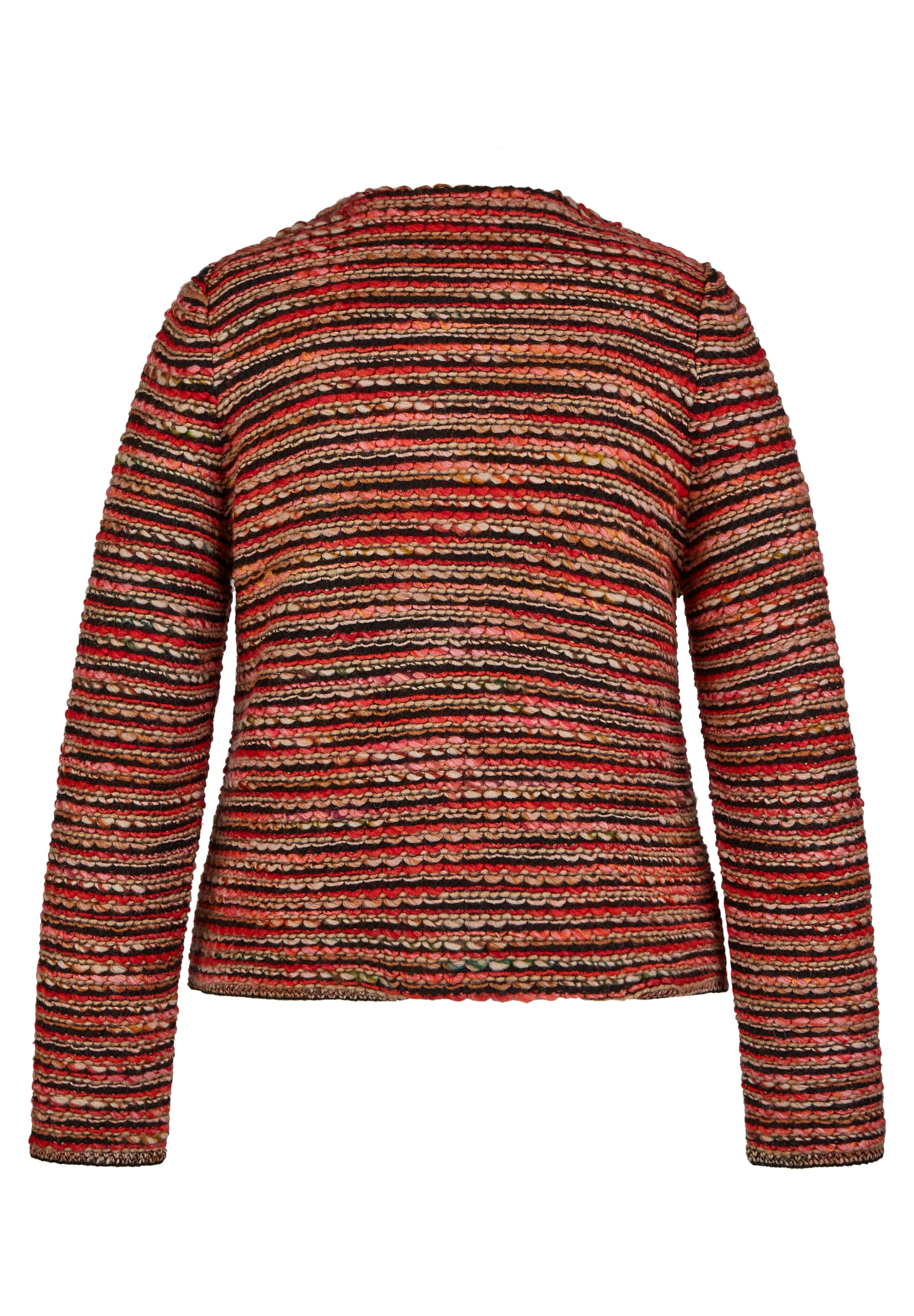 Die Strickjacke aus einem hochwertigen Gemisch aus Polyacryl, Baumwolle, Wolle und Polyester überzeugt mit ihrem Rundhals-Ausschnitt, langen Ärmeln und geradem Schnitt. Das gestreifte Design verleiht ihr eine modische Note und die warmen Farben passen perfekt zur Herbstsaison. Ideal zum Einkuscheln an kühlen Tagen!
