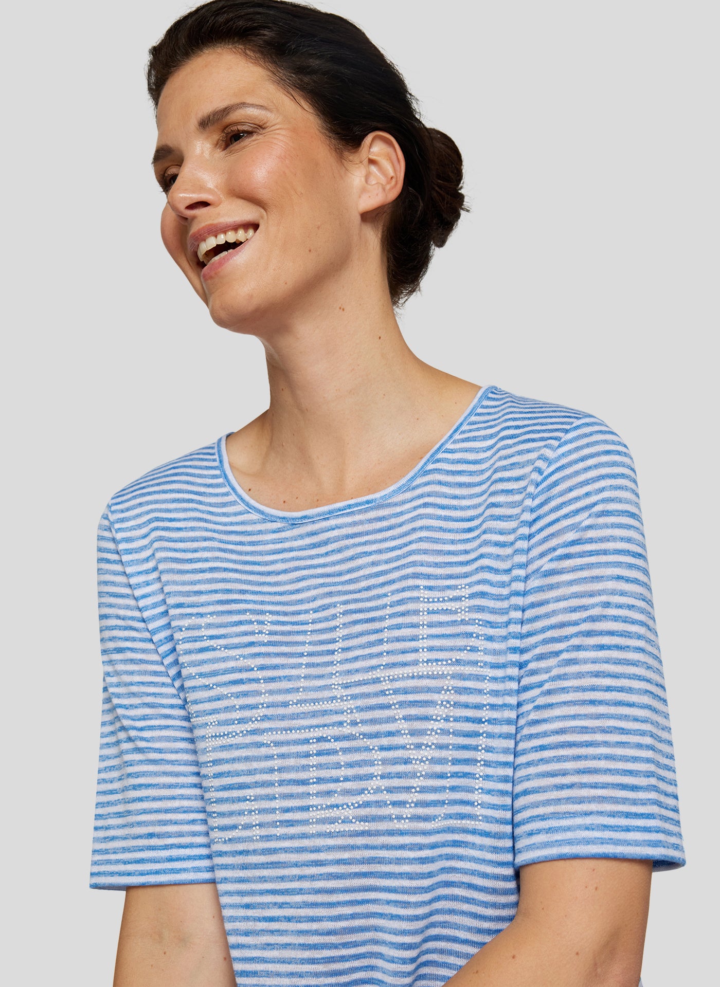 Der dezente Strass-Schriftzug auf der Vorderseite verleiht dem Look eine edle Note. Dank des bequemen Rundhalsausschnitts und der halblangen Ärmel ist es der perfekte Begleiter für den Alltag. Klassisches Streifenmuster für einen maritimen Look. Strass-Schriftzug für einen Hauch Glamour. Weiches, angenehmes Material für hohen Tragekomfort. Ideal kombinierbar mit Jeans, Shorts oder Blazern.