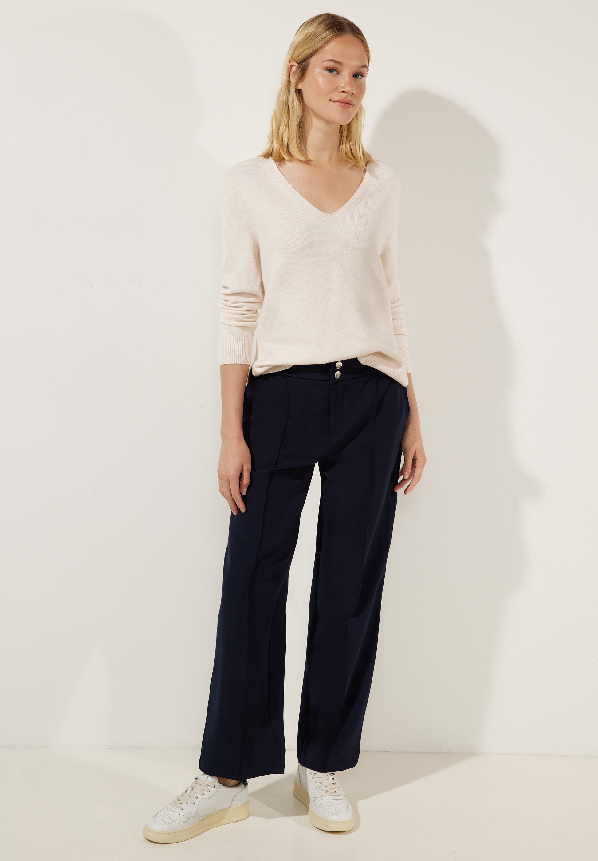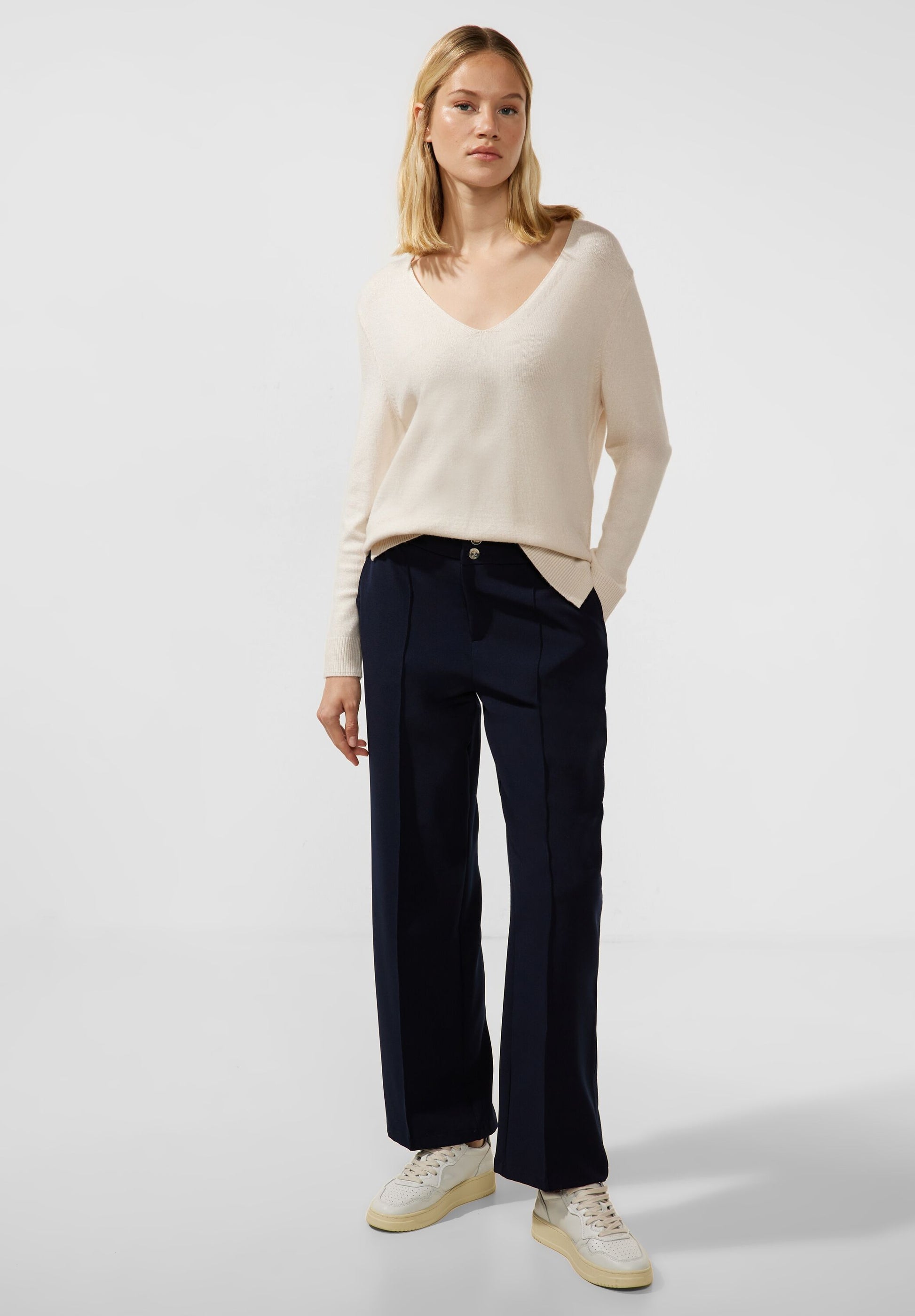 Effortlessly stylish! Der Street One Damen Strickpullover mit Langarm, V-Ausschnitt und Rippstrickbündchen verfügt über seitliche Schlitze am Saum und lässt sich perfekt mit einer Hemdbluse kombinieren, um einen besonderen Look zu kreieren. Leicht überschnittene Schultern sorgen dabei für einen lässigen Fit und Tragekomfort.