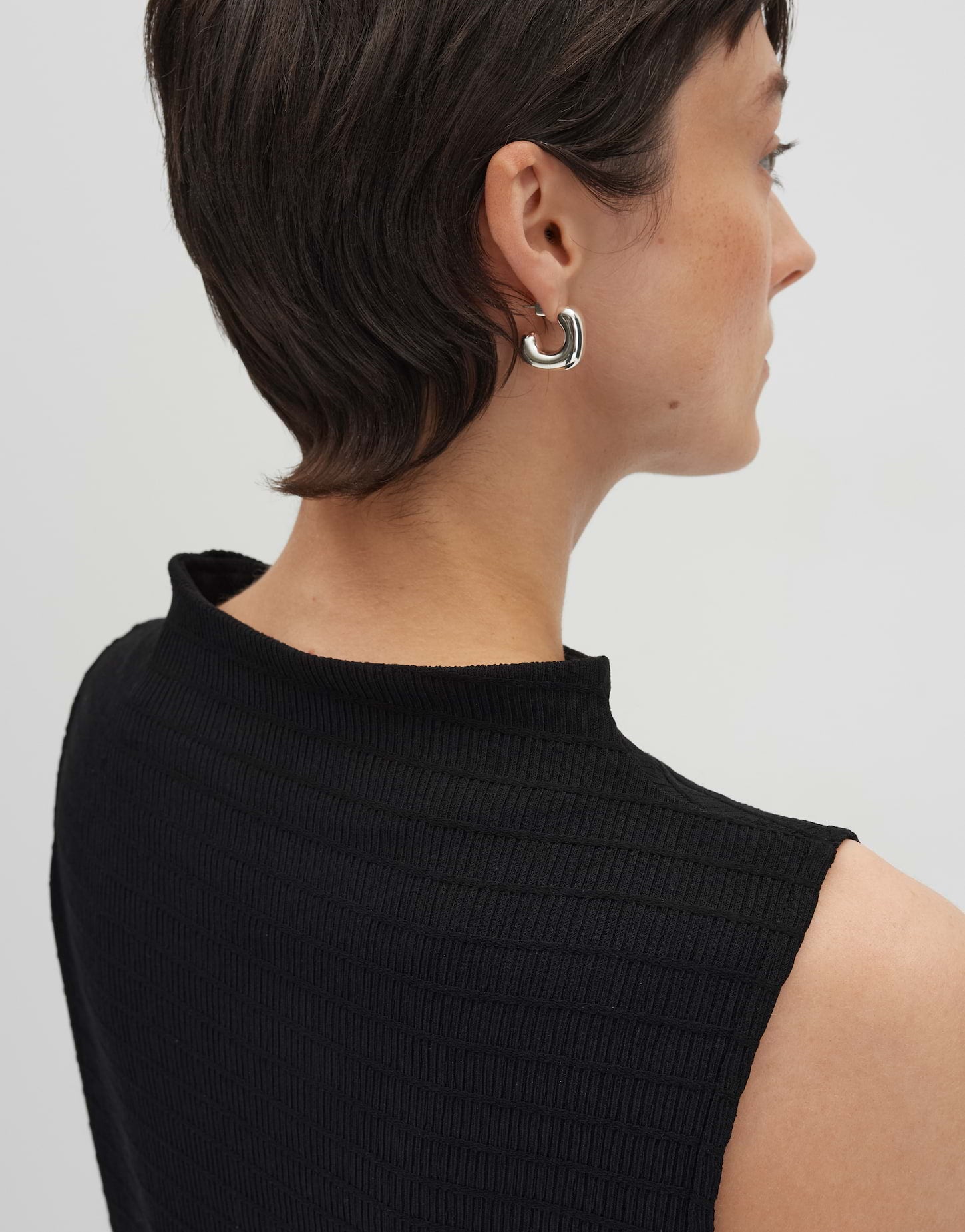 schmale Passform, gerader Schnitt, Midi-Länge, ärmellos, Stehkragen, Rückenlänge ca. 111 cm bei Größe 36, Model Größe 176 cm – trägt Größe 36, Jersey, unregelmäßige Rippstruktur, natürlicher Griff, elastischer Stoff, fließender Fall, Schlitze in den Seiten