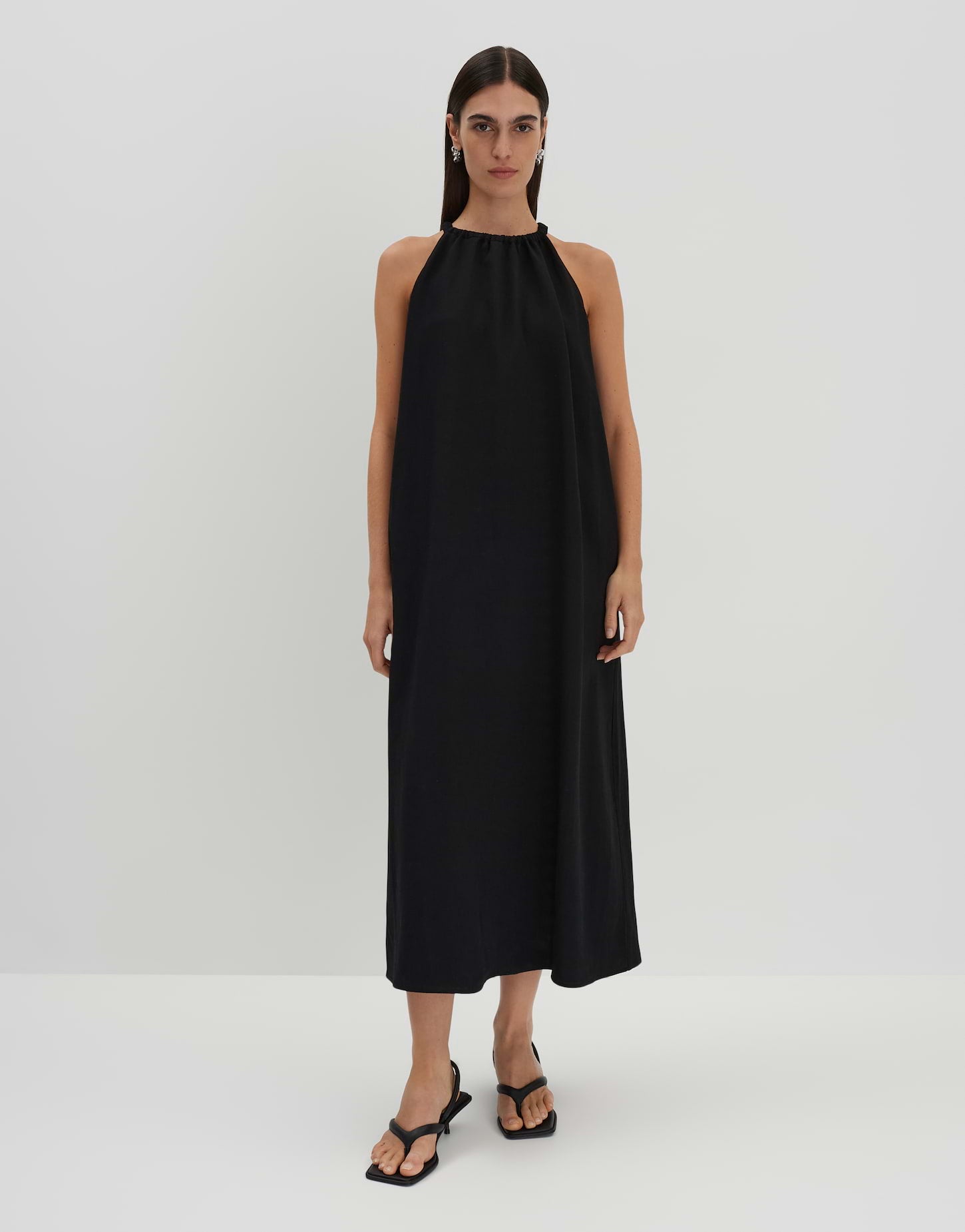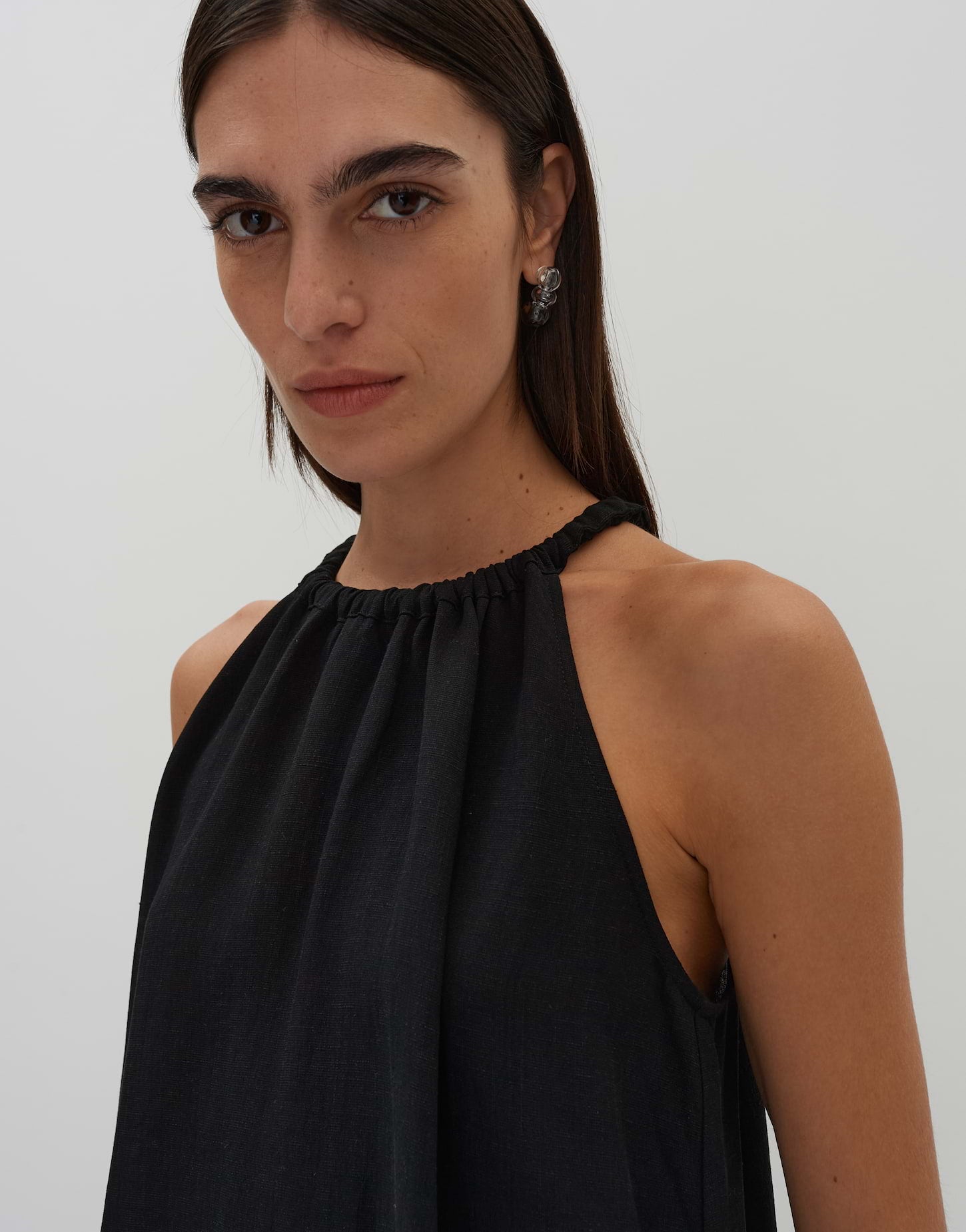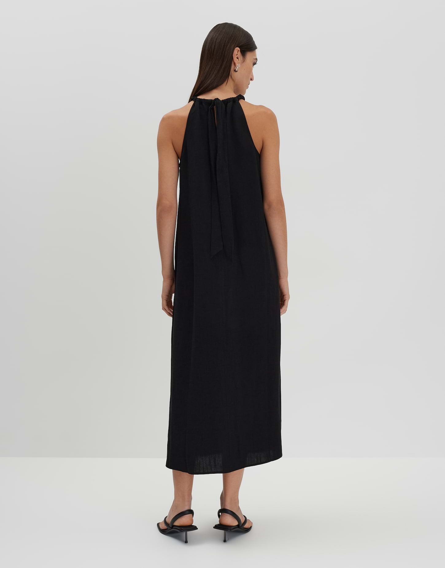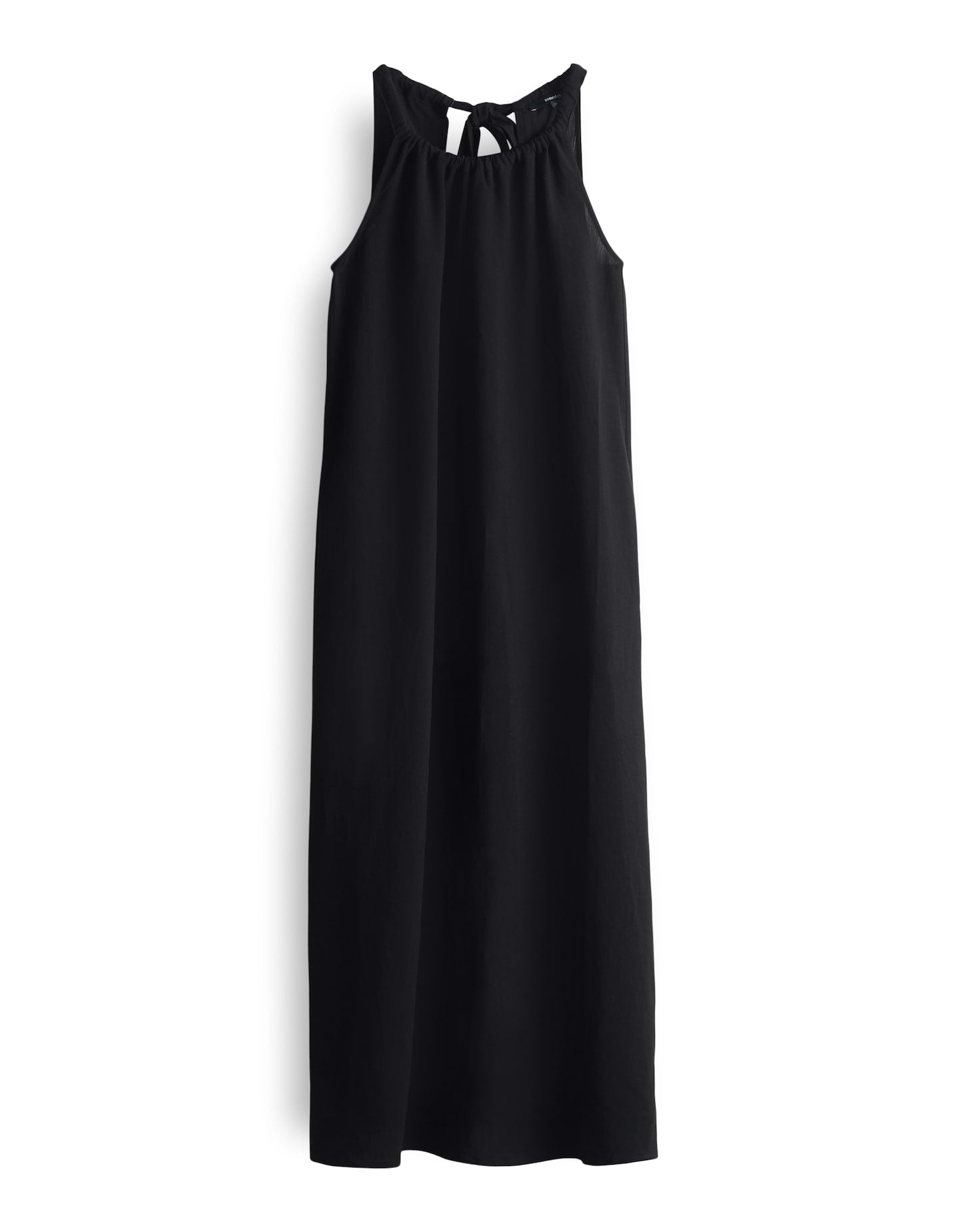 lockere Passform, A-Linie, Midi-Länge, ärmellos, Rundhalsausschnitt, Rückenlänge ca. 124 cm bei Größe 36, Model Größe 176 cm – trägt Größe 36, Webware, natürliche Leinenstruktur, natürlicher Griff, weich fließender Fall, französische Taschen in den Seiten, Kräuselung am Halsloch, Schnürung, Rückenausschnitt
