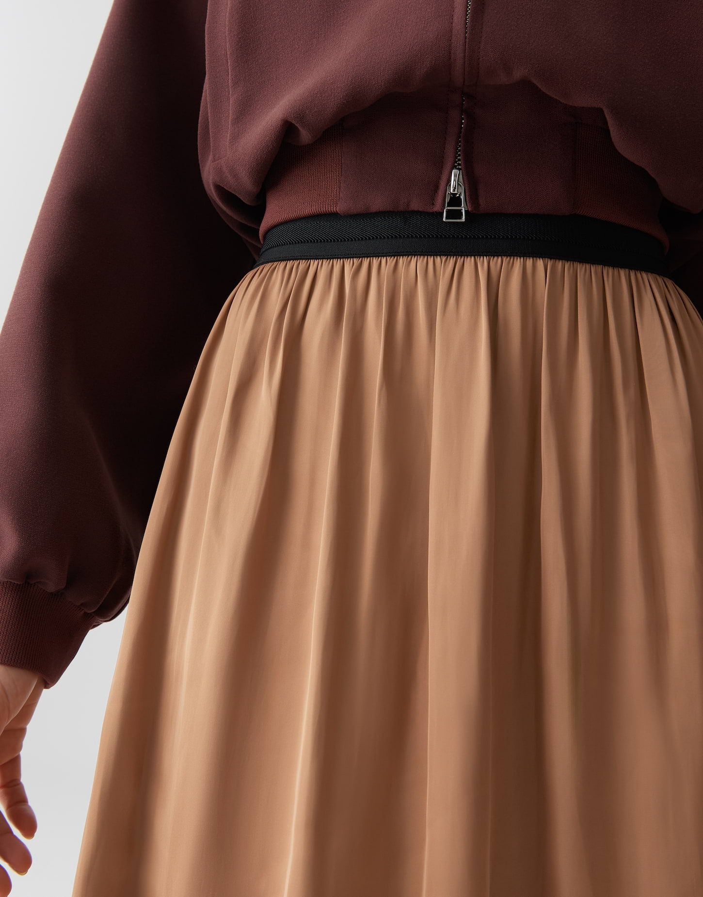 lockere Passform, A-Linie, Midi-Länge, hintere Länge ca. 82 cm in Größe 36, Model Größe 177 cm – trägt Größe 36, Webware, dezente Struktur, natürlicher Griff, fließender Fall, Gummibund in der Taille