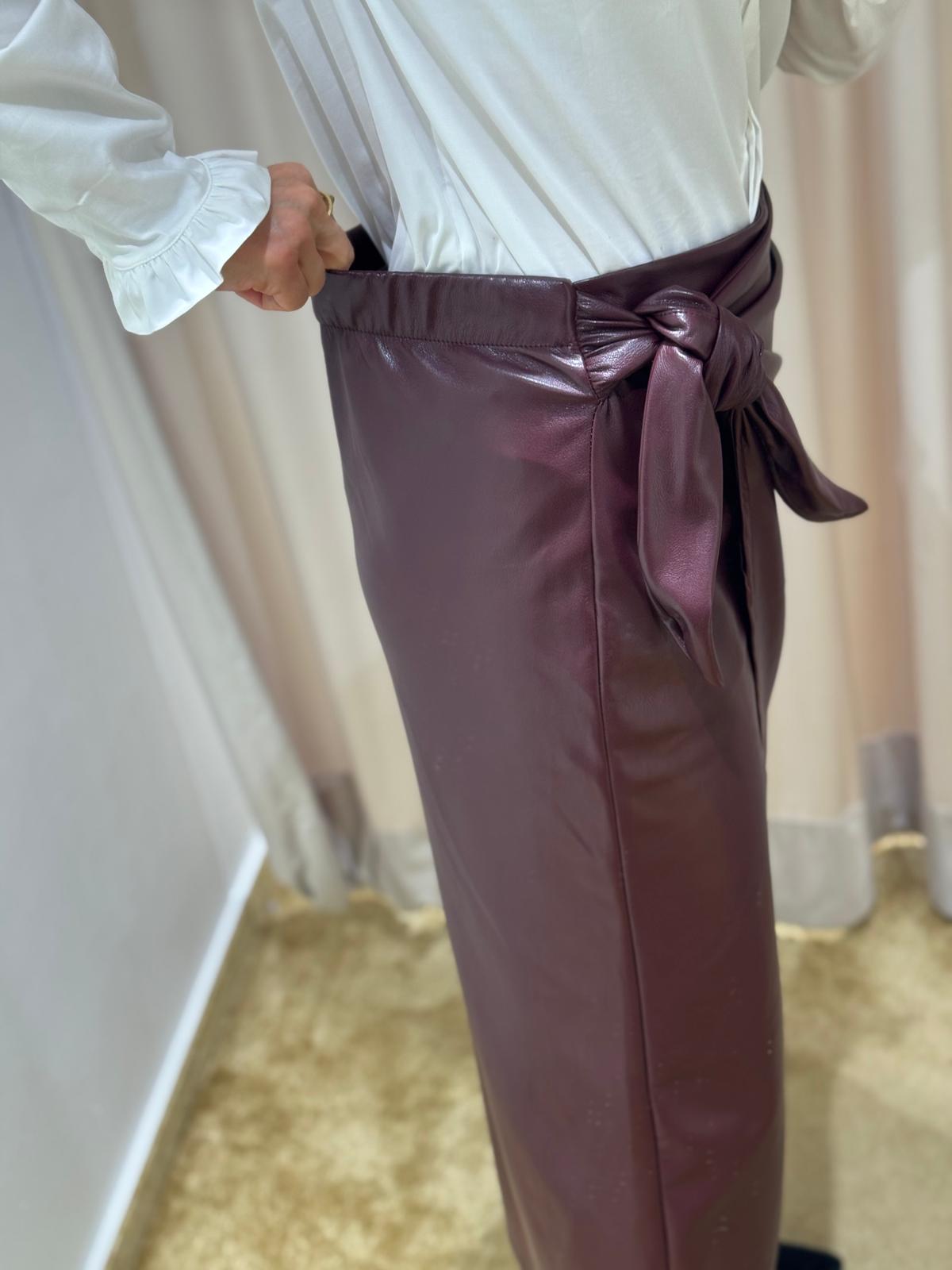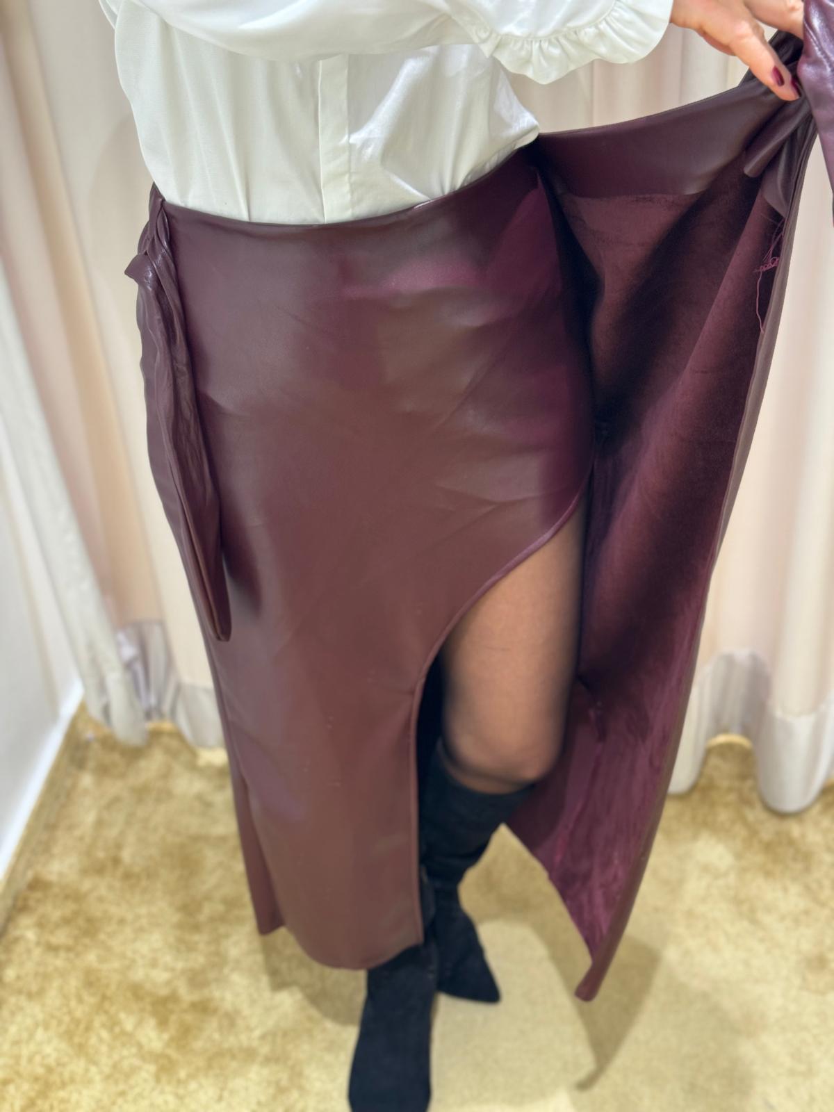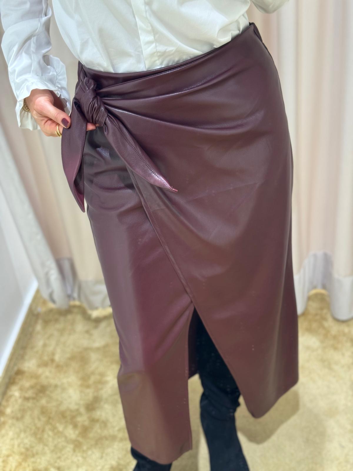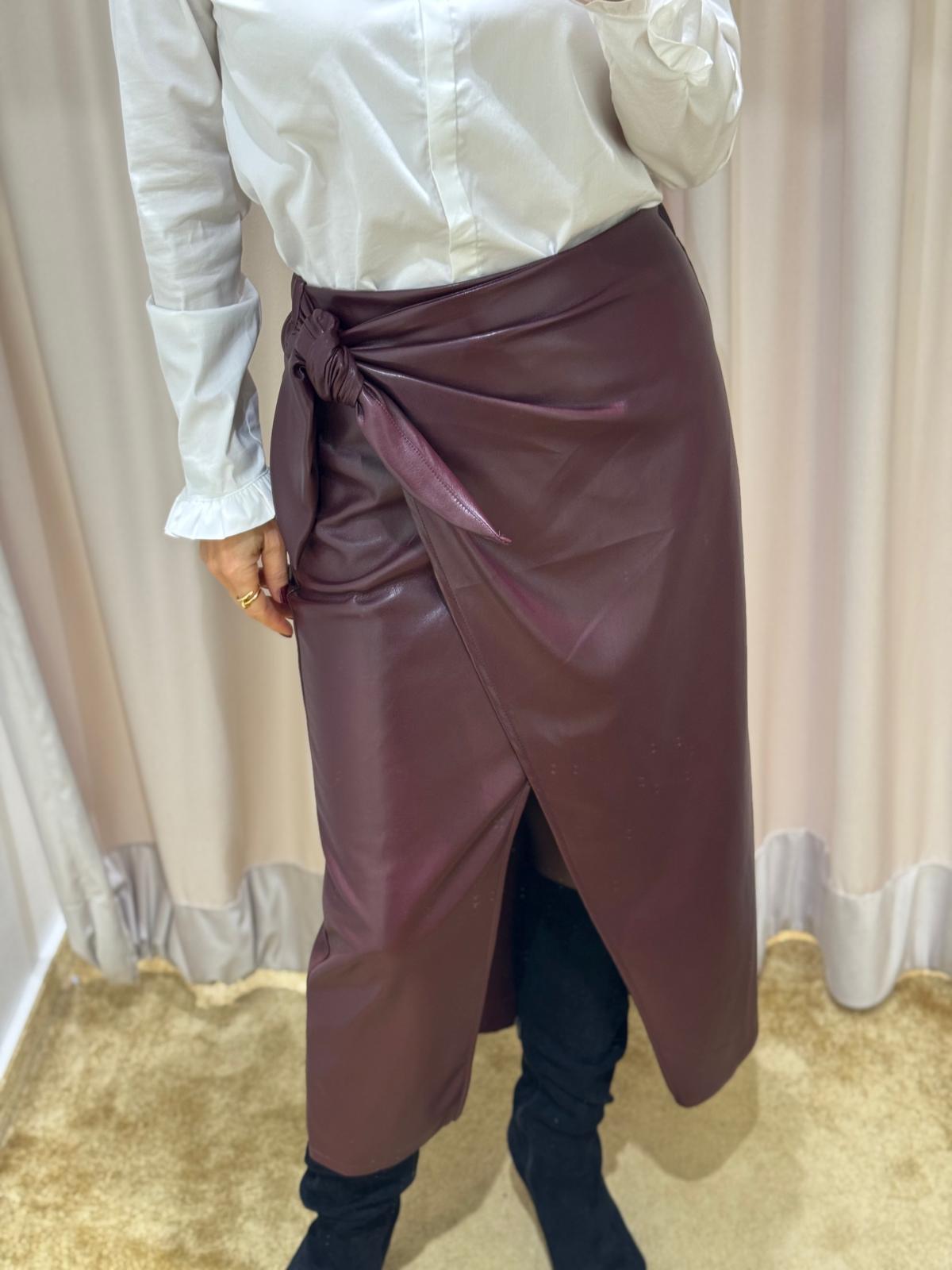 Ein veganer Leder-Liebling mit Twist: Der Wickelrock in sattem Burgundo überzeugt mit edlem Glanz, raffiniertem Knoten-Detail und einer femininen Silhouette. Mit Stiefeln, Heels oder Sneakern – er macht jedes Outfit besonders.