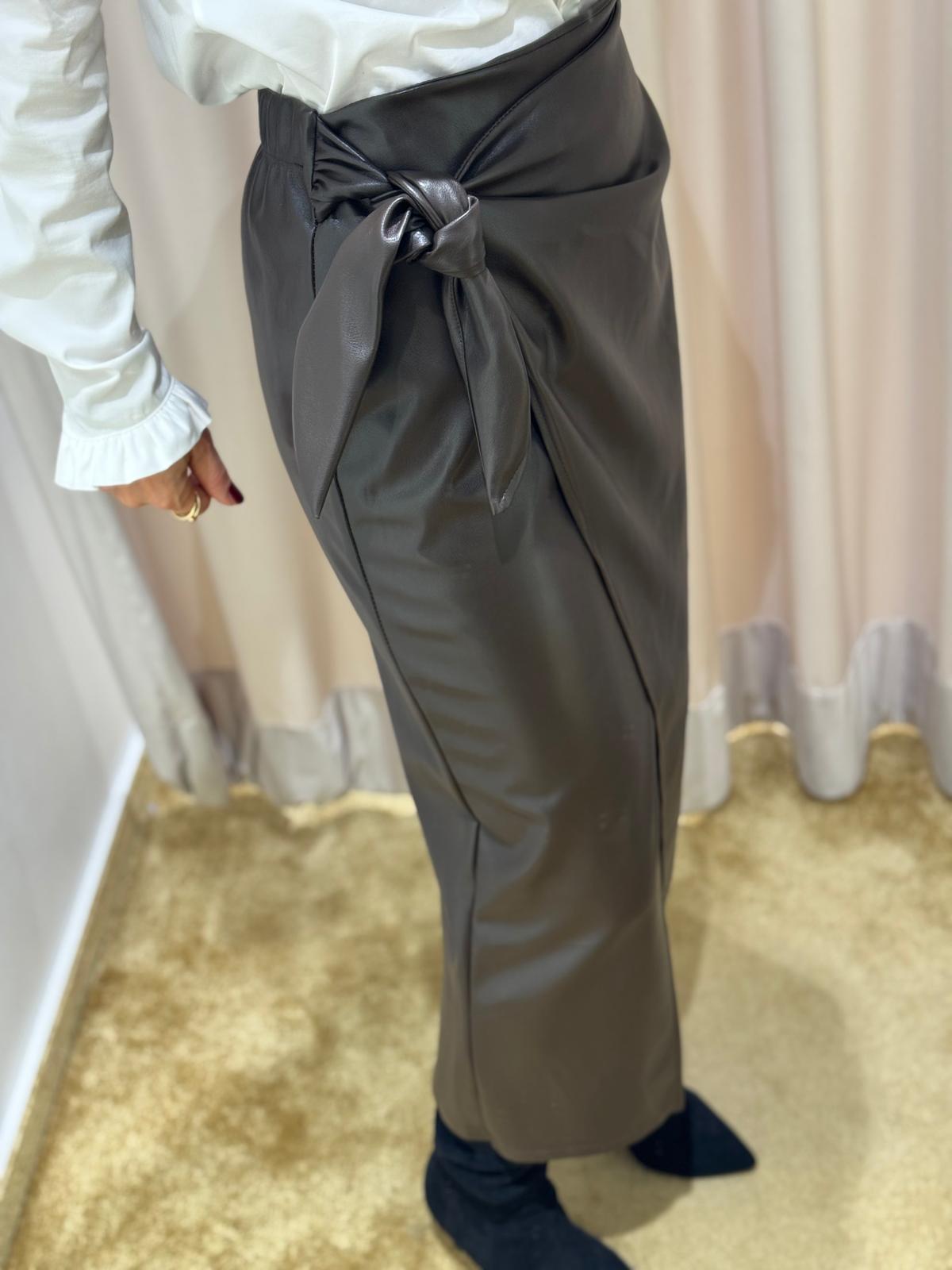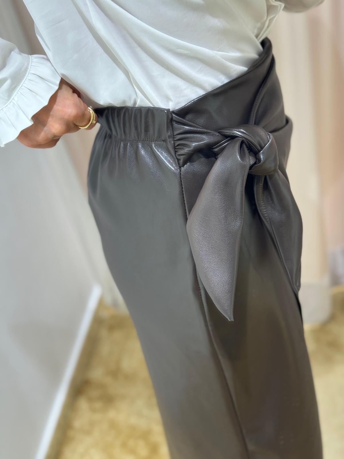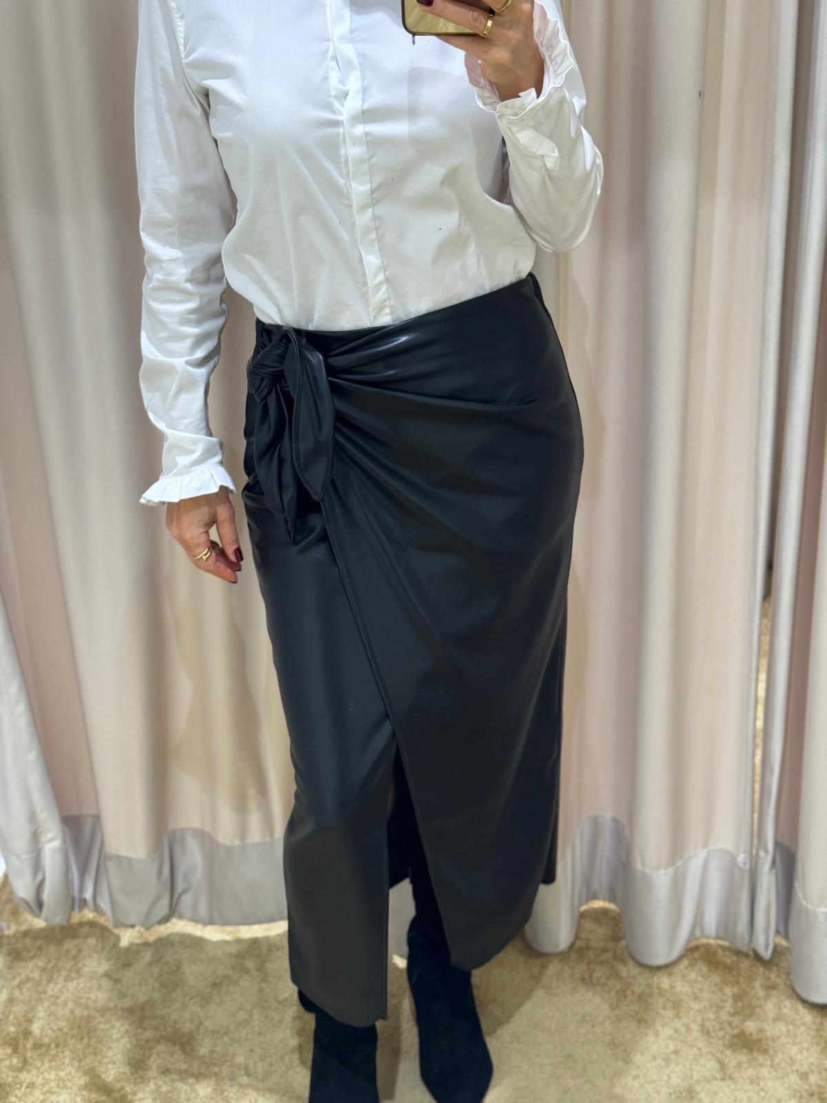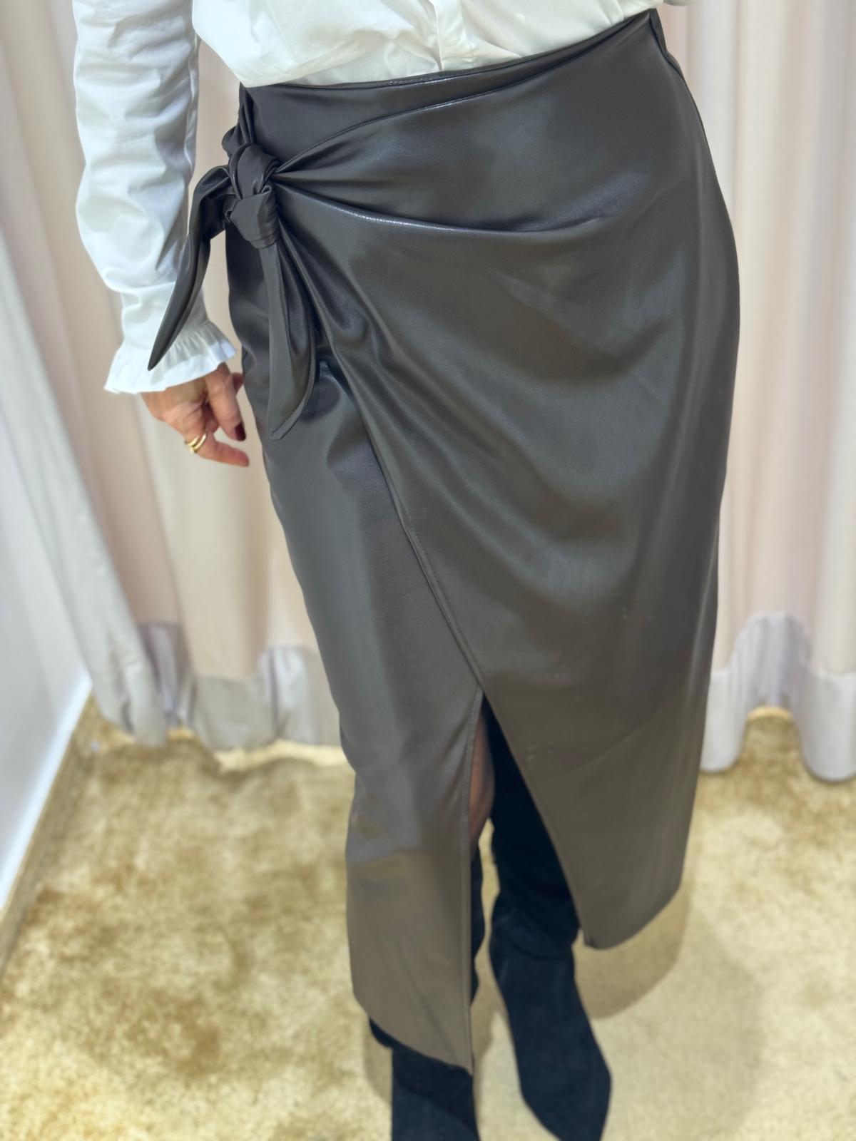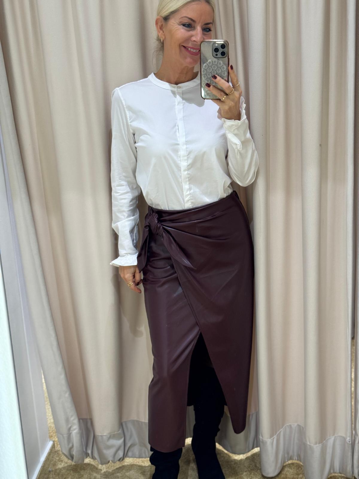 Ein veganer Leder-Liebling mit Twist: Der Wickelrock in sattem Burgundo überzeugt mit edlem Glanz, raffiniertem Knoten-Detail und einer femininen Silhouette. Mit Stiefeln, Heels oder Sneakern – er macht jedes Outfit besonders.