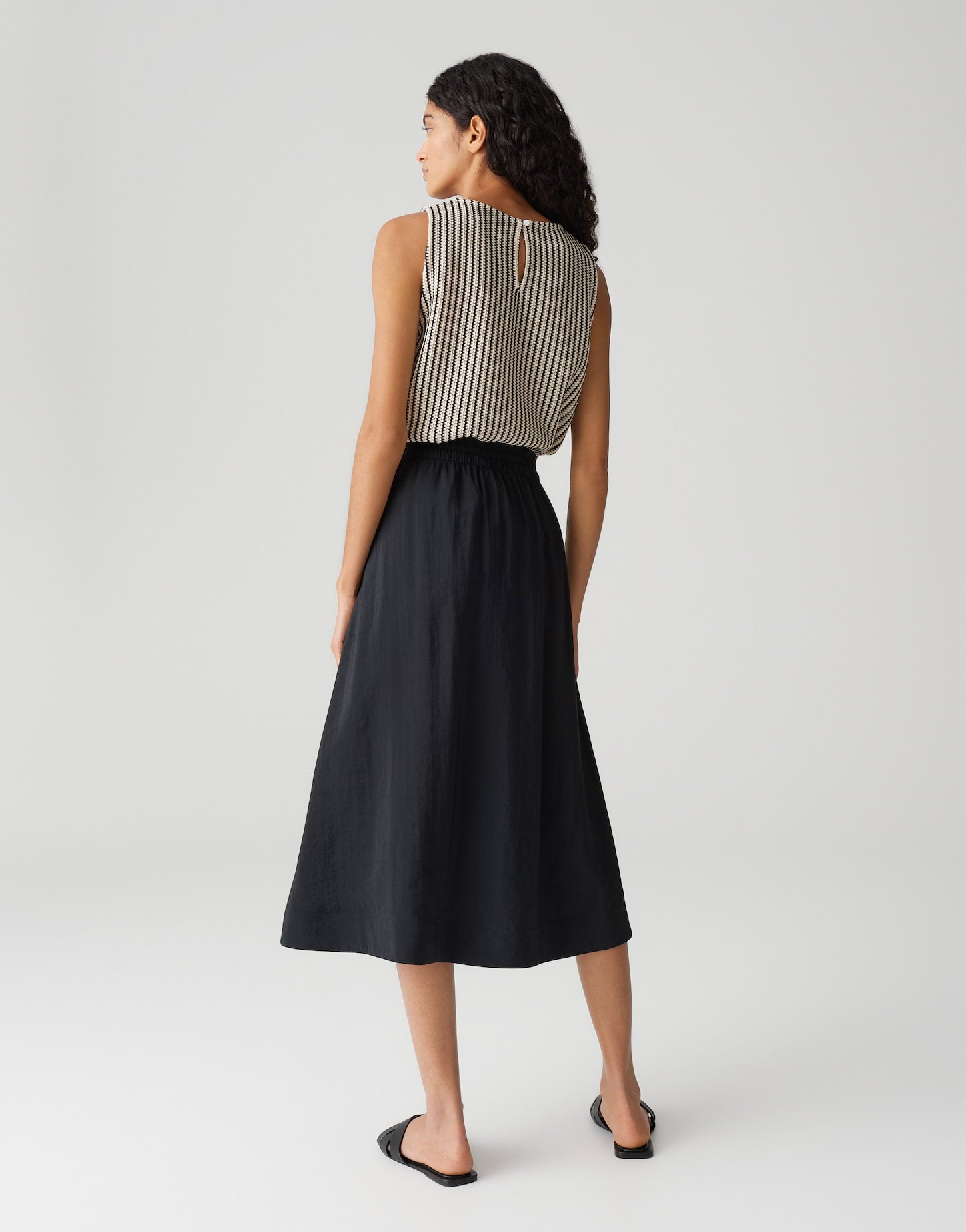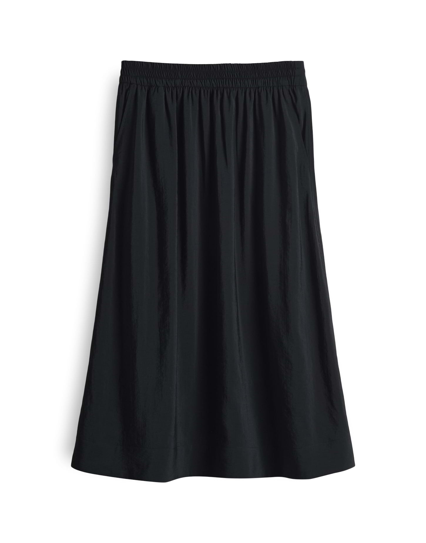 normale Passform, A-Linie, Midi-Länge, hintere Länge ca. 81 cm in Größe 36, Model Größe 176 cm – trägt Größe 36, Webware, ungefüttert, weicher Griff, fließender Fall, matter Glanz in der Oberfläche, schräge Eingrifftaschen, abgesteppte Teilungsnaht hinten, breiter Gummibund in der Taille