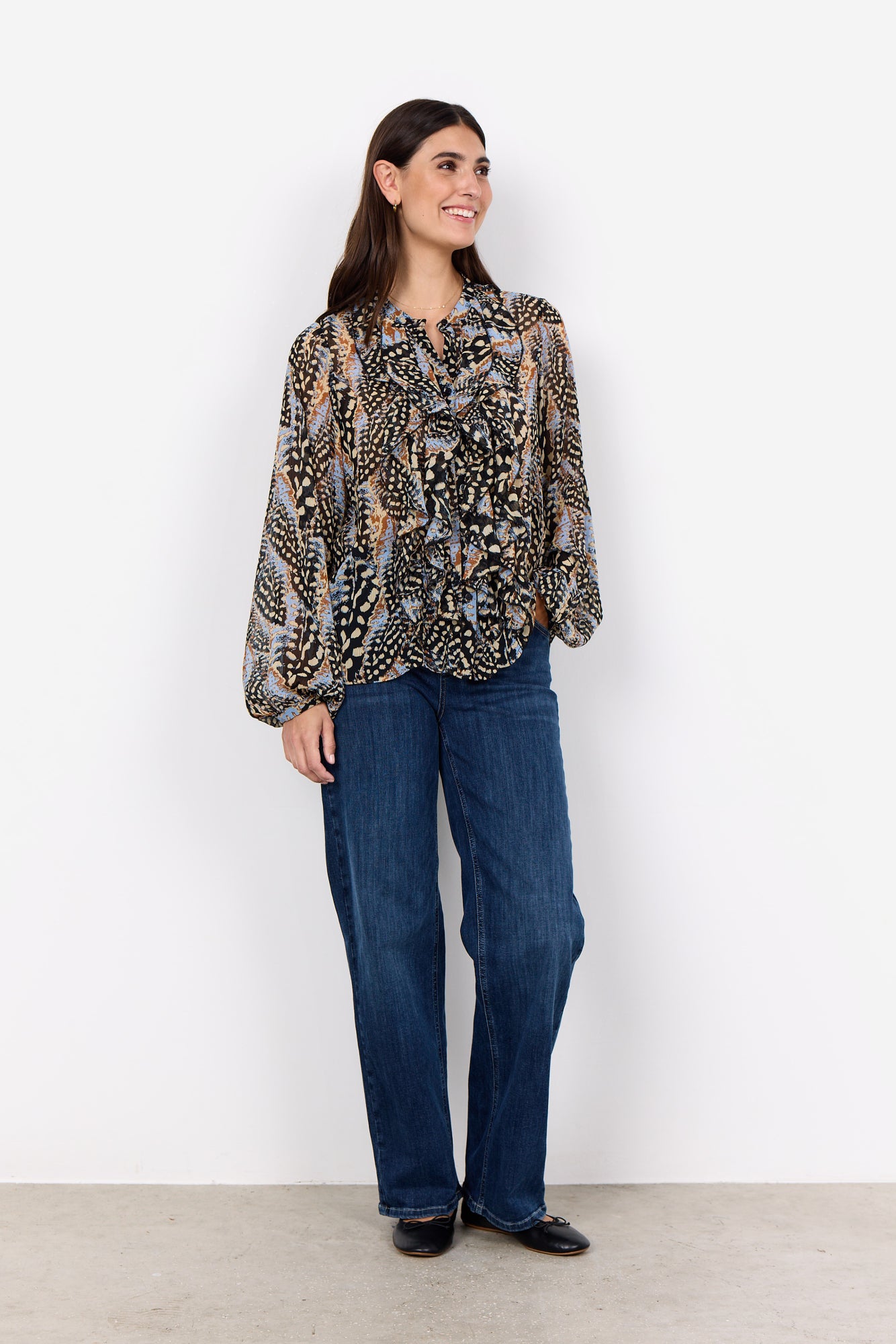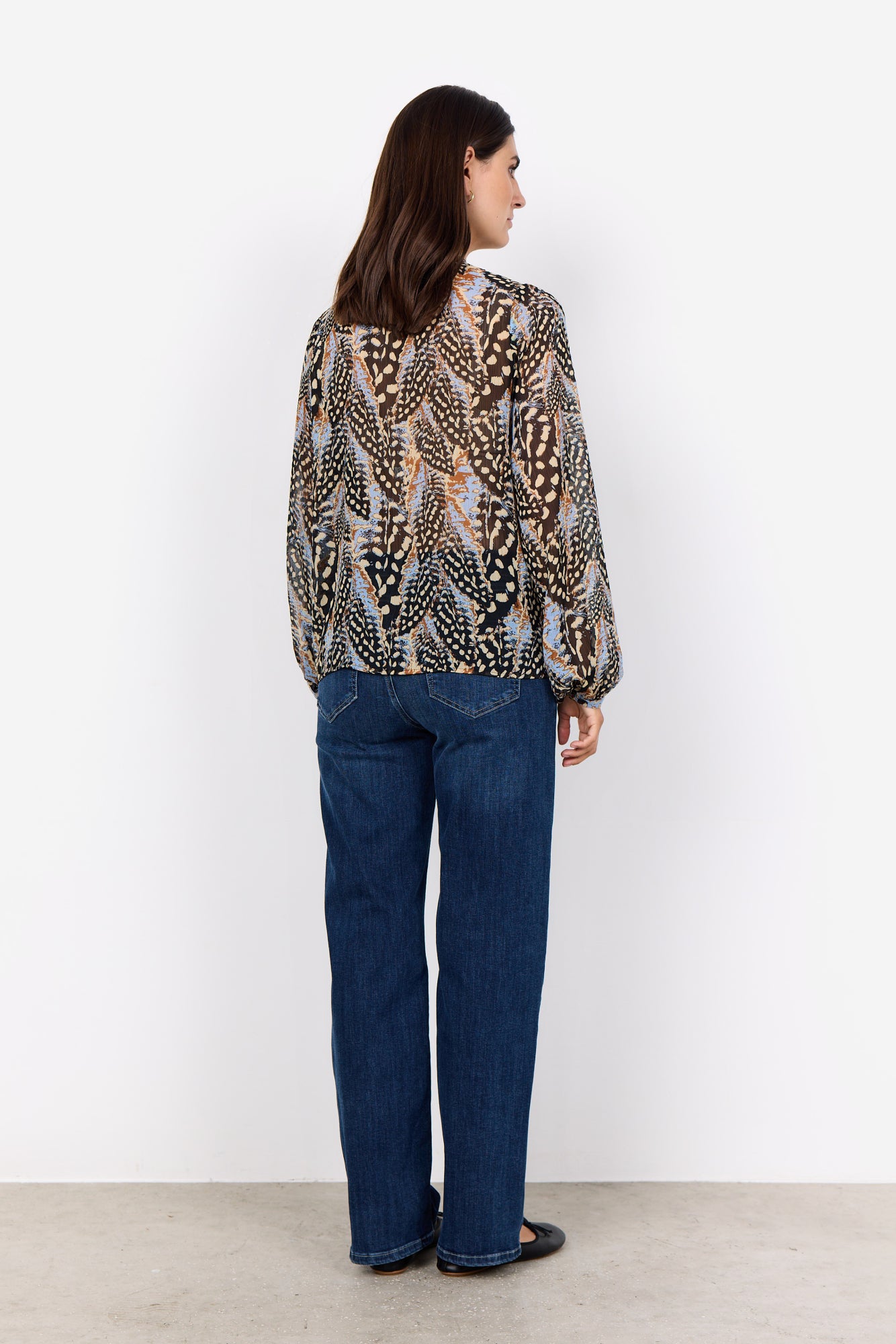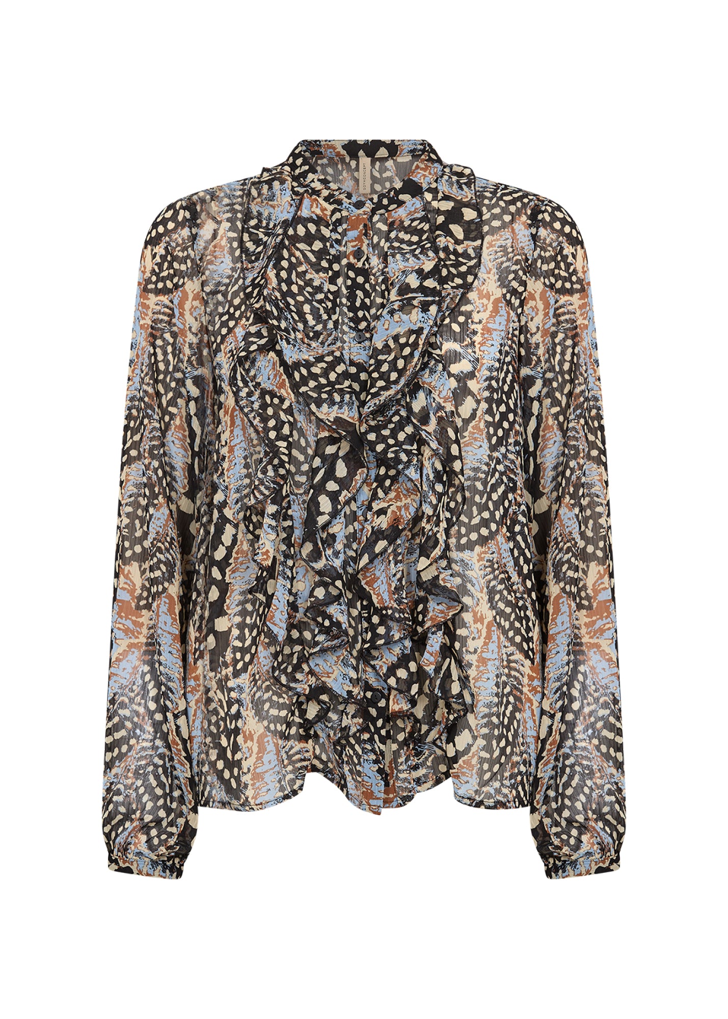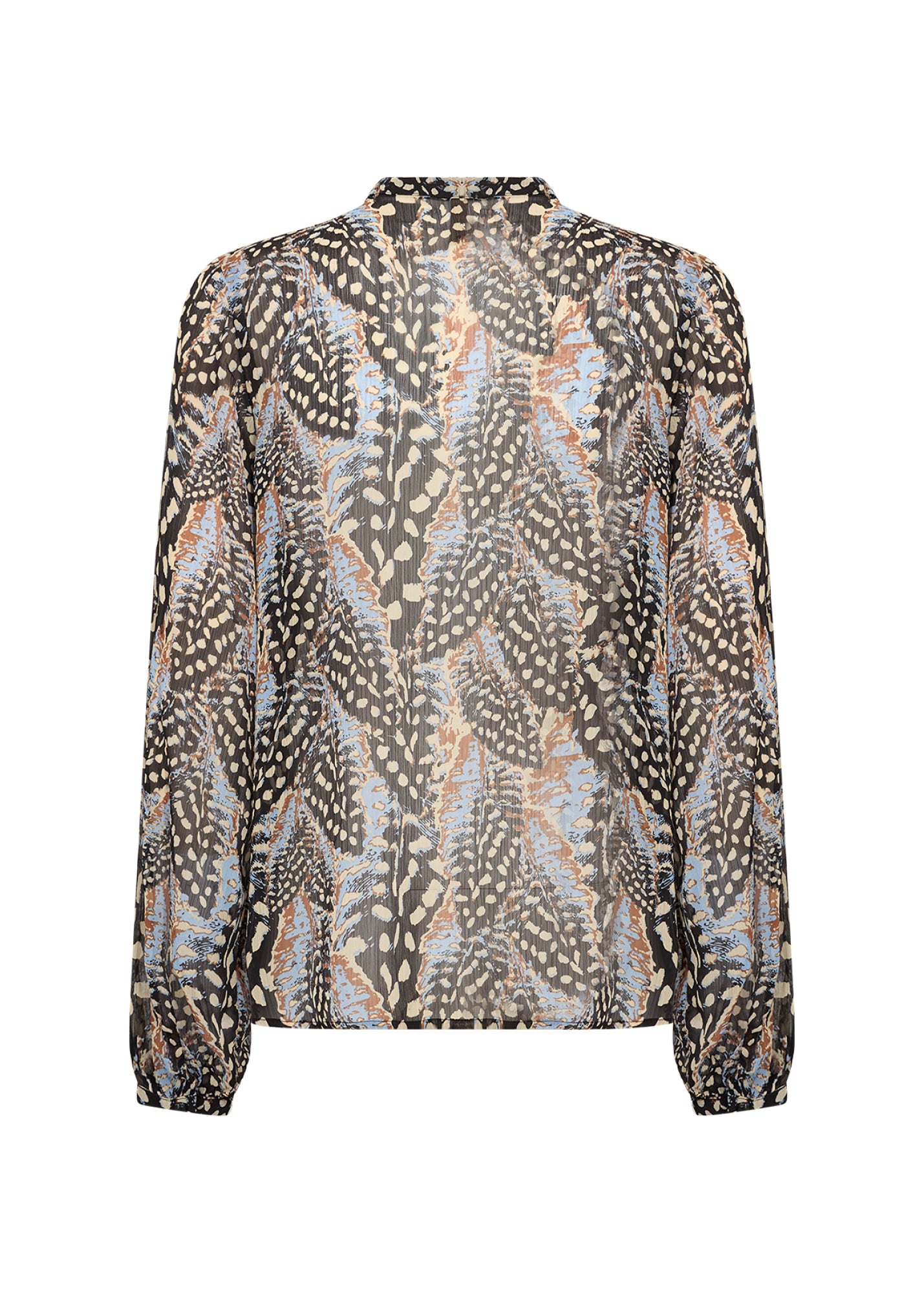 SC-PIRIL 2 ist ein Shirt aus 100% recyceltem Polyester. Dieses Oberteil hat einen gerüschten Ausschnitt, eine Knopfleiste, lange Ärmel und einen abstrakten Druck. Kombinieren Sie es mit einer maßgeschneiderten Hose oder einem eleganten Rock.