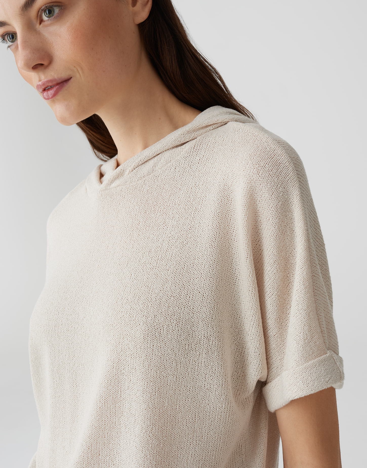 lockere Passform, gerader Schnitt, normale Länge, überschnittener Halbarm, Kapuze, Rückenlänge ca. 56 cm bei Größe 36, Model Größe 178 cm – trägt Größe 36, Jersey, Strick Optik, natürlicher Griff, fließender Fall, leichte Transparenz, kleine Schlitze in den Seiten, Aufschlag am Ärmel