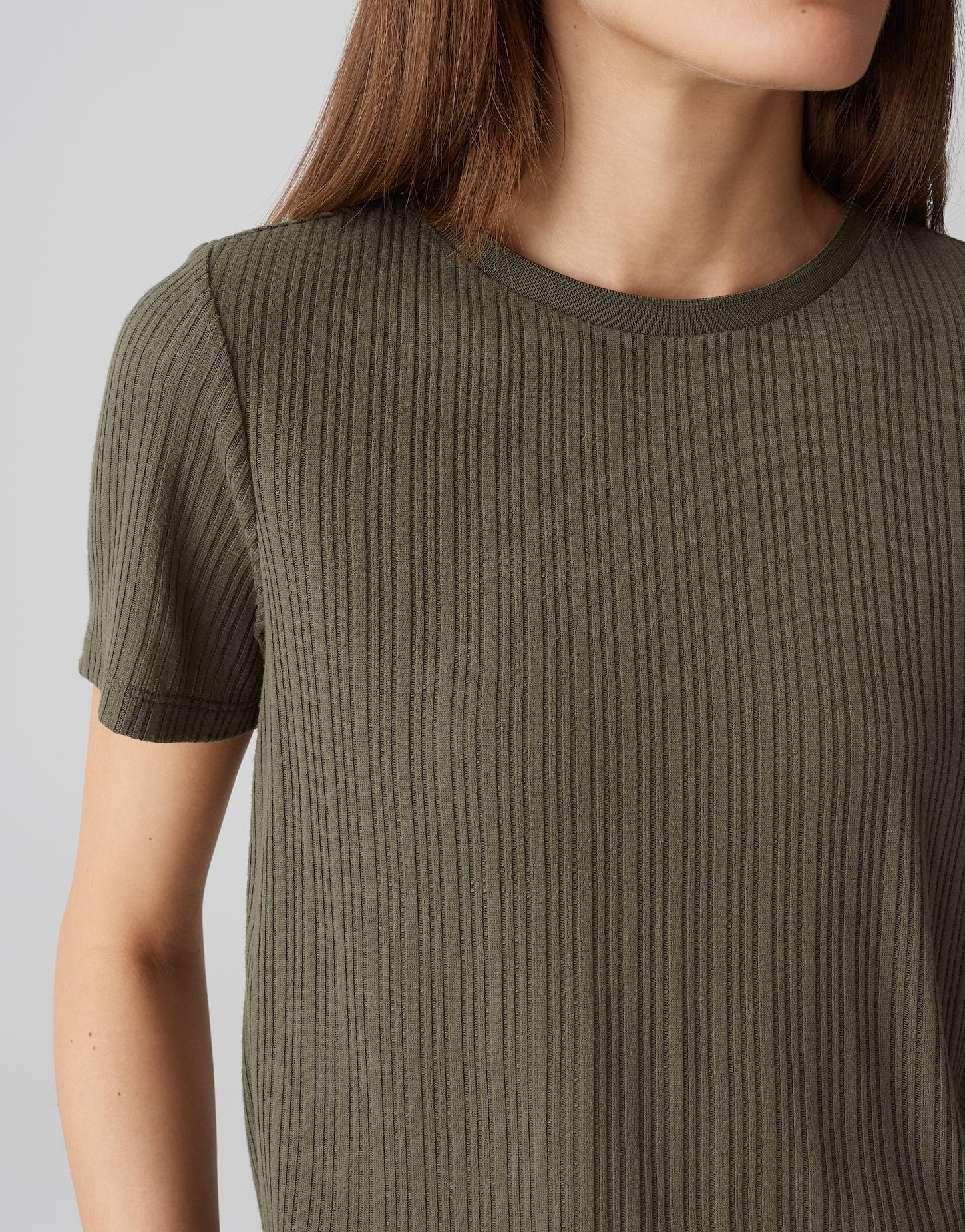 lockere Passform, gerader Schnitt, normale Länge, Kurzarm, Rundhalsausschnitt, Rückenlänge ca. 58 cm bei Größe 36, Model Größe 177 cm – trägt Größe 36, ECOVERO™ Viskose Mix, Jersey, Rippstruktur, weicher Griff, elastischer Stoff, leichte Transparenz, leicht fließend, Rippbündchen am Halsloch