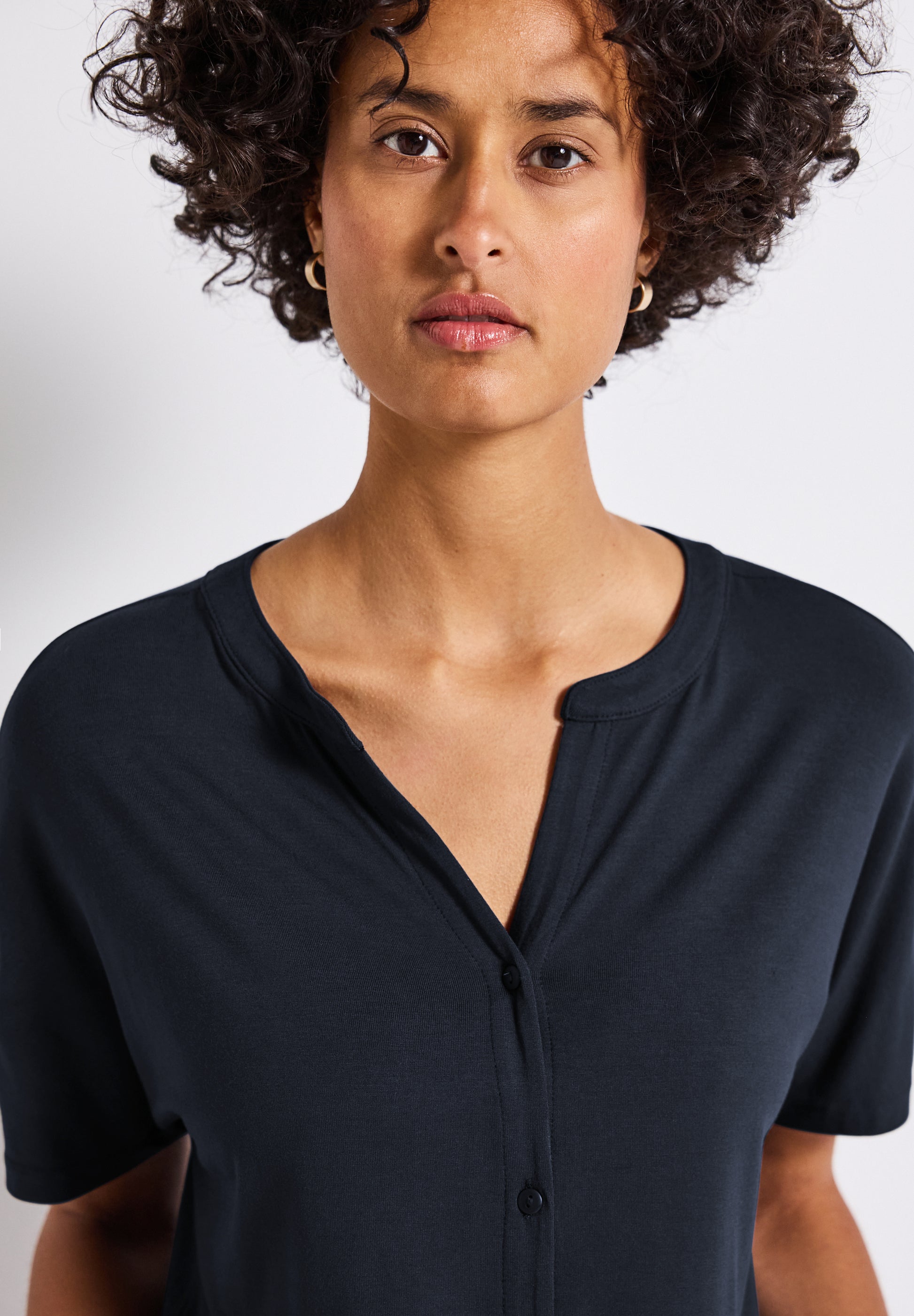 Lässig und feminin – dieses Shirt im Tunika-Look von Street One für Damen überzeugt mit Split Neck, Knopfleiste und sommerlichen Dropped Shoulders. Die softe Jersey-Qualität sorgt für ein rundum angenehmes Tragegefühl. Ein idealer Begleiter für entspannte Sommer-Looks mit modischem Flair. Sommershirt Split Neck Knopfleiste Dropped Shoulders Angenehme Jersey-Qualität Material: 95% Viskose, 5% Elasthan