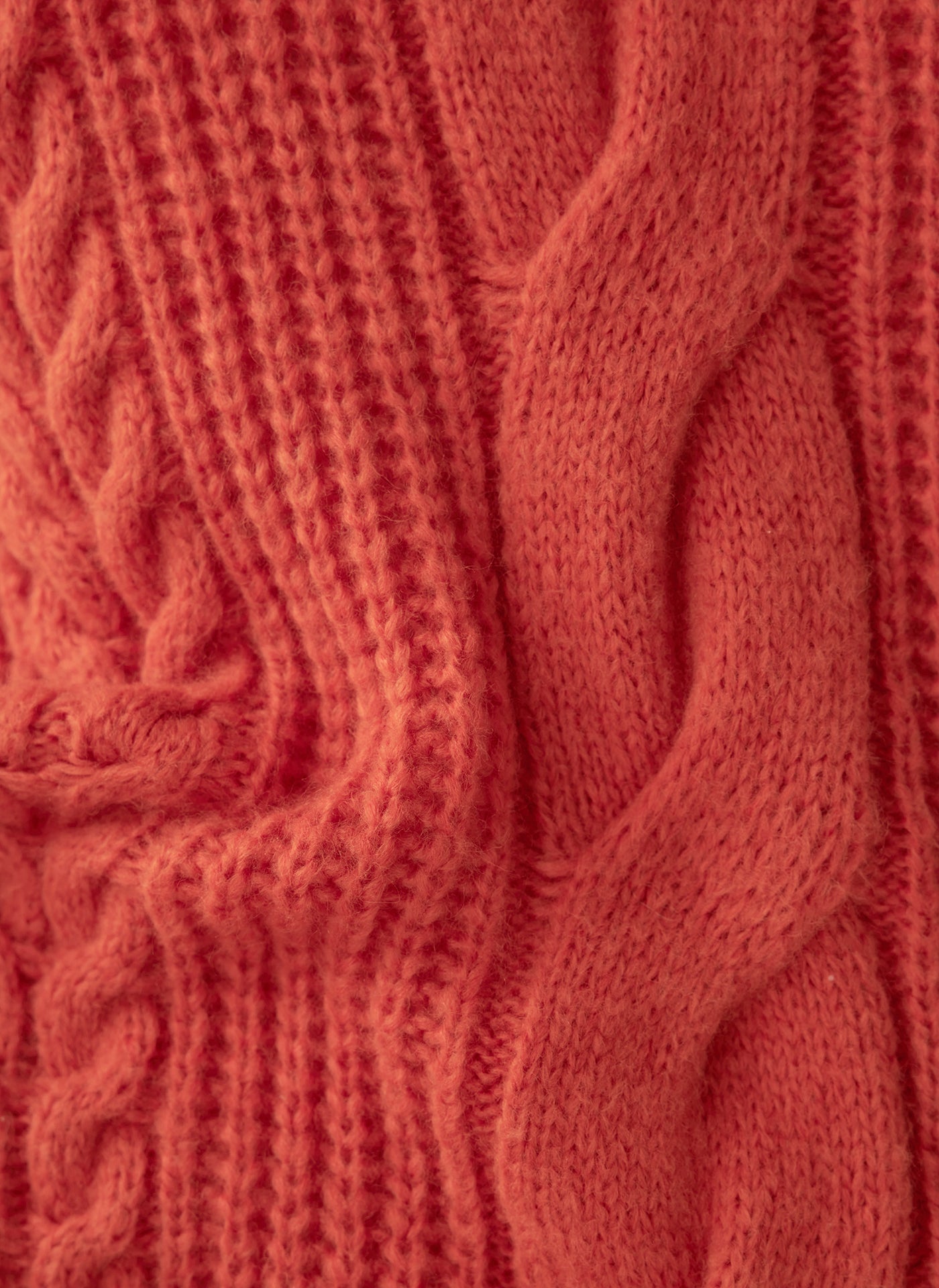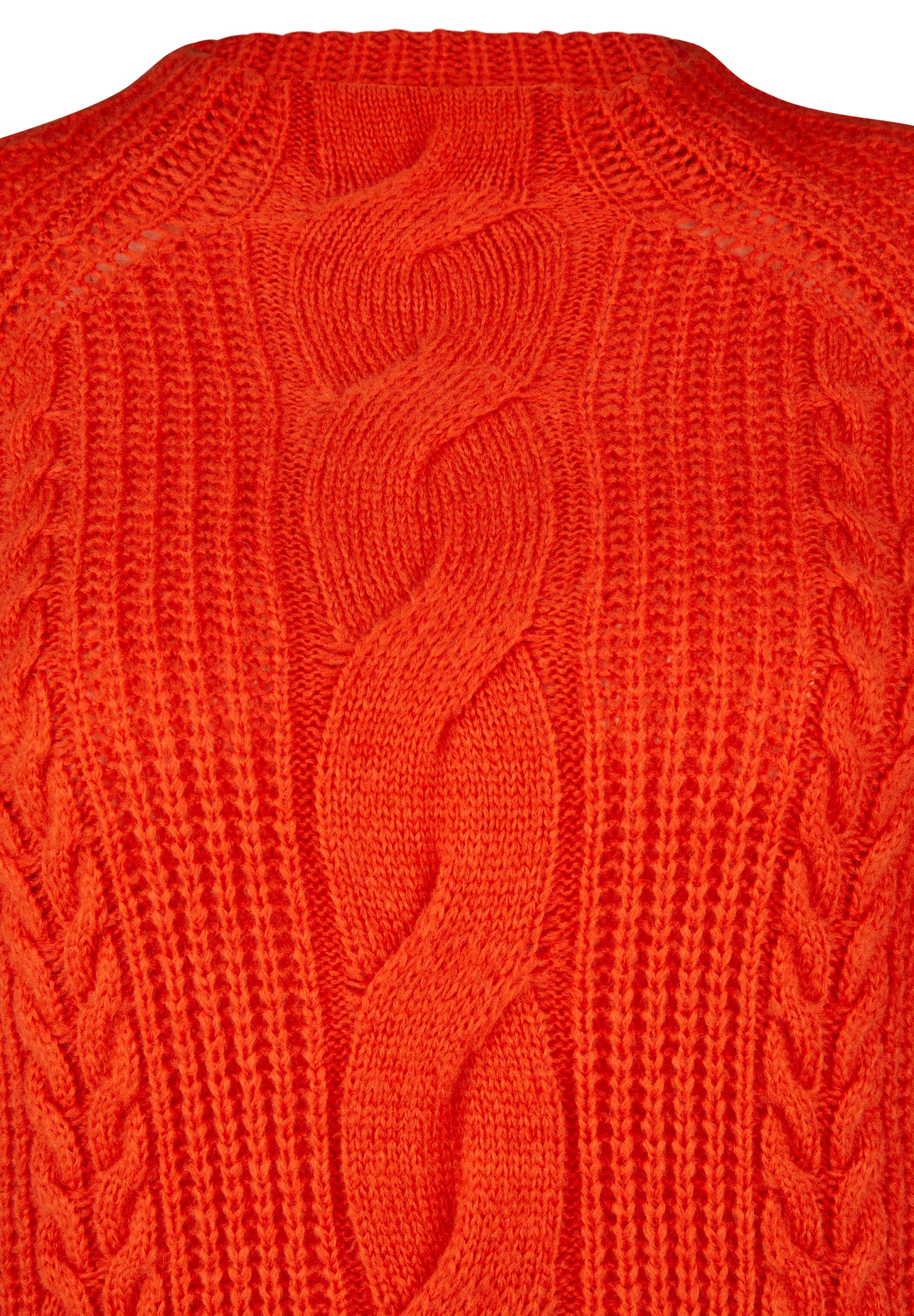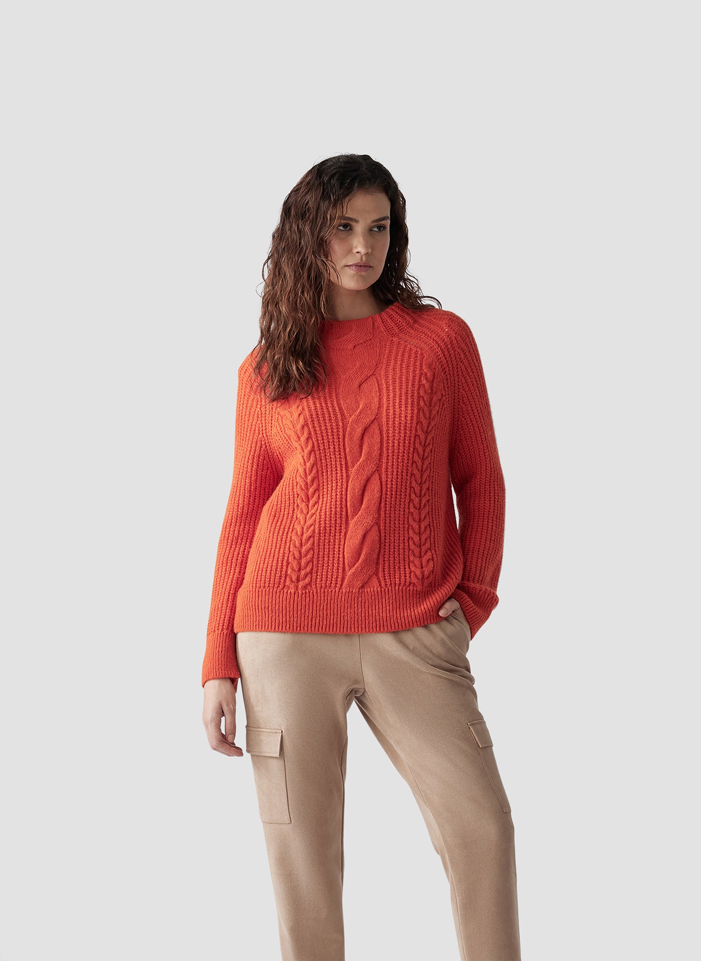 Stylischer Zopfstrick-Pullover in leuchtendem Orange _ Dieser Pullover kombiniert klassisches Zopfstrick-Design mit einer modernen, frischen Farbe und bringt Wärme und Stil in jeden Look. Klassisches Design für zeitlose Eleganz und Struktur. Ein lebendiger Farbton, der jedem Outfit eine frische Note verleiht. Angenehm und wärmend, ideal für kalte Tage. Gerippte Abschlüsse _ An Saum und Ärmeln für eine optimale Passform. Rundhalsausschnitt _ Vielseitig kombinierbar für einen lässigen oder eleganten Look.